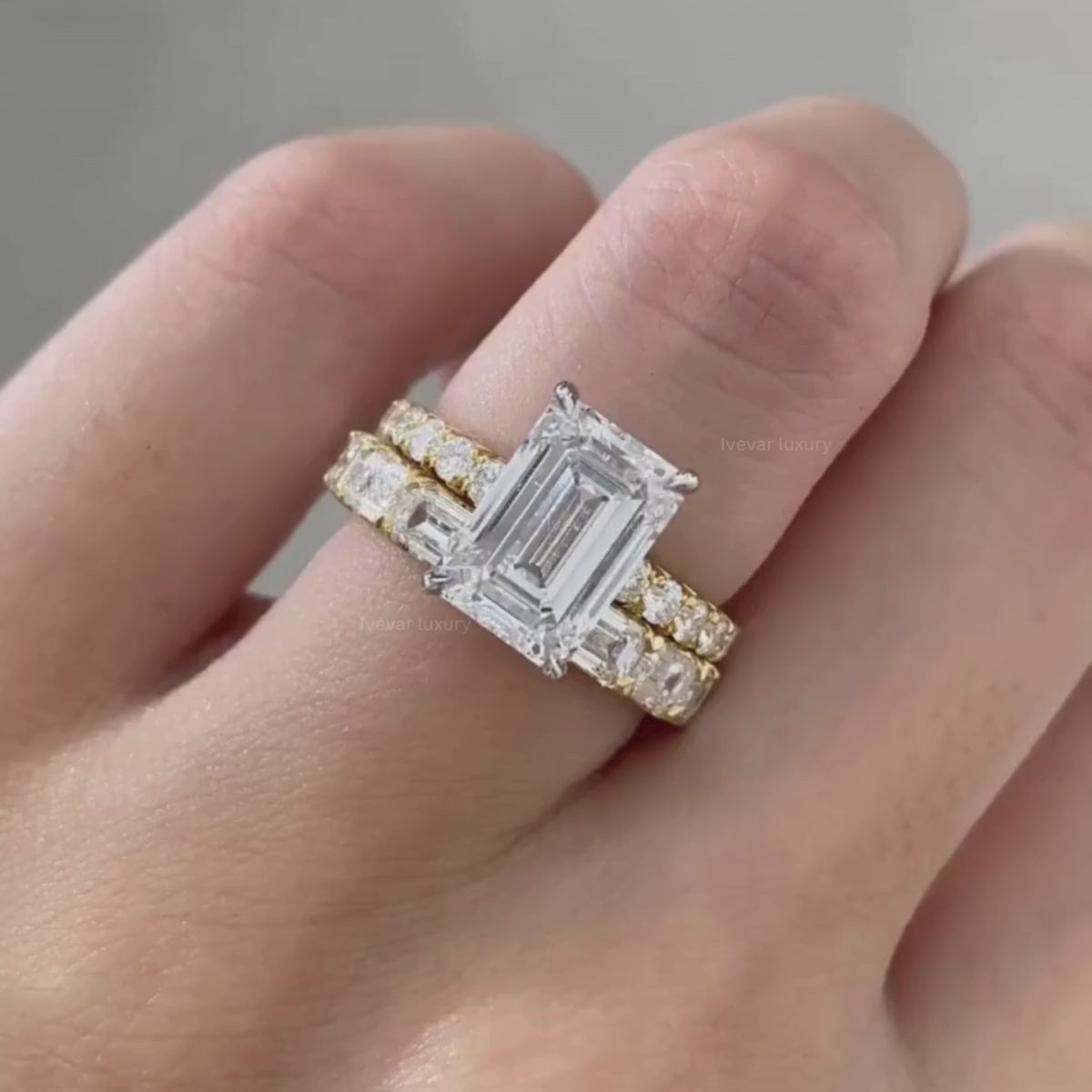 This stunning ring set features a striking emerald-cut diamond celebrated for its clean lines and hall-of-mirrors brilliance. The engagement ring is accented with a delicate pavé diamond band, while the perfectly matched wedding ring adds continuous sparkle and symmetry. Crafted in warm , this set blends modern sophistication with timeless elegance. A beautiful symbol of love, unity, and forever commitment, designed to shine for a lifetime.