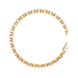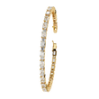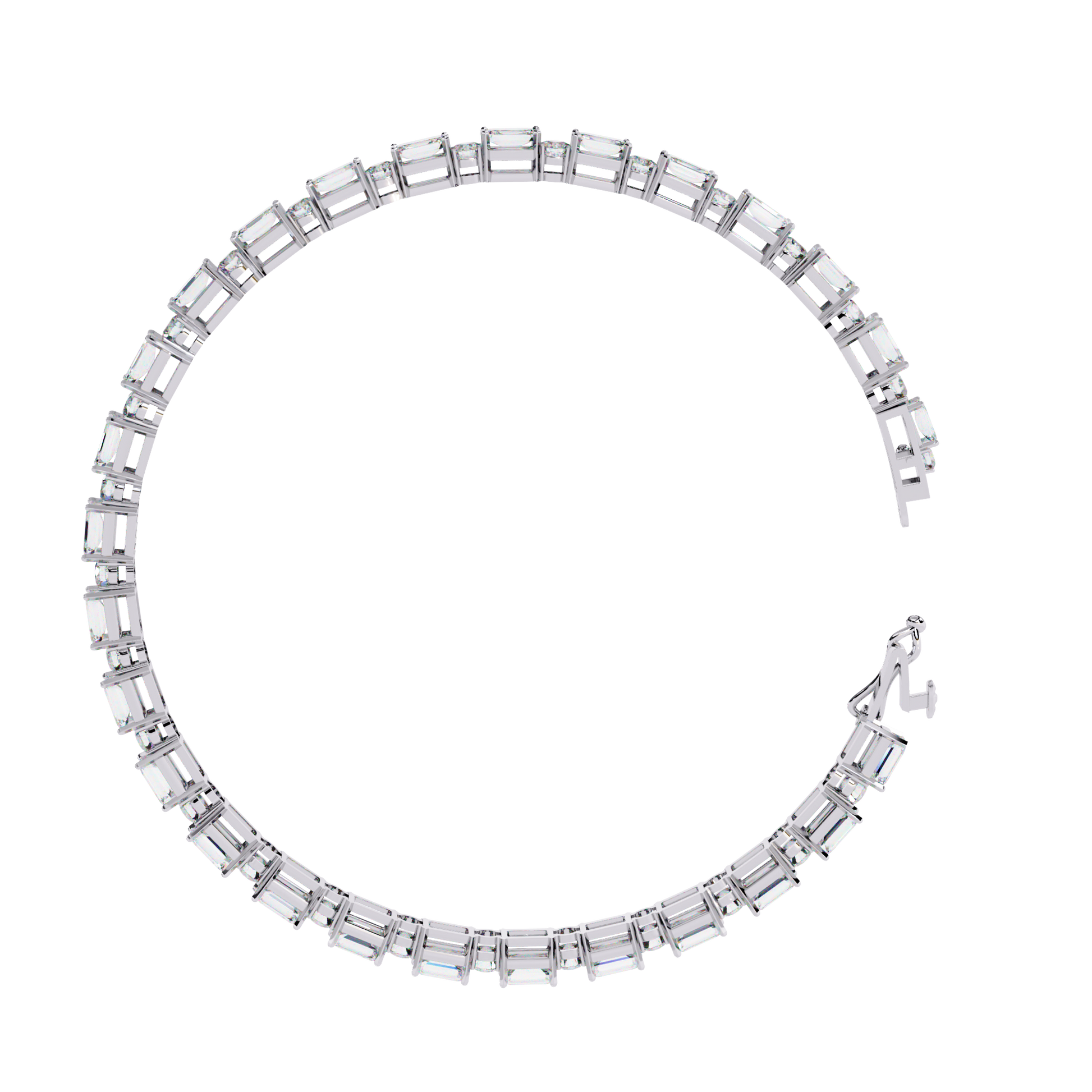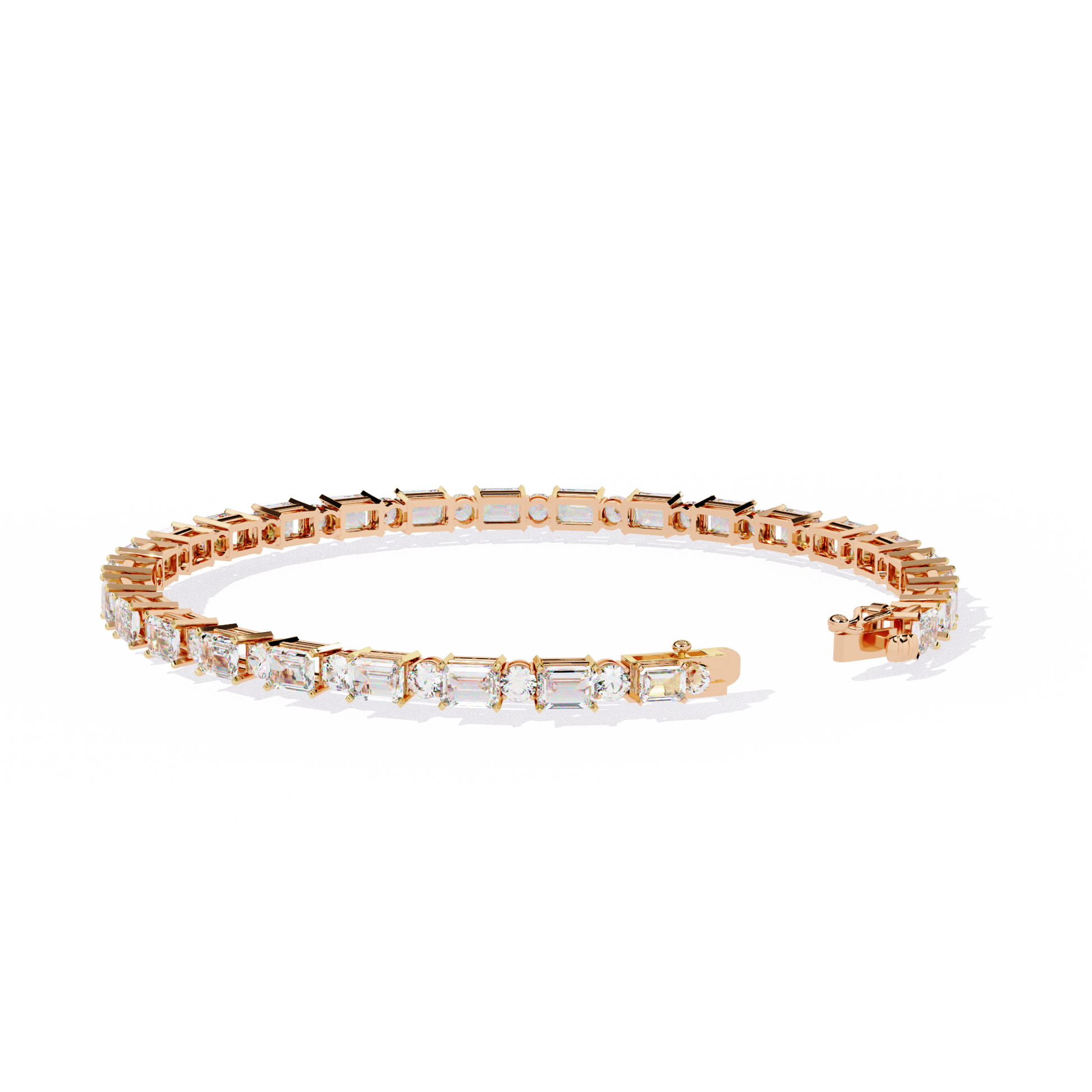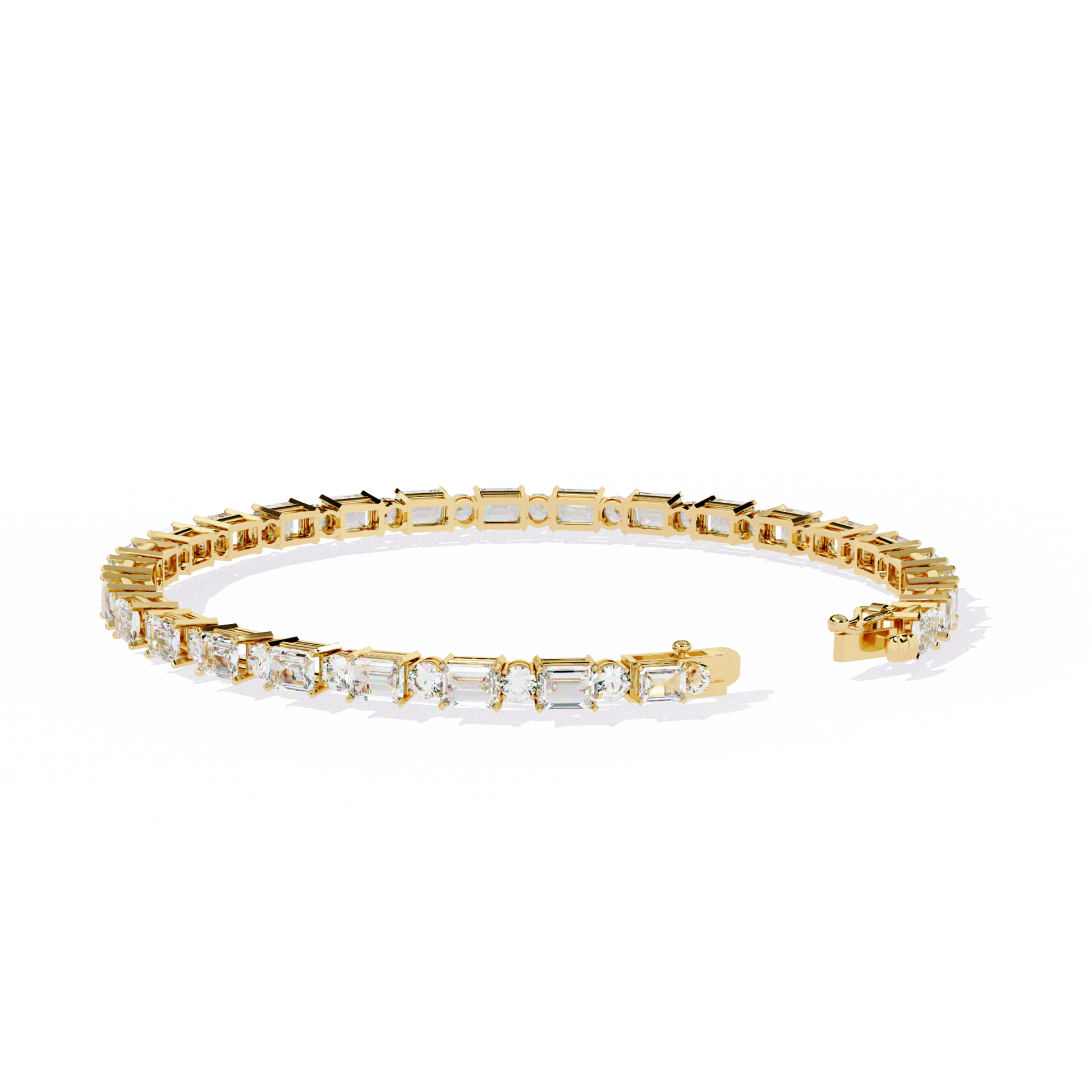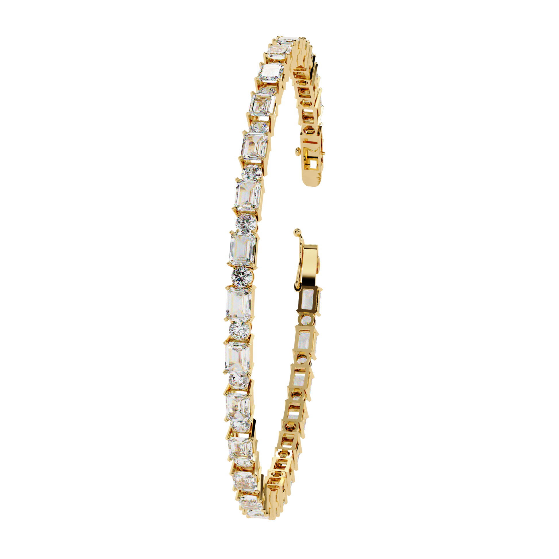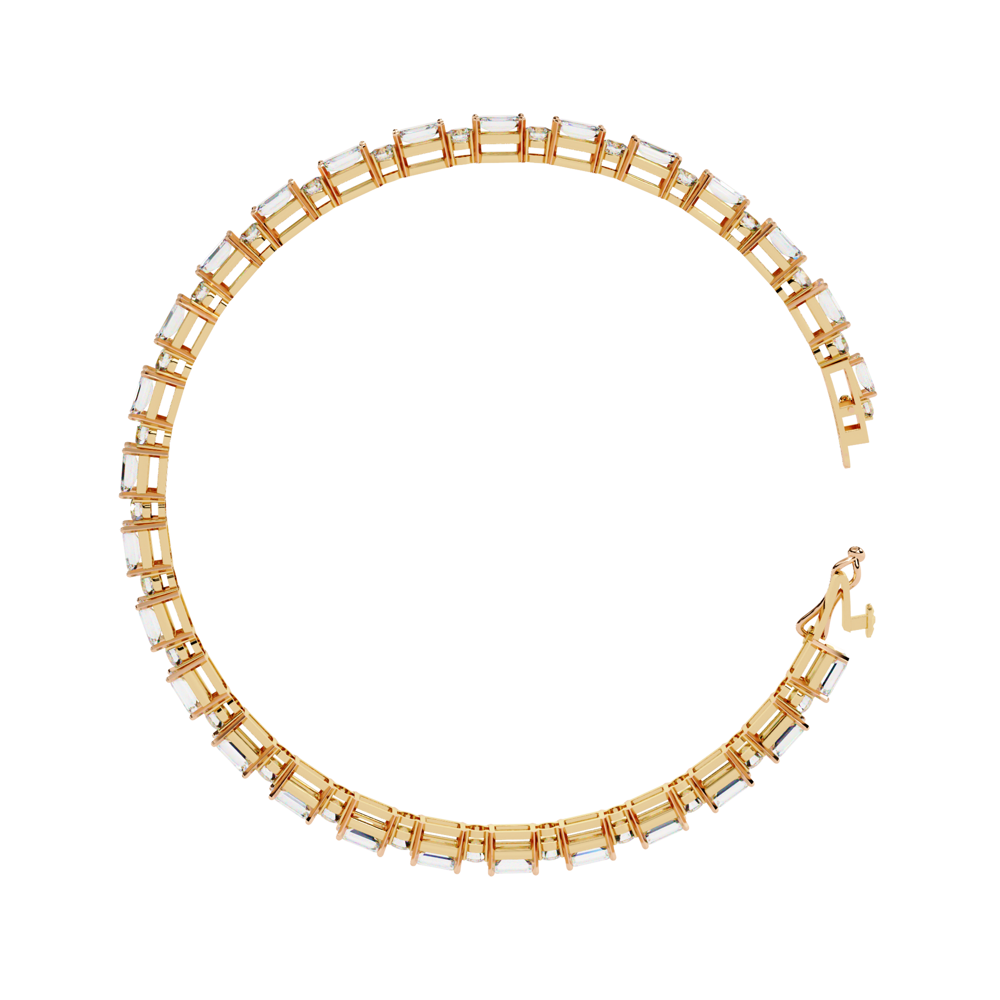 This elegant bracelet features a stunning line of emerald-cut diamonds set in yellow gold, exuding luxury and sophistication. The precise geometric cuts of each diamond capture and reflect light beautifully, creating an aura of brilliance. Designed for graceful comfort and lasting beauty, this piece is perfect for special occasions or as a statement of refined style.