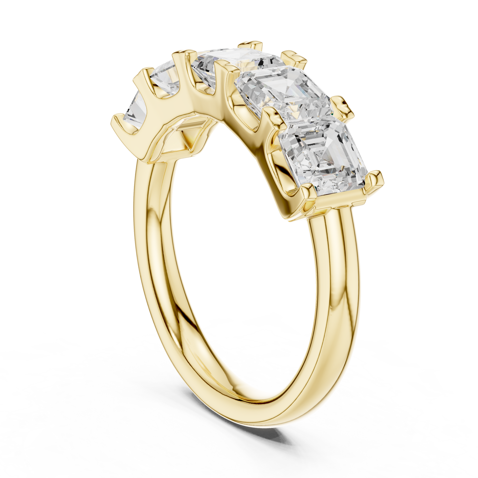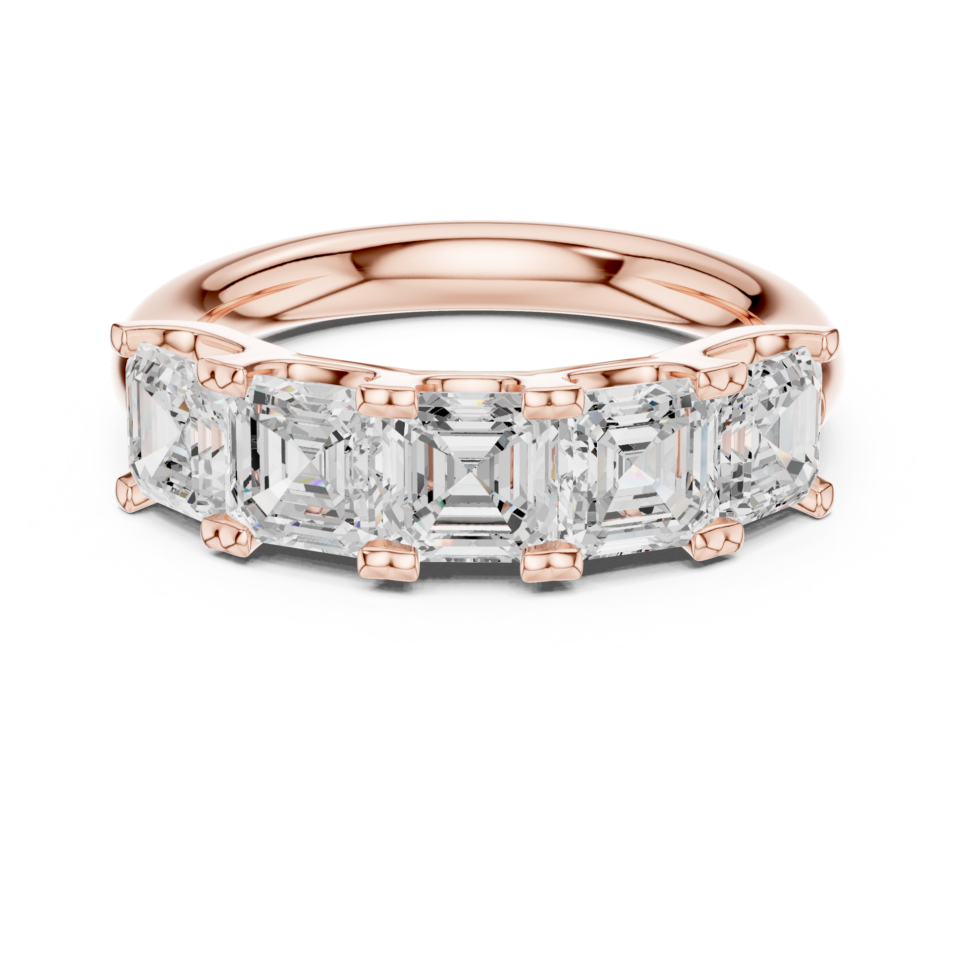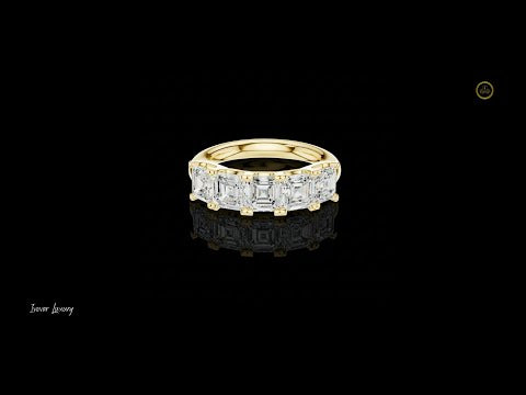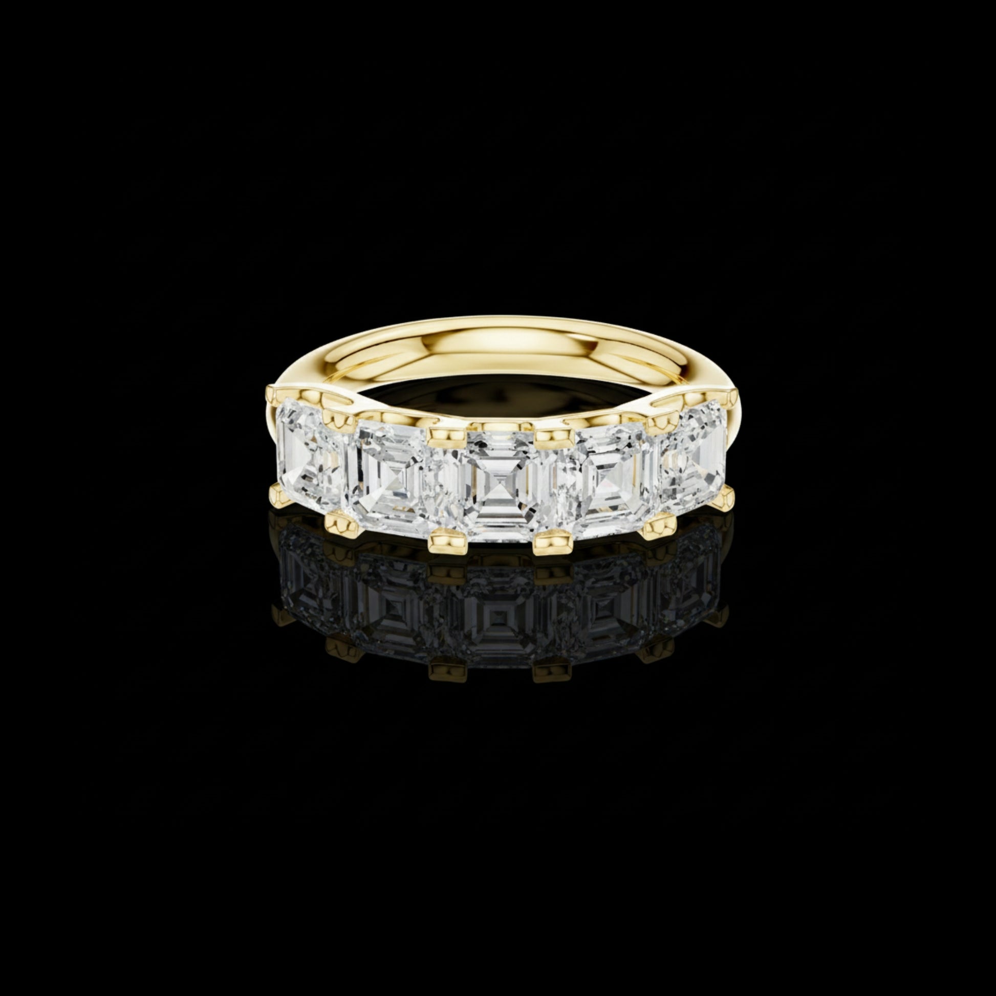 This stunning diamond band features five beautifully matched asscher-cut diamonds arranged in a continuous step-cut brilliance design. Set in a polished gold band, the ring blends modern elegance with timeless sophistication. The elongated facets of the asscher-cut stones create a hall-of-mirrors sparkle, making this piece perfect for anniversaries, wedding bands, stacking, or luxurious everyday wear. A truly radiant and bold statement of refined style.