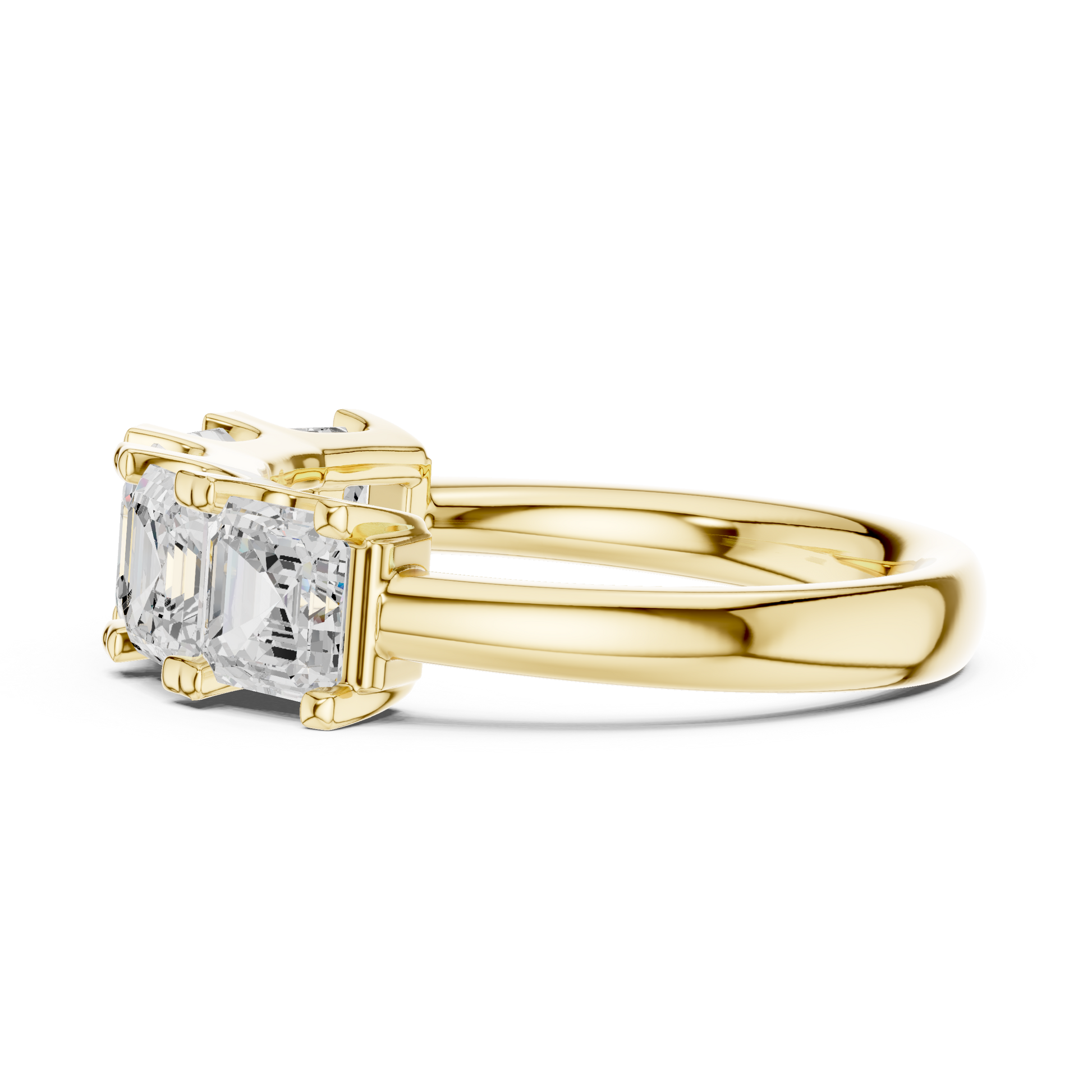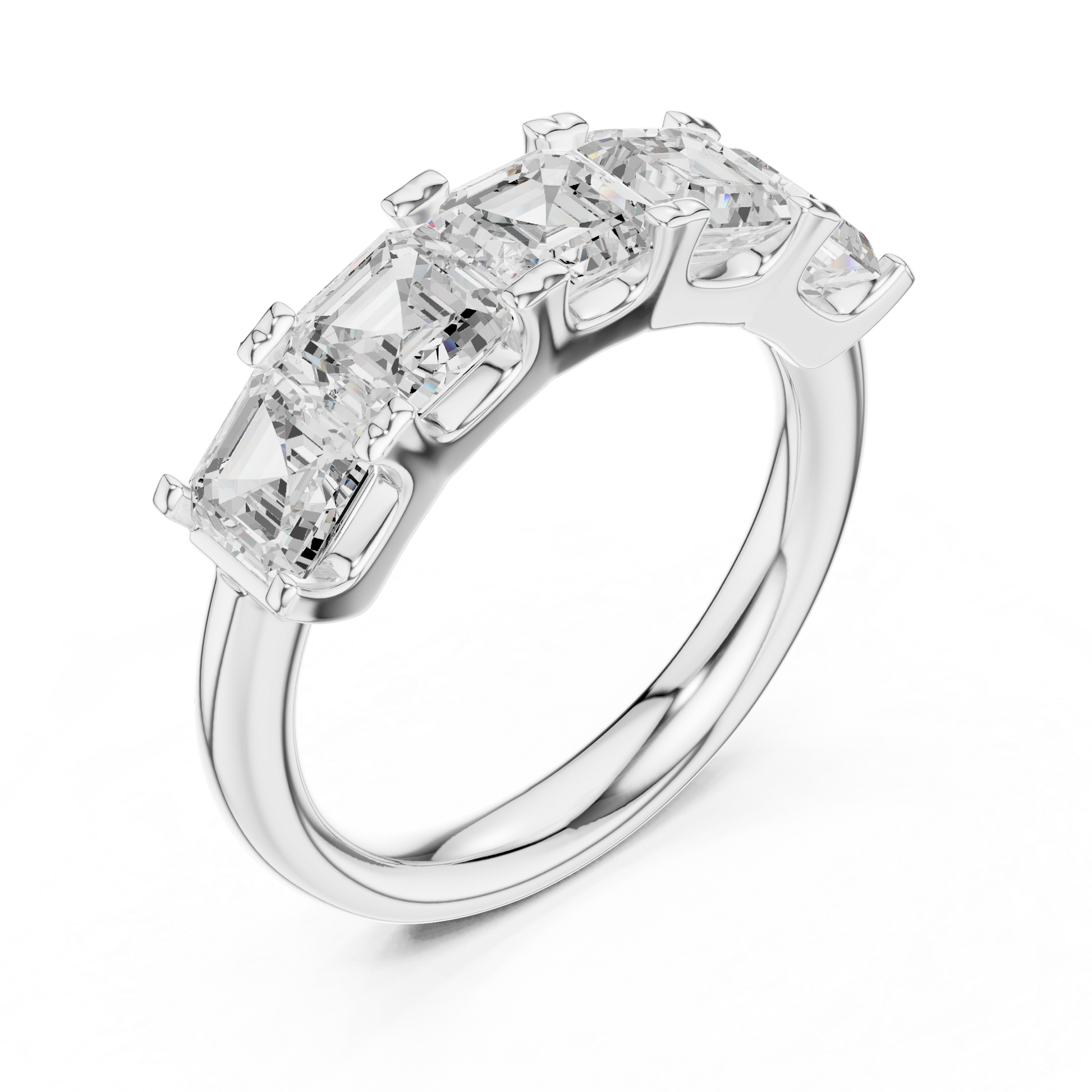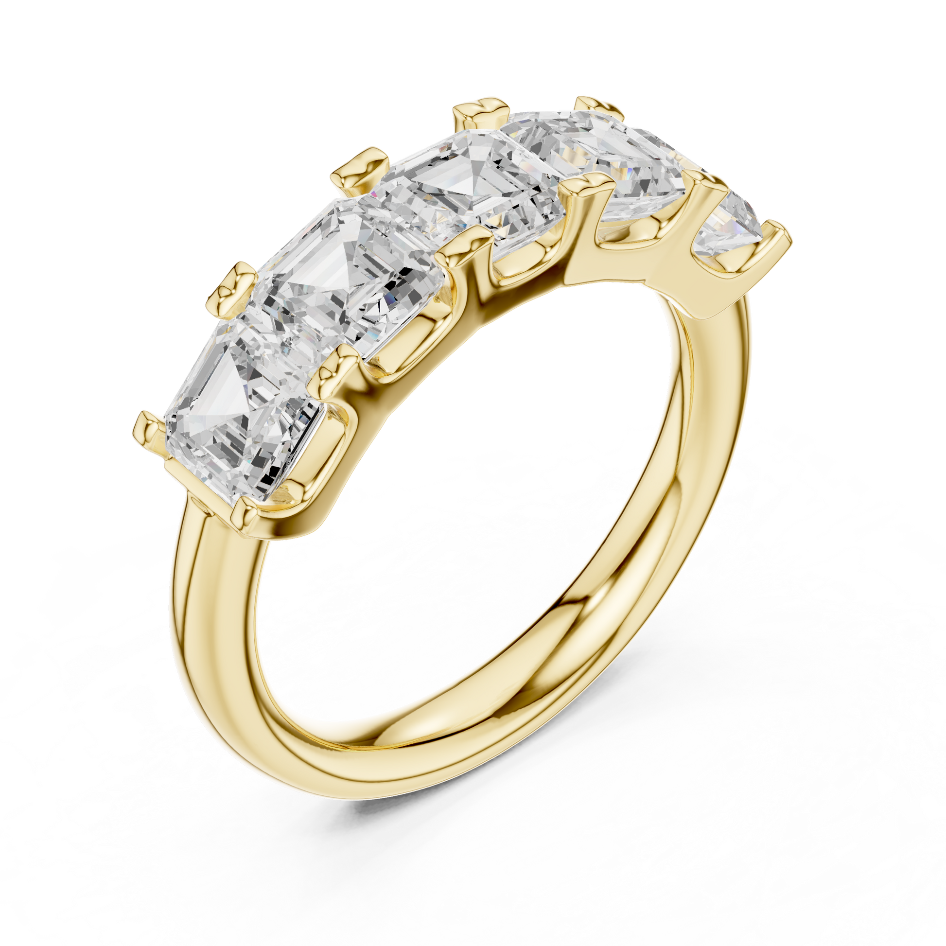 This stunning diamond band features five beautifully matched asscher-cut diamonds arranged in a continuous step-cut brilliance design. Set in a polished gold band, the ring blends modern elegance with timeless sophistication. The elongated facets of the asscher-cut stones create a hall-of-mirrors sparkle, making this piece perfect for anniversaries, wedding bands, stacking, or luxurious everyday wear. A truly radiant and bold statement of refined style.