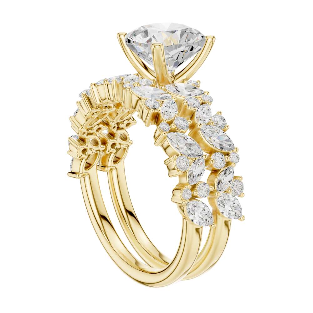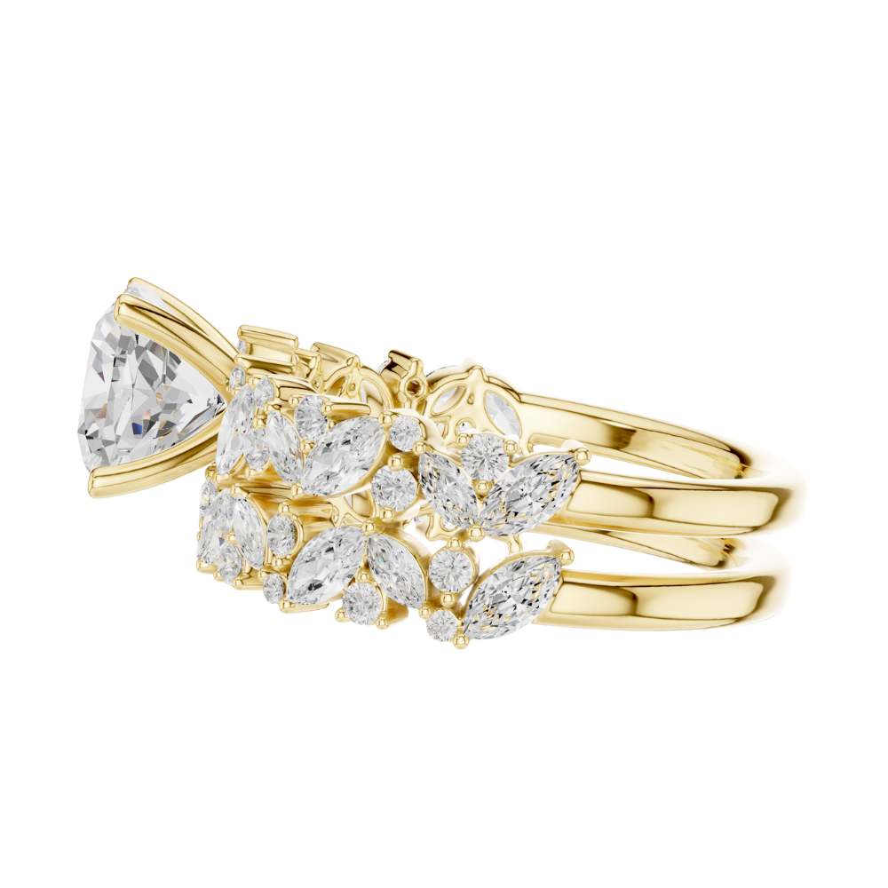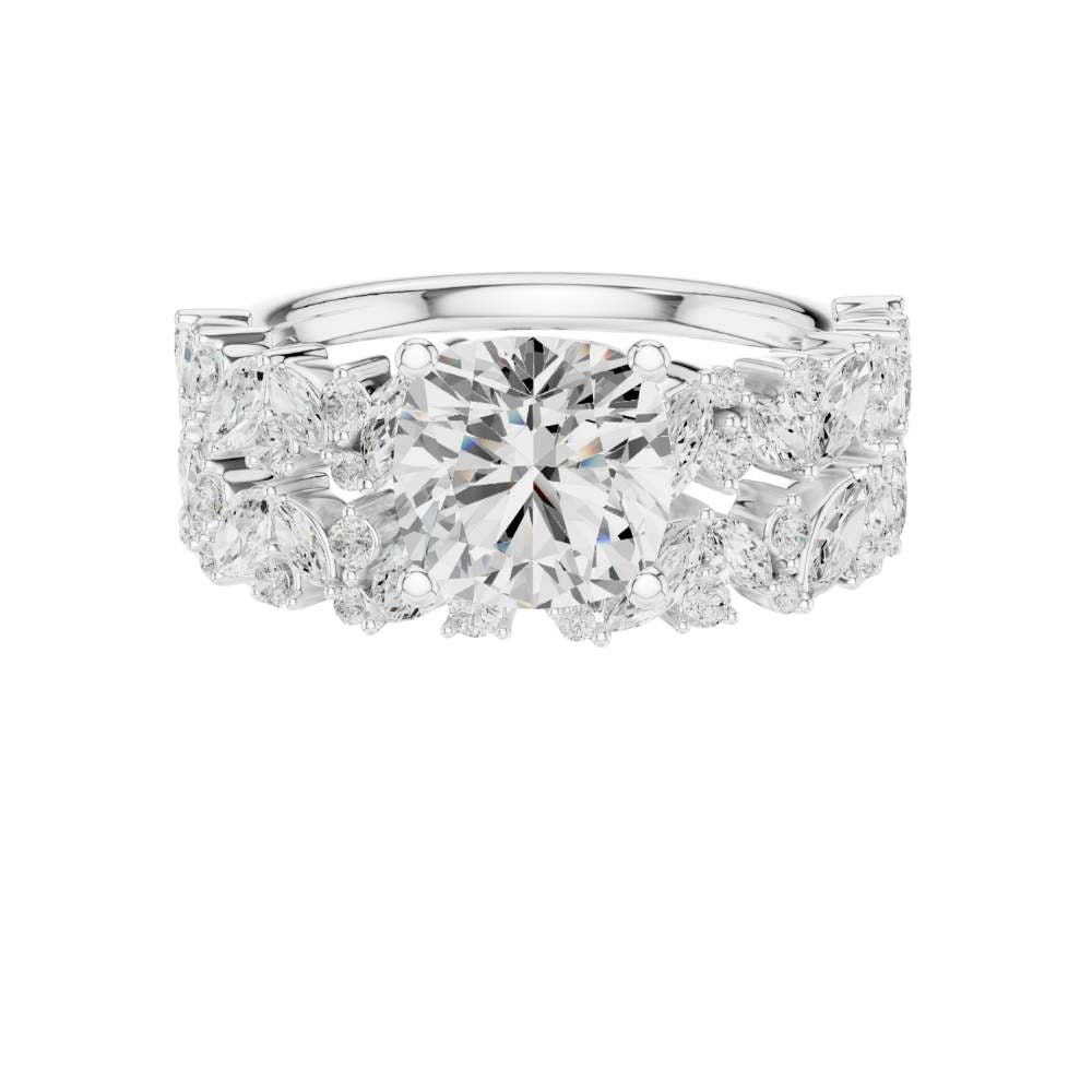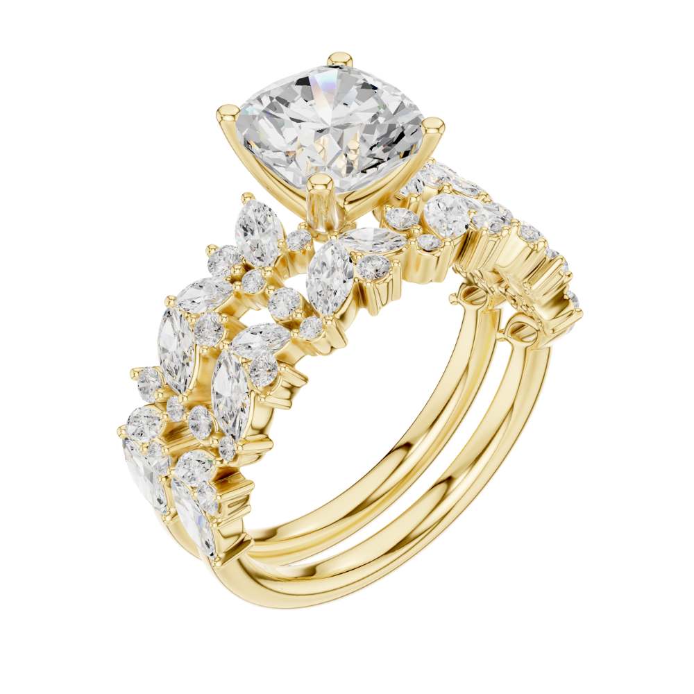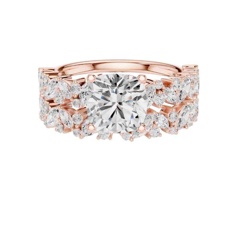 This exquisite ring features a dazzling cushion-cut diamond centerpiece surrounded by a breathtaking arrangement of marquise and round-cut diamonds set in warm gold. The intricate, nature-inspired design evokes the delicate beauty of a blooming garden, with the marquise stones artfully placed to resemble petals. The combination of brilliant cuts and detailed craftsmanship creates a luxurious statement piece that is both elegant and captivating, perfect for those seeking a bold yet refined expression of love and style.