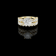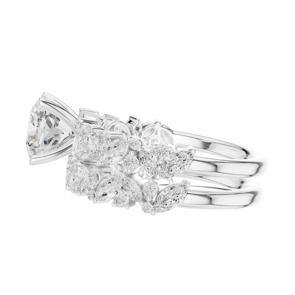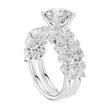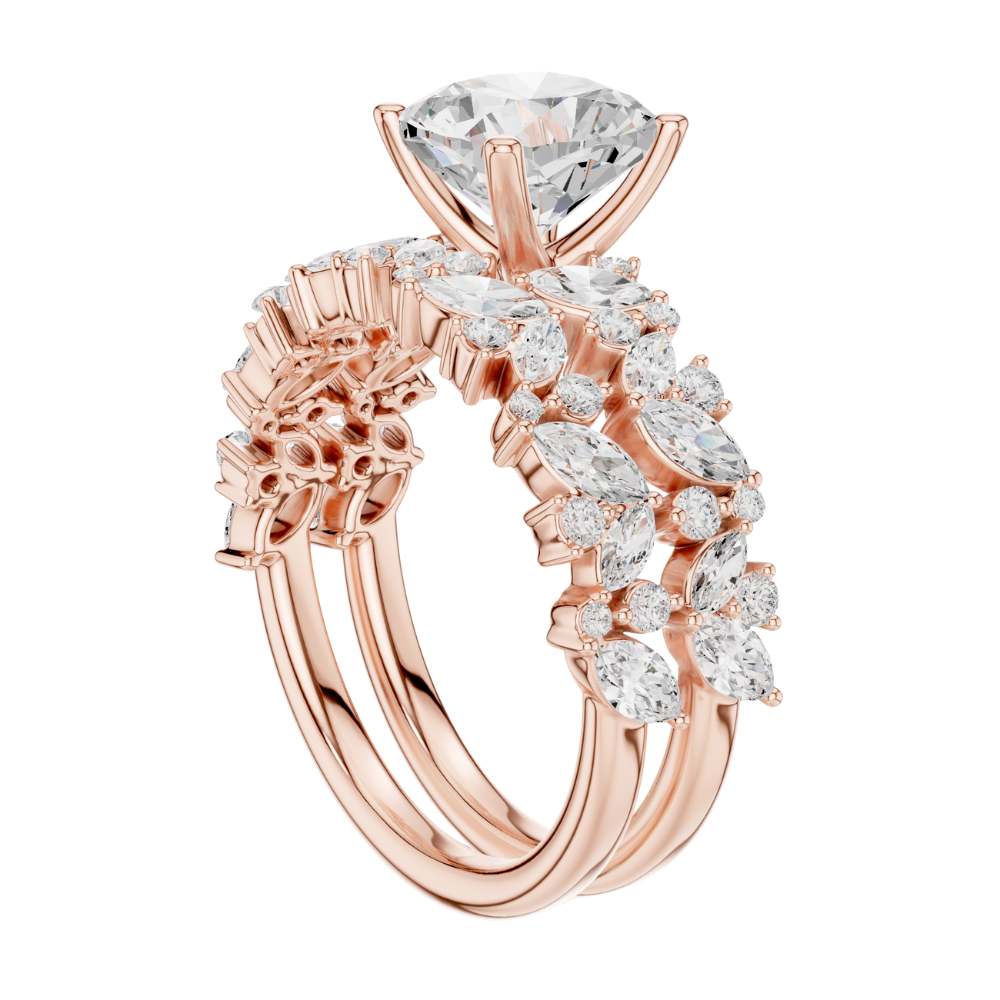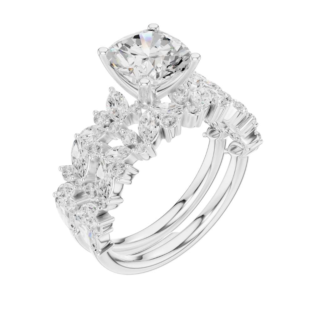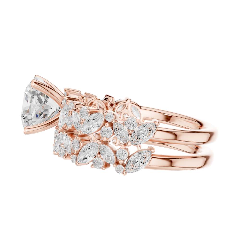 This exquisite ring features a dazzling cushion-cut diamond centerpiece surrounded by a breathtaking arrangement of marquise and round-cut diamonds set in warm gold. The intricate, nature-inspired design evokes the delicate beauty of a blooming garden, with the marquise stones artfully placed to resemble petals. The combination of brilliant cuts and detailed craftsmanship creates a luxurious statement piece that is both elegant and captivating, perfect for those seeking a bold yet refined expression of love and style.