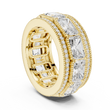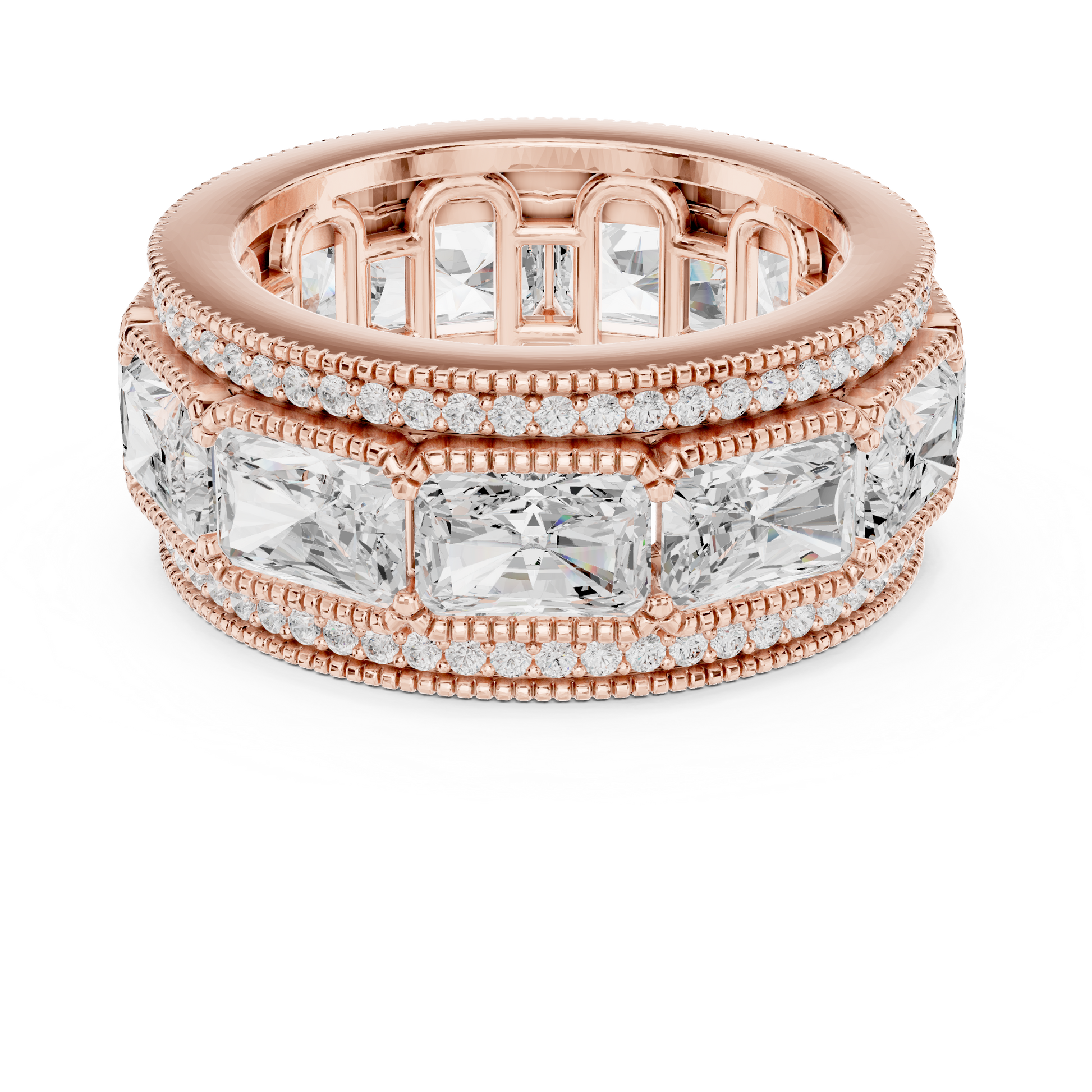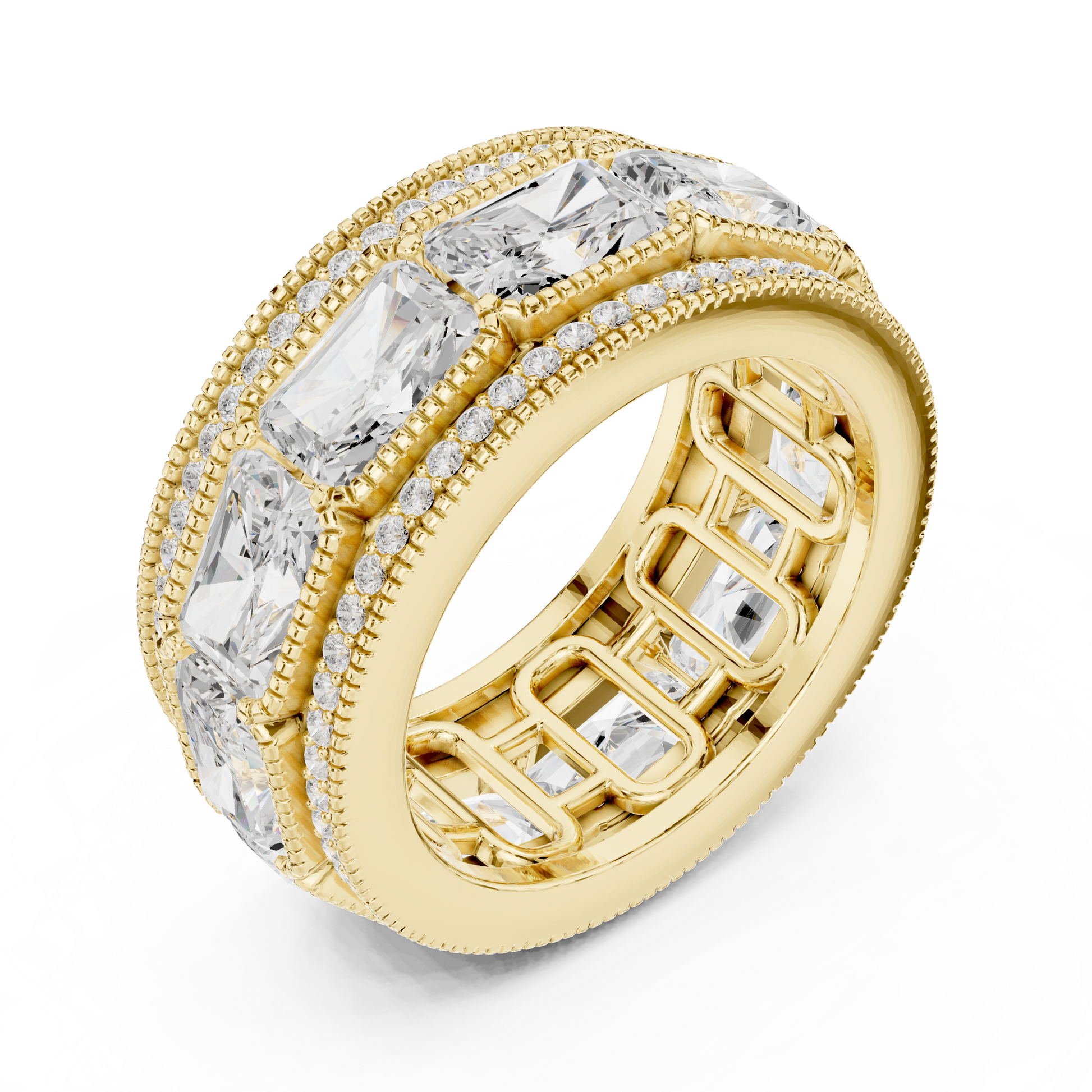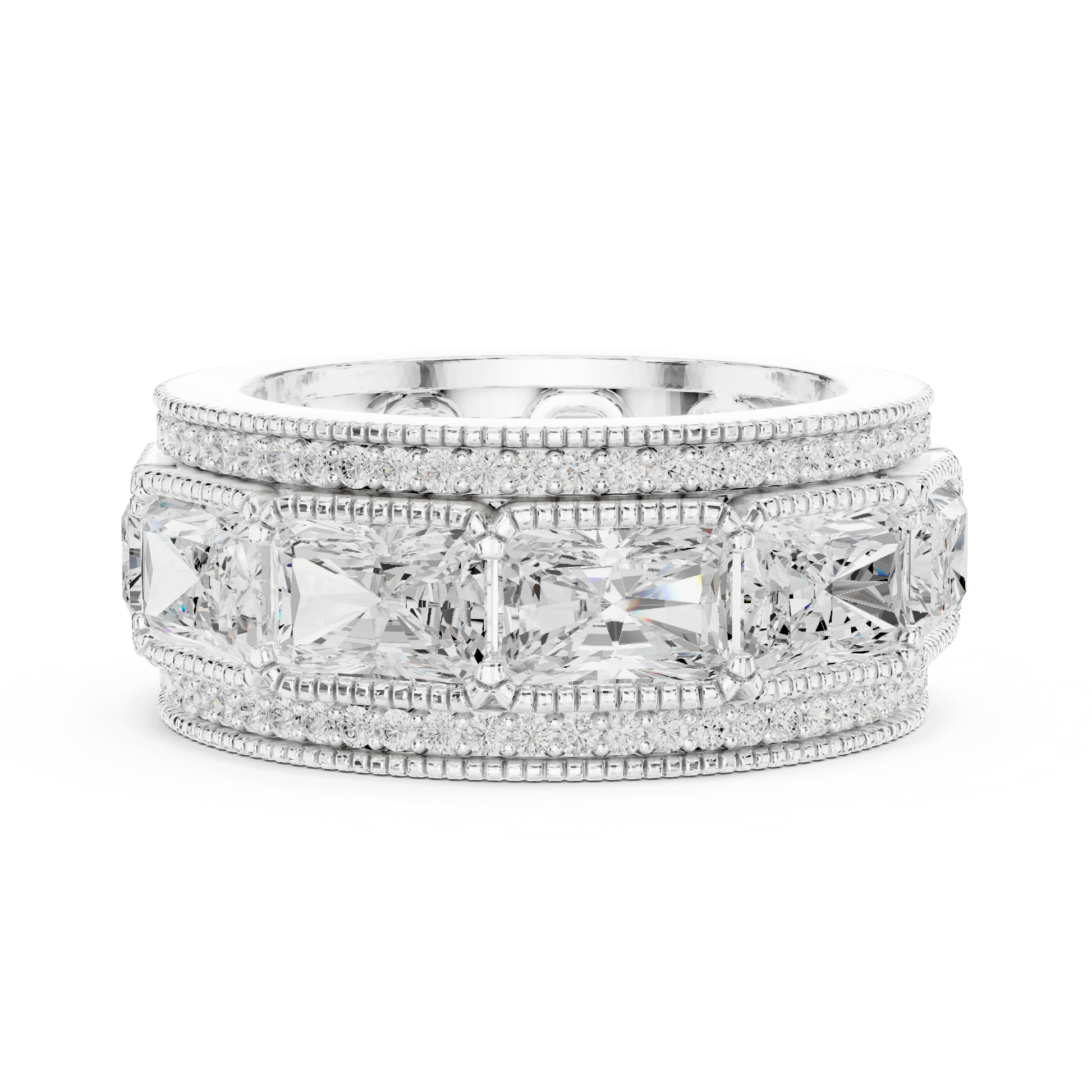 This bold gold ring features a striking row of emerald-cut diamonds set in a structured panel design, framed by shimmering pavé diamond borders. Fine milgrain detailing enhances the vintage-inspired elegance, while the wide silhouette delivers powerful brilliance and presence. Designed for those who love architectural luxury, this ring is perfect as a statement band, anniversary ring, or high-end bridal piece.