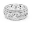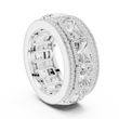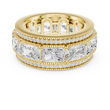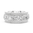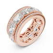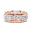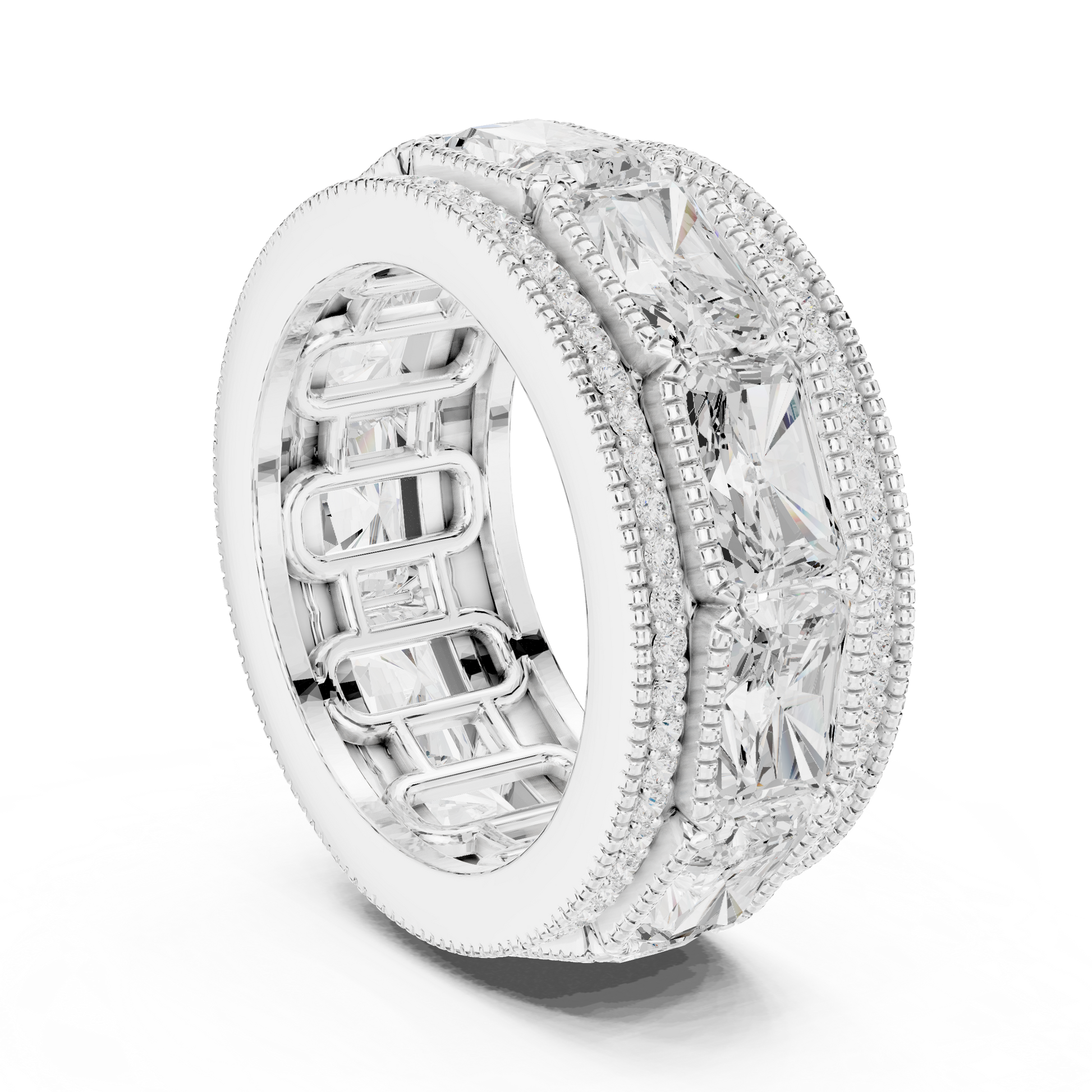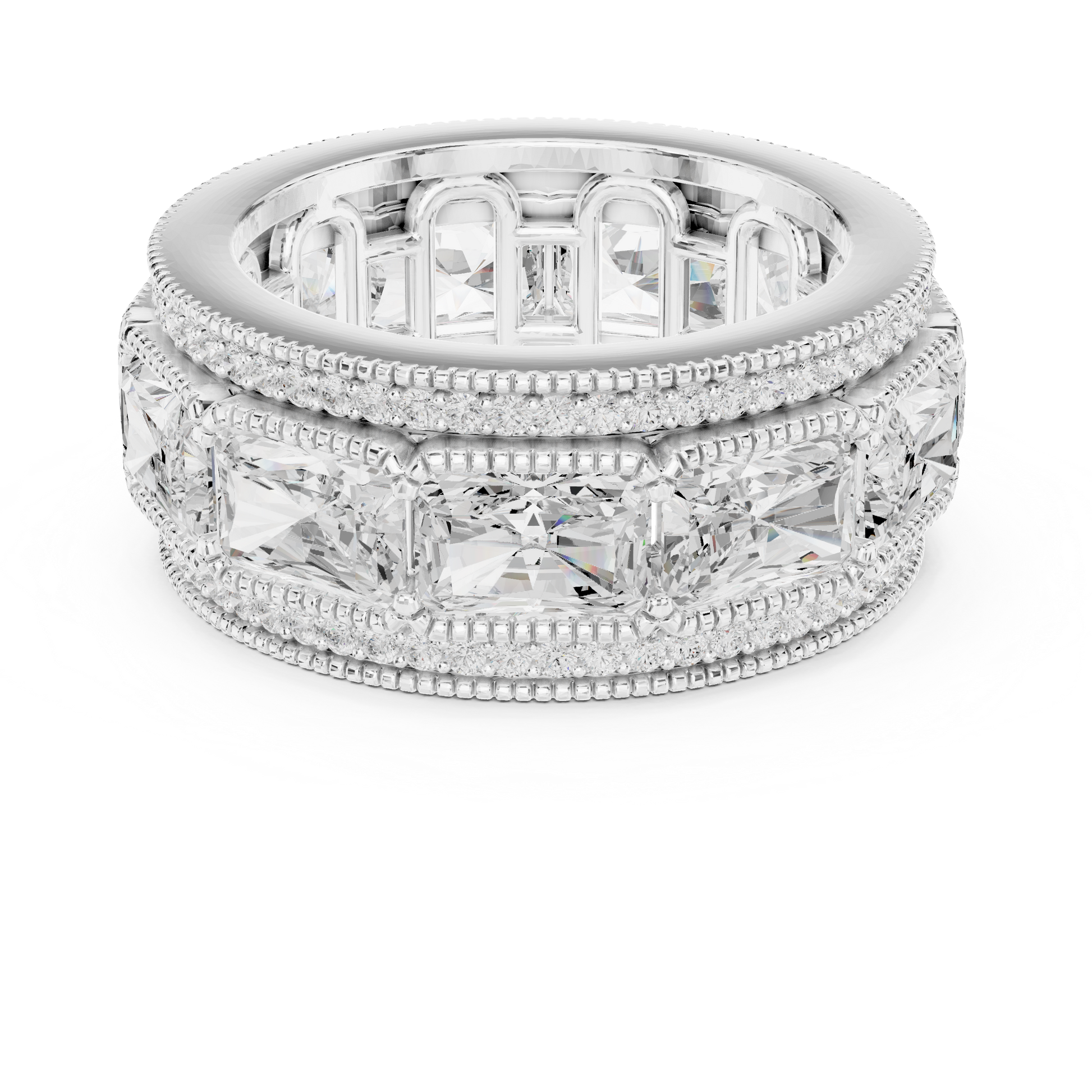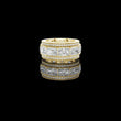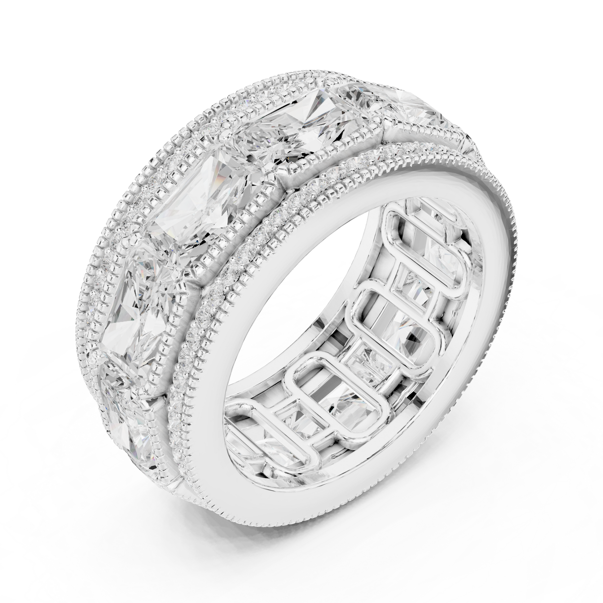This bold gold ring features a striking row of emerald-cut diamonds set in a structured panel design, framed by shimmering pavé diamond borders. Fine milgrain detailing enhances the vintage-inspired elegance, while the wide silhouette delivers powerful brilliance and presence. Designed for those who love architectural luxury, this ring is perfect as a statement band, anniversary ring, or high-end bridal piece.