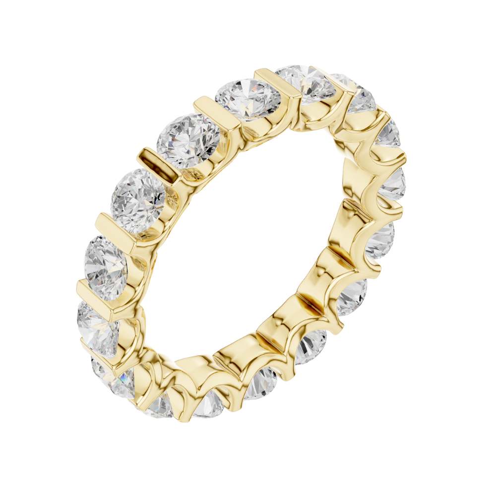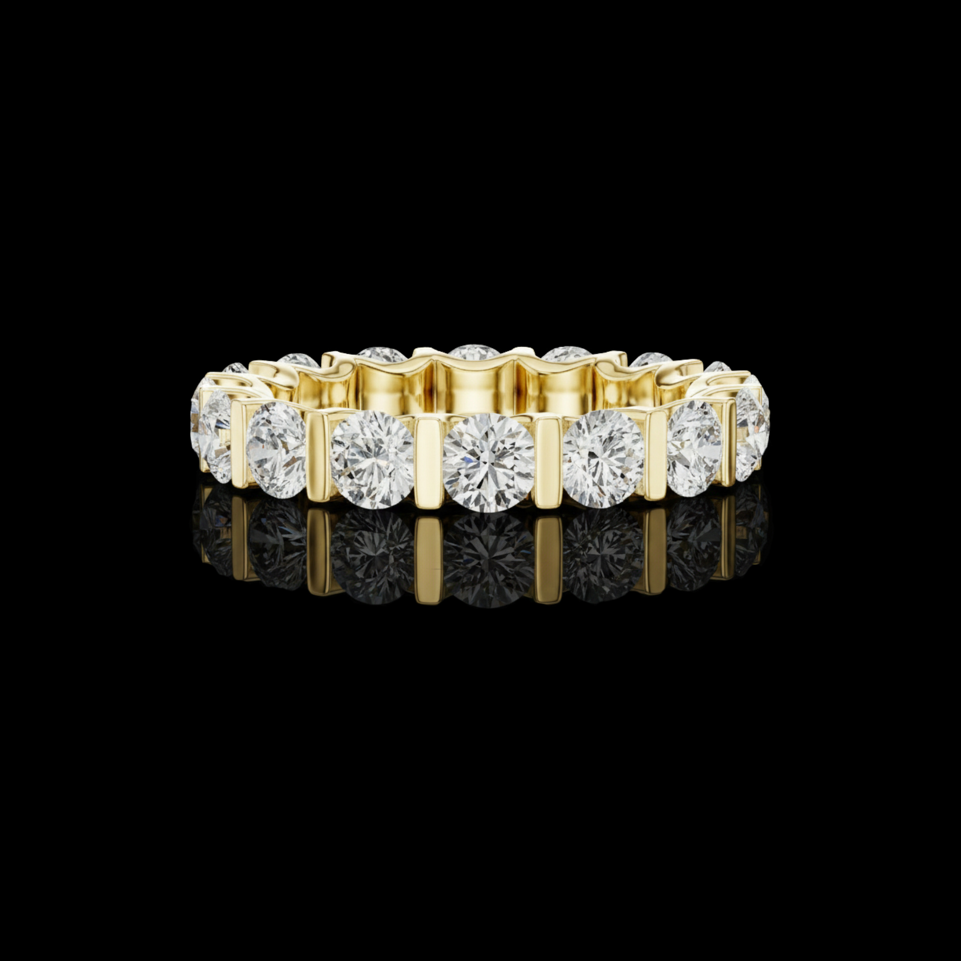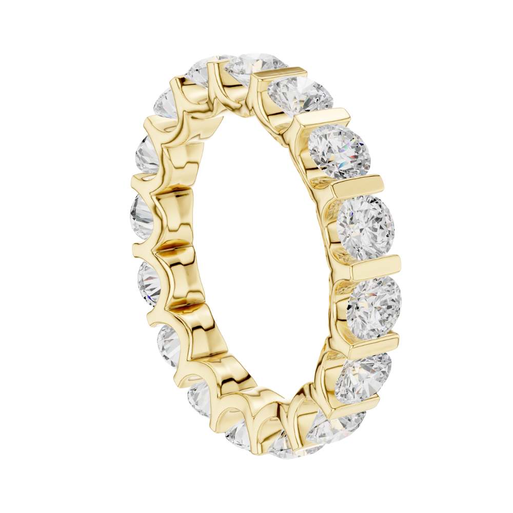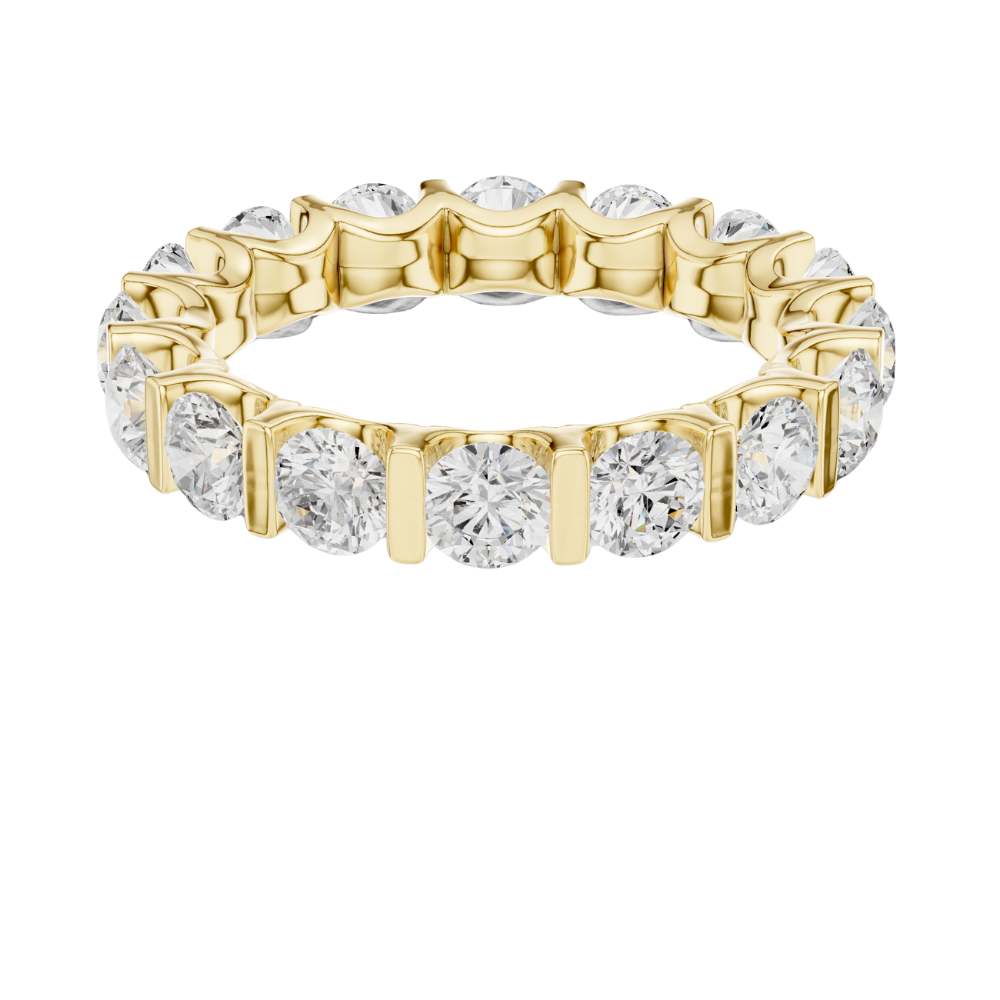 This ring is a luxurious full-eternity band crafted in polished gold, featuring a continuous circle of large round brilliant-cut diamonds. Each diamond is individually secured in a sleek four-prong setting that allows maximum light to pass through, creating exceptional sparkle from every angle. The repeating pattern of gold and diamonds gives the piece a bold, sophisticated look, making it a striking symbol of everlasting elegance.