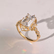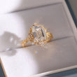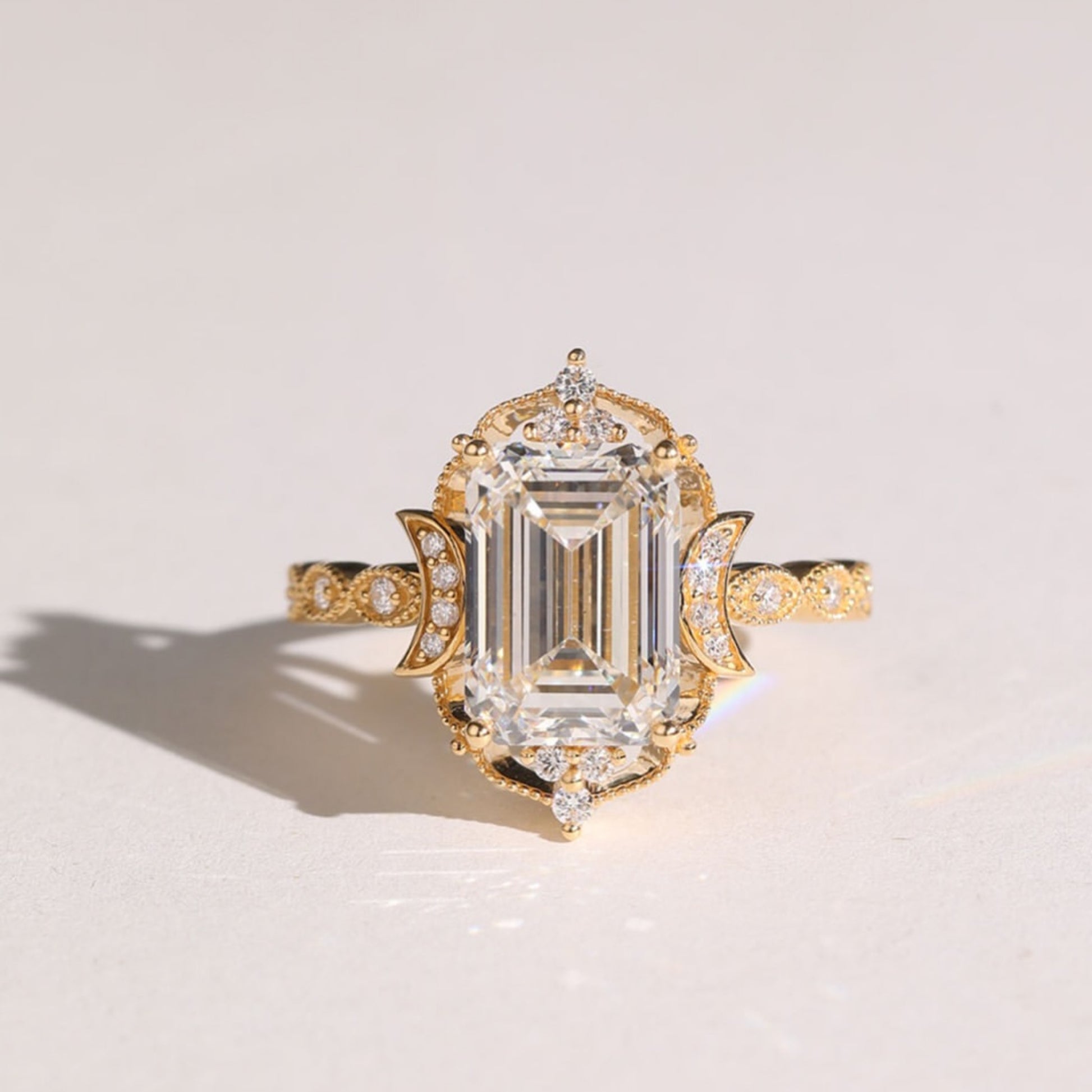 Striking in structure and rich in detail, this emerald-cut diamond ring is a true statement of refined artistry. The elongated emerald-cut center stone showcases crisp step facets that create a hall-of-mirrors brilliance, offering elegance through clean geometry rather than excess sparkle. Its bold silhouette is elevated by sculpted side accents adorned with round diamonds, adding depth and architectural beauty. Crafted in warm gold, the band features intricate vintage-inspired detailing that enhances the ring’s heirloom character while maintaining a luxurious, modern presence.