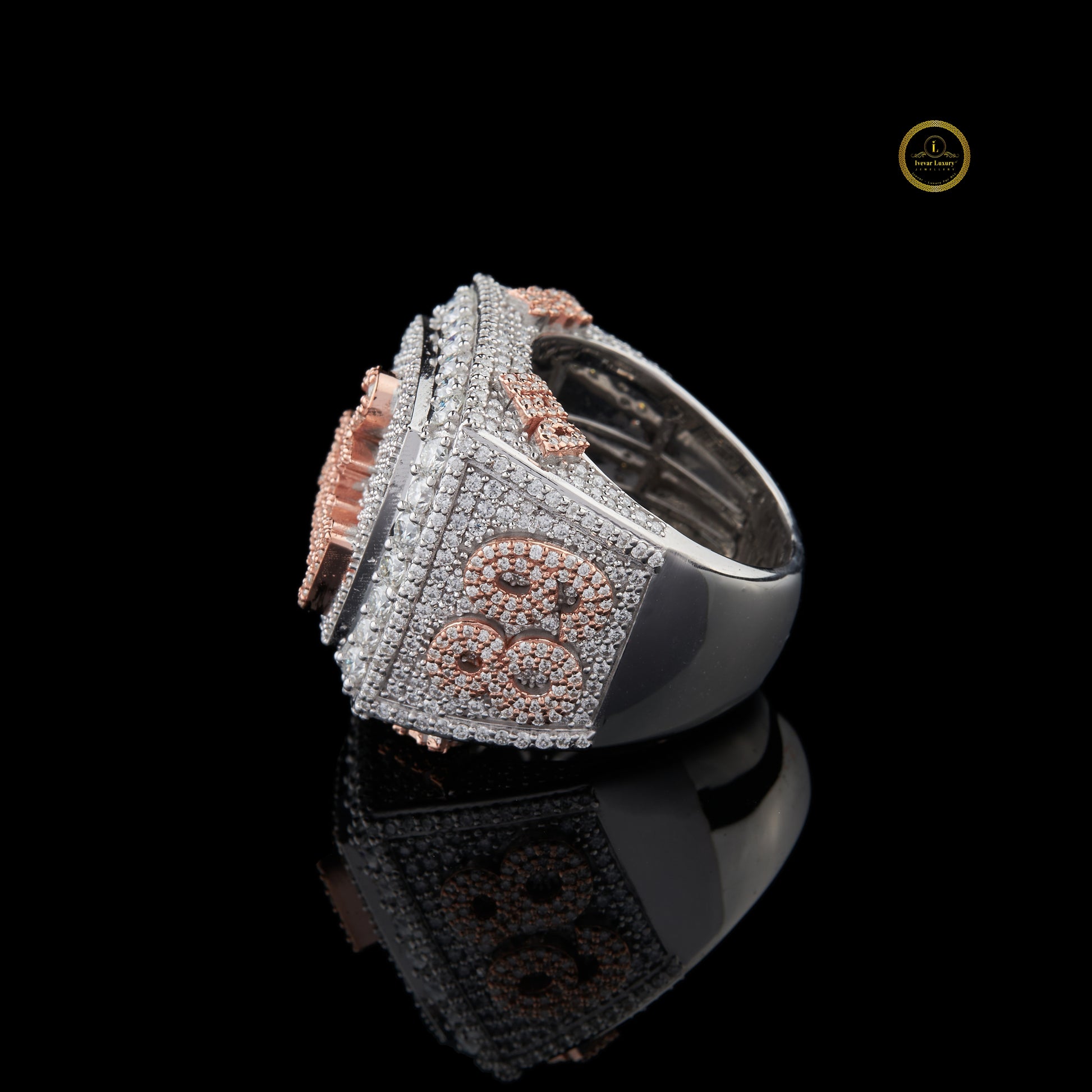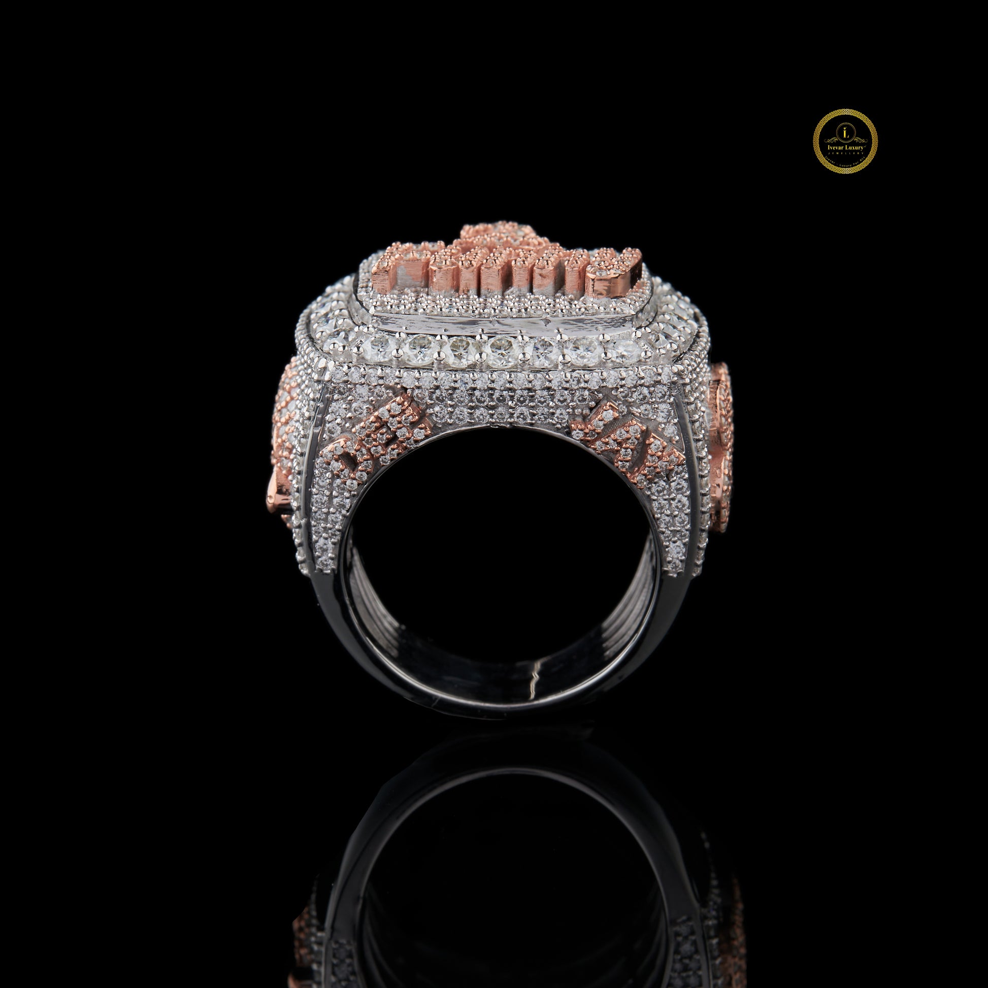 This bold two-tone iced-out championship ring showcases a fully encrusted surface of meticulously set shimmering stones, highlighted with rose-gold accented detailing and a striking “2 Funny” custom emblem at the center. Crafted for those who love standout luxury, this statement ring blends intricate pavé artistry with a powerful, high-shine presence, making it the perfect accessory for collectors, performers, and anyone who wants to elevate their style with a unique, custom-inspired piece.