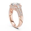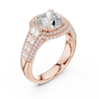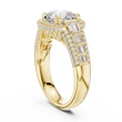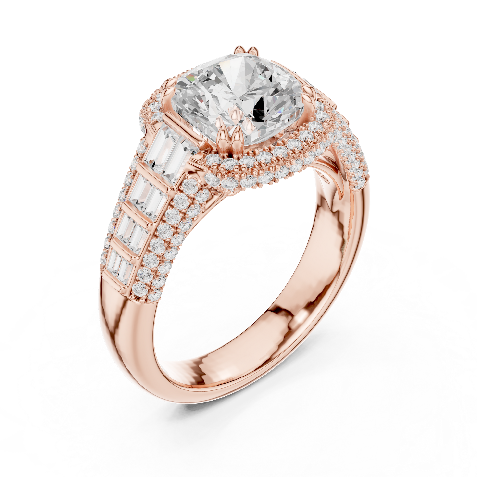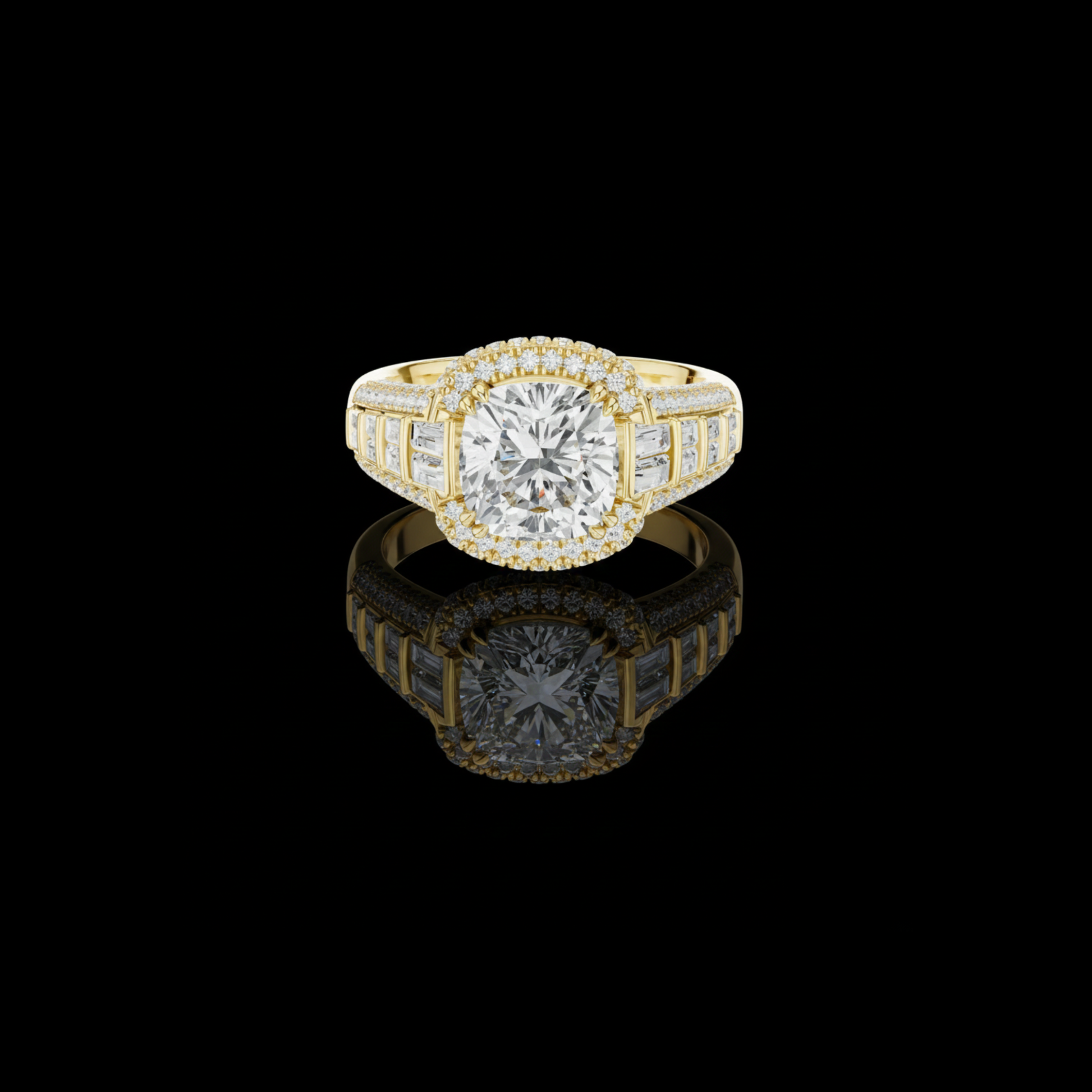 The ring features a cushion cut center diamond, enhanced by a sparkling halo of pave diamonds that amplifies its fire and presence. Baguette-cut diamonds line the shoulders, creating a bold architectural look while adding depth and elegance from every angle. The polished gold band offers a smooth, comfortable fit, making this ring a perfect symbol of love, commitment, and luxury craftsmanship. Designed for those who desire standout beauty.