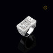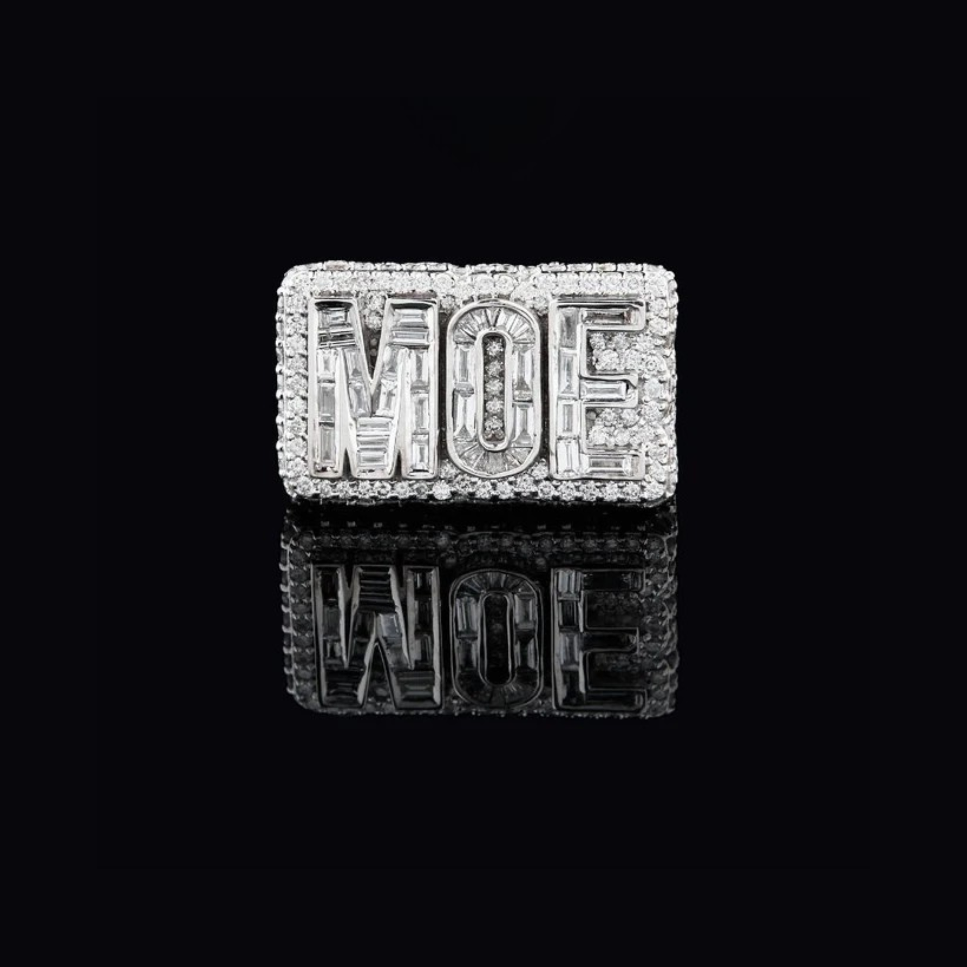 This dazzling rectangular ring commands attention with its bold “MOE” initials prominently displayed in striking baguette-cut diamonds, set against a shimmering pavé diamond backdrop. The precision-cut stones create a radiant sparkle that highlights the clean, modern design, while the surrounding halo of smaller round diamonds adds an extra layer of brilliance and luxury. Perfectly balanced between contemporary style and timeless elegance, this ring makes a powerful statement of individuality and refined craftsmanship by Ivevar.