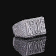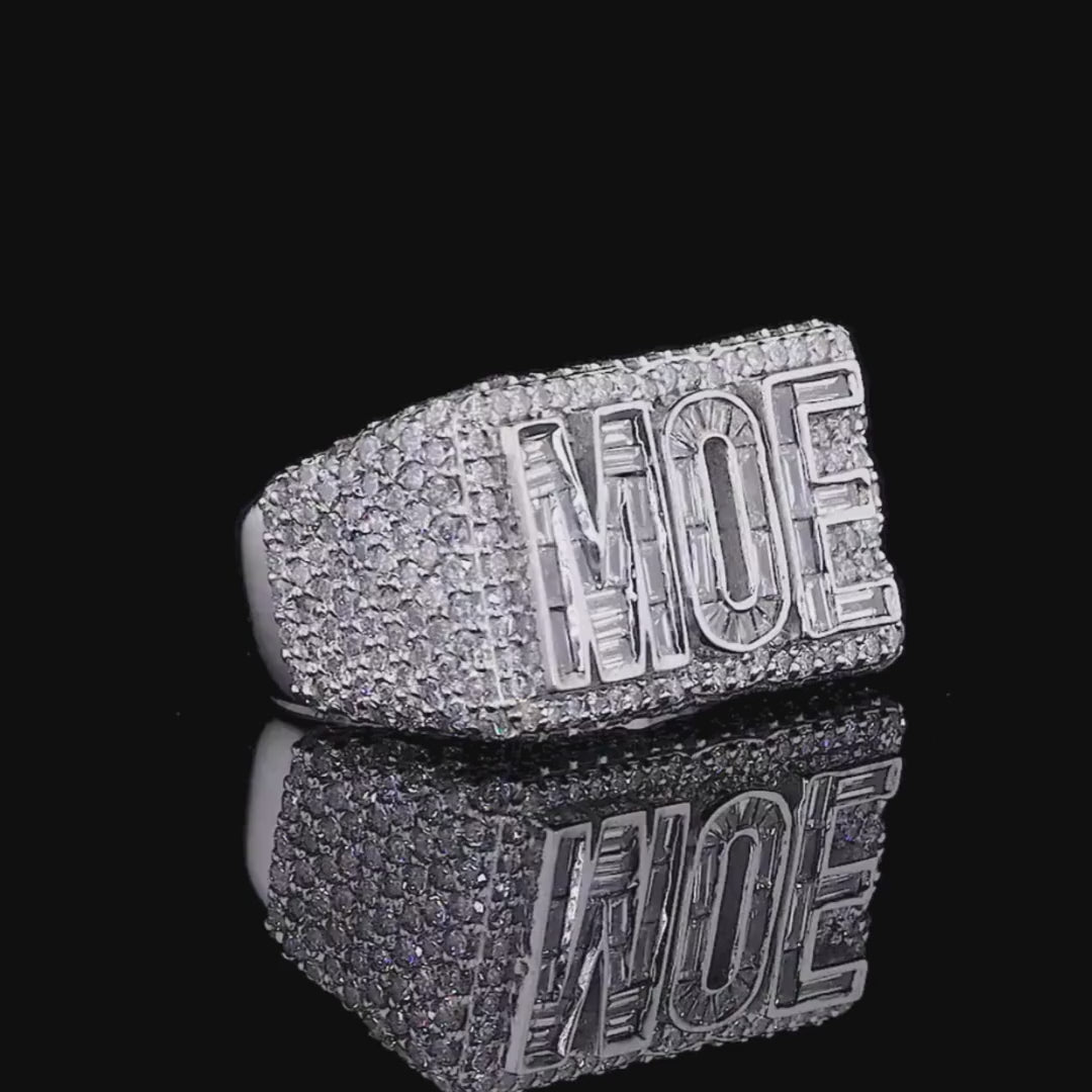 This dazzling rectangular ring commands attention with its bold “MOE” initials prominently displayed in striking baguette-cut diamonds, set against a shimmering pavé diamond backdrop. The precision-cut stones create a radiant sparkle that highlights the clean, modern design, while the surrounding halo of smaller round diamonds adds an extra layer of brilliance and luxury. Perfectly balanced between contemporary style and timeless elegance, this ring makes a powerful statement of individuality and refined craftsmanship by Ivevar.
