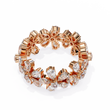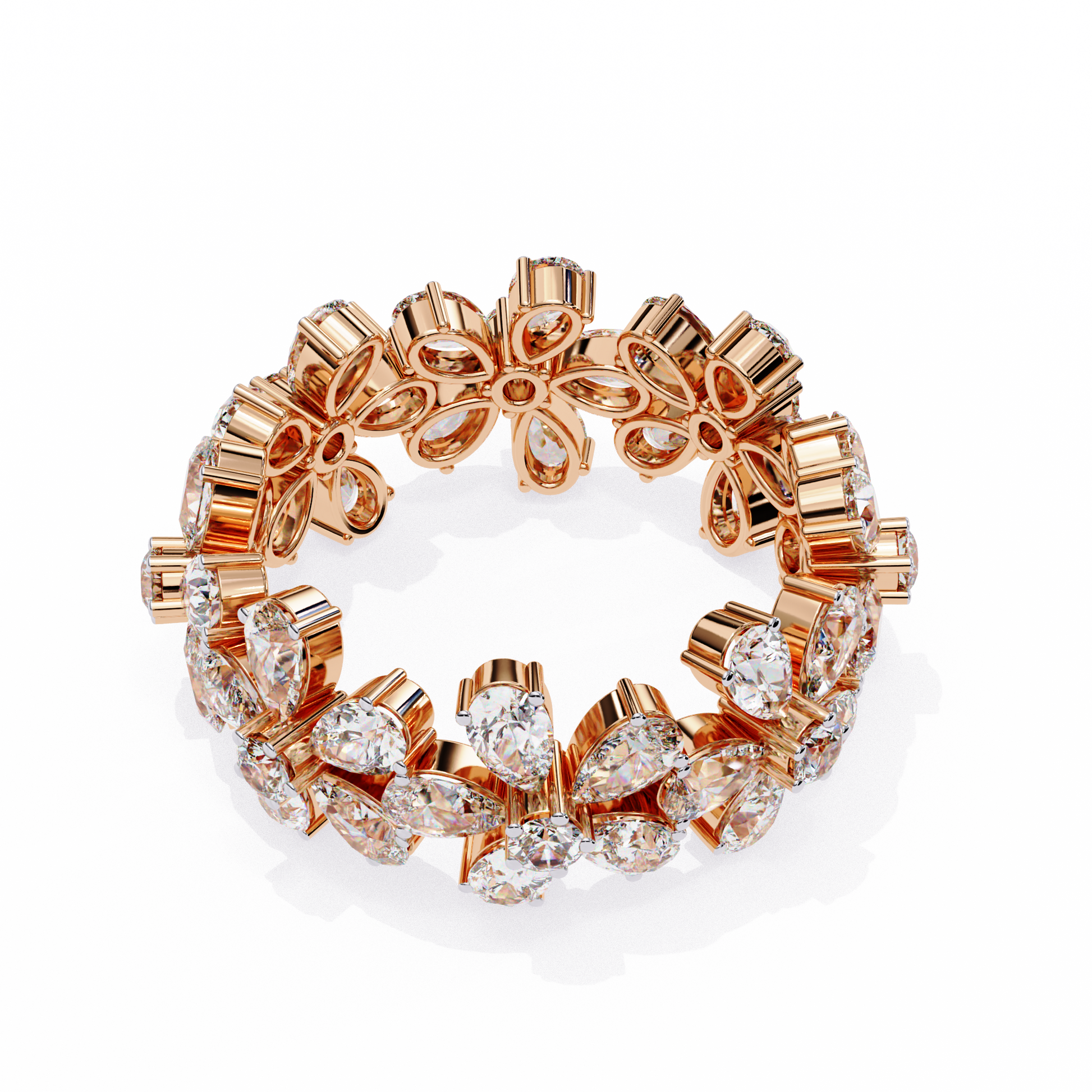 A stunning gold ring featuring an intricate floral design, crafted with clusters of Pear and round brilliant-cut diamonds arranged like blooming petals. Its reflective surface and meticulous detailing create an elegant, high-luxury aesthetic perfect for special occasions and fine jewelry collections.