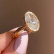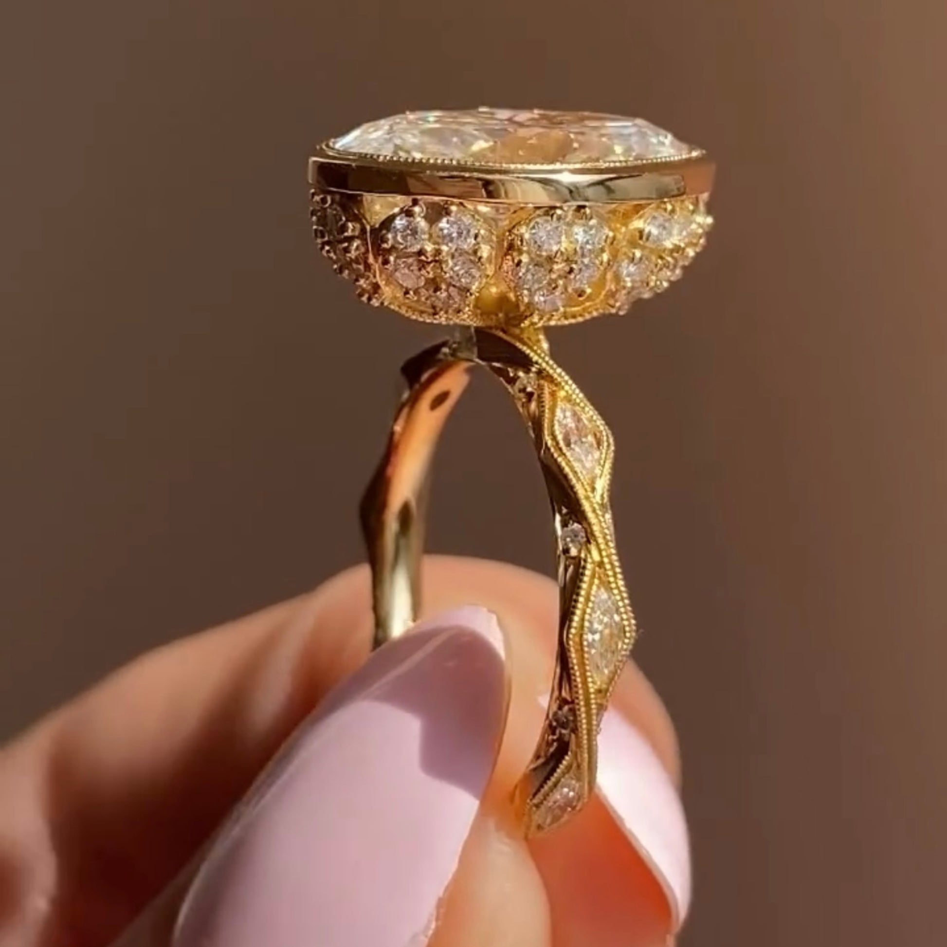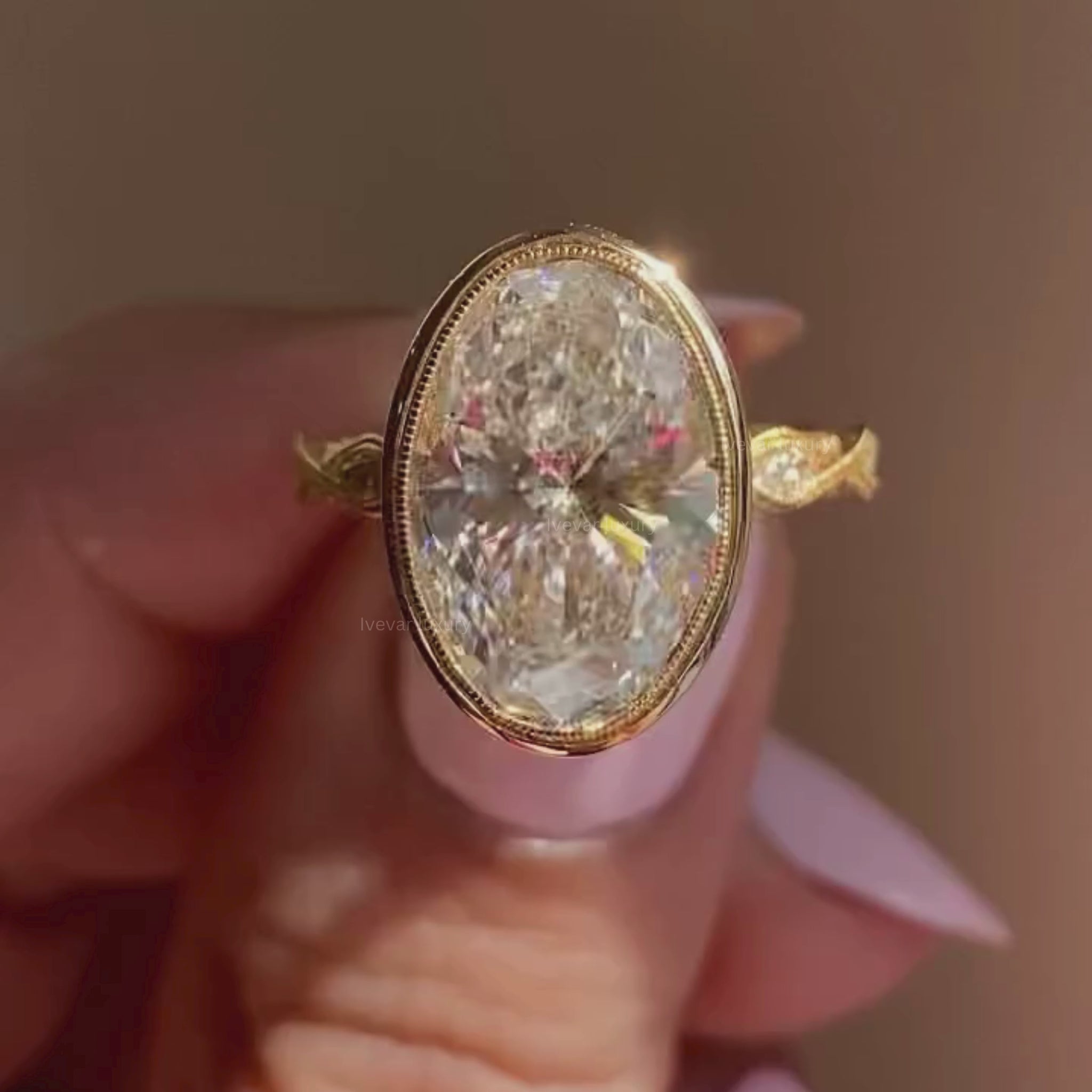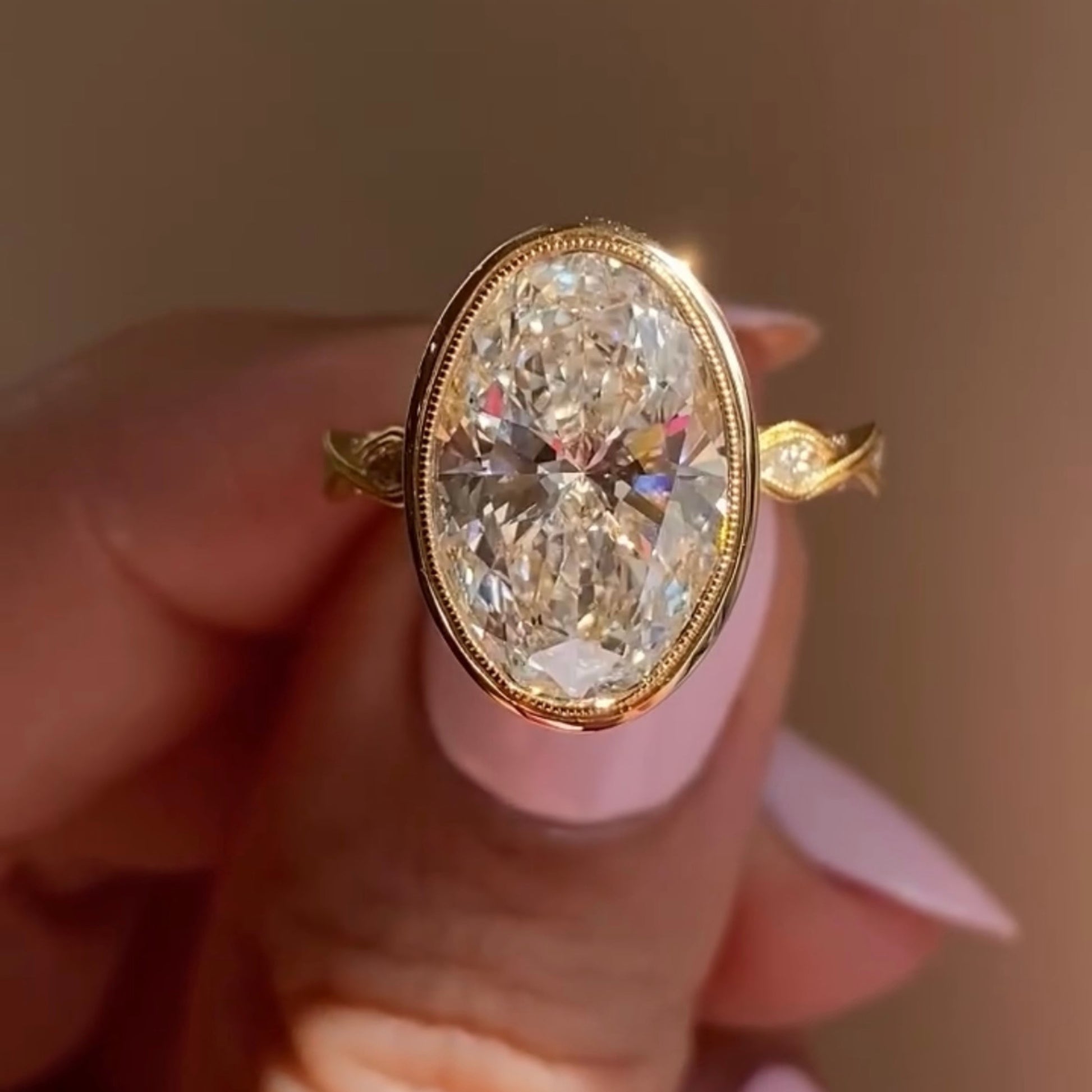 This breathtaking ring features a luminous oval-cut diamond set in a refined bezel setting, offering both elegance and security. The smooth gold frame enhances the diamond’s brilliance while giving the ring a sophisticated, antique-inspired appeal. he elongated oval silhouette creates a flattering, eye-catching presence on the hand, making this piece both timeless and distinctive. Perfect for engagements or heirloom-worthy gifting, this ring embodies vintage elegance, luxurious craftsmanship, and enduring beauty—designed to be cherished for generations.