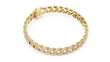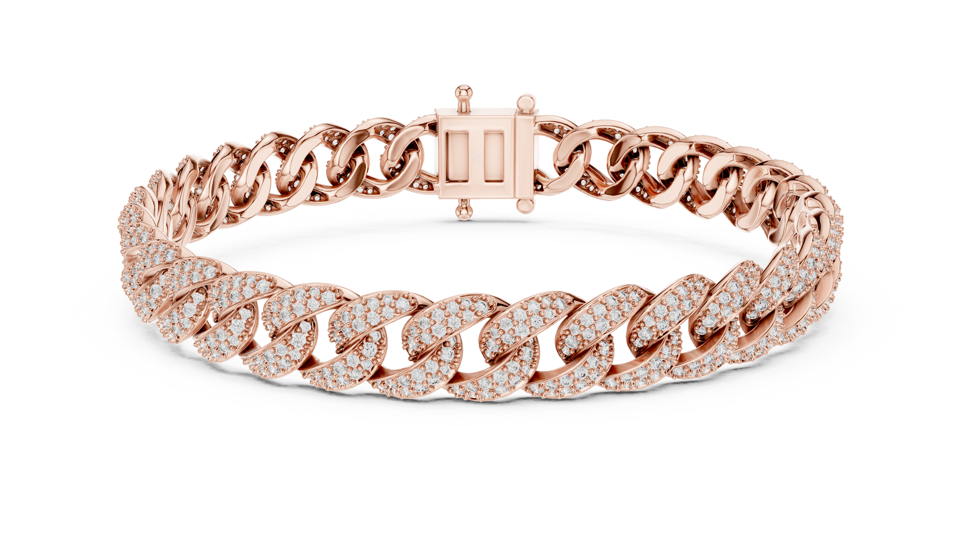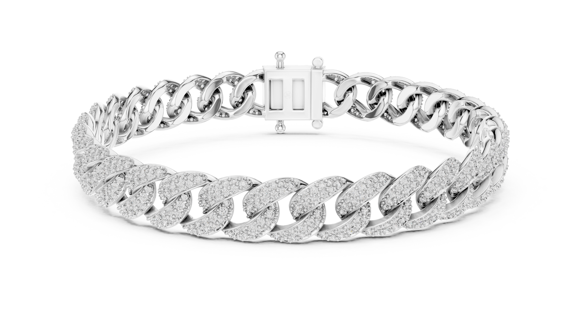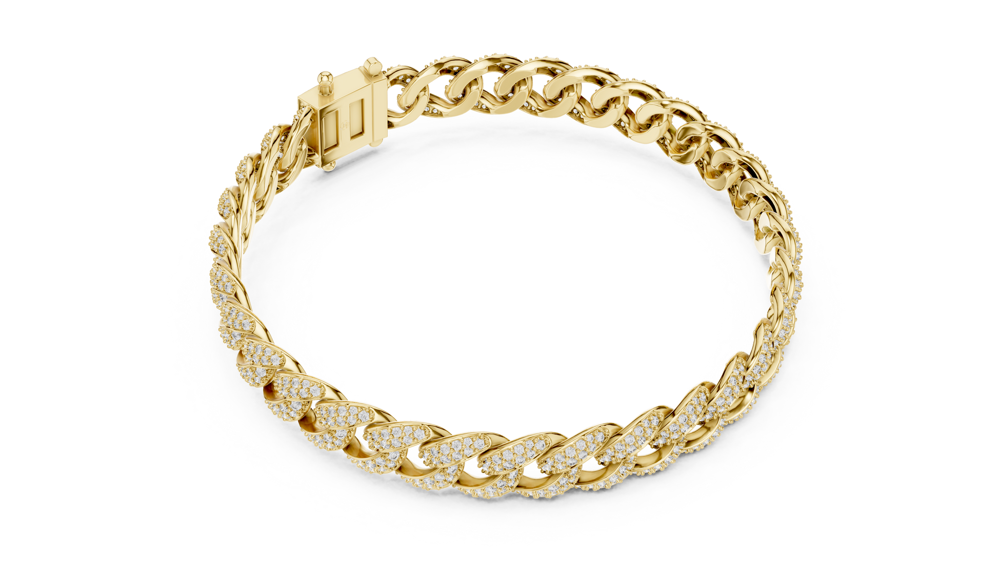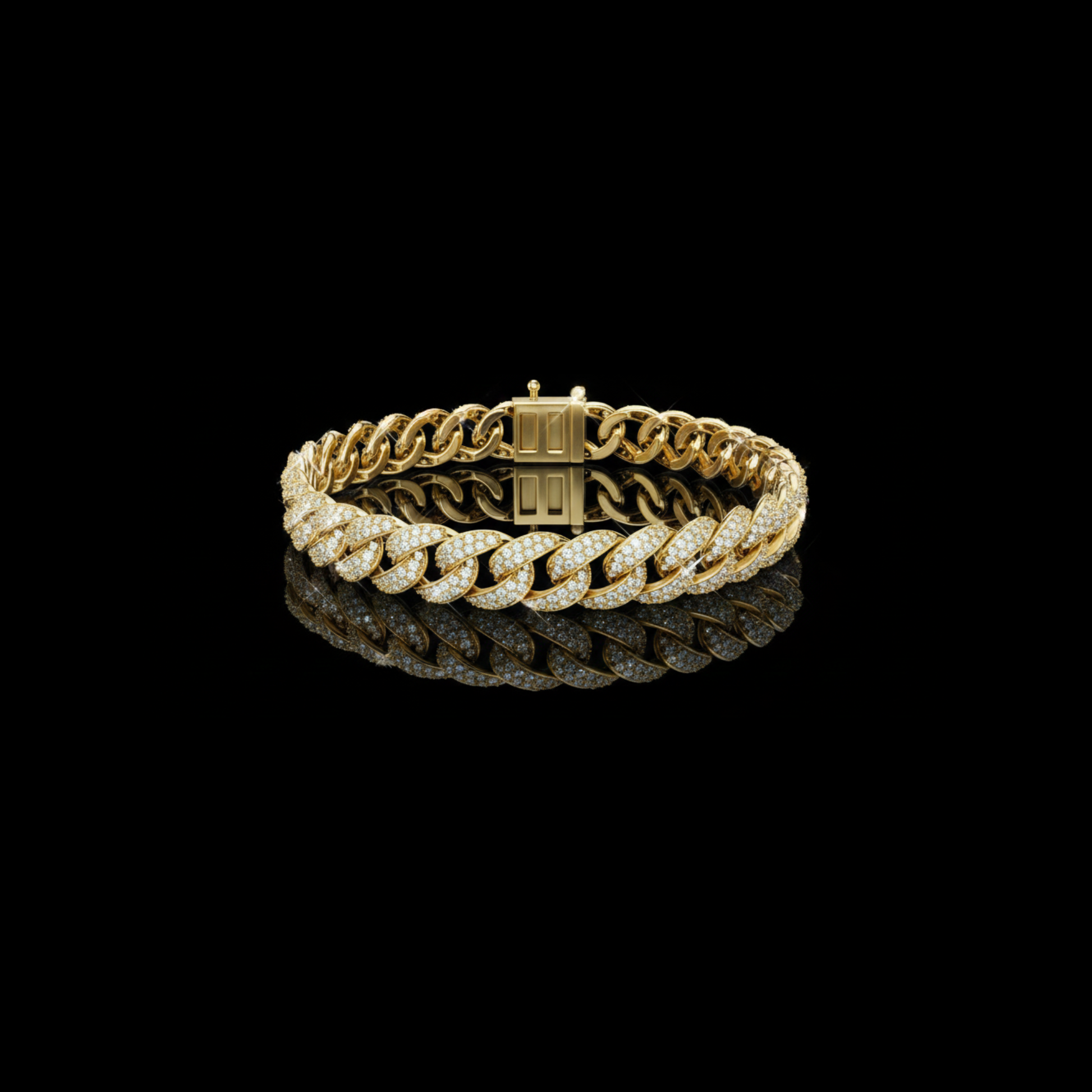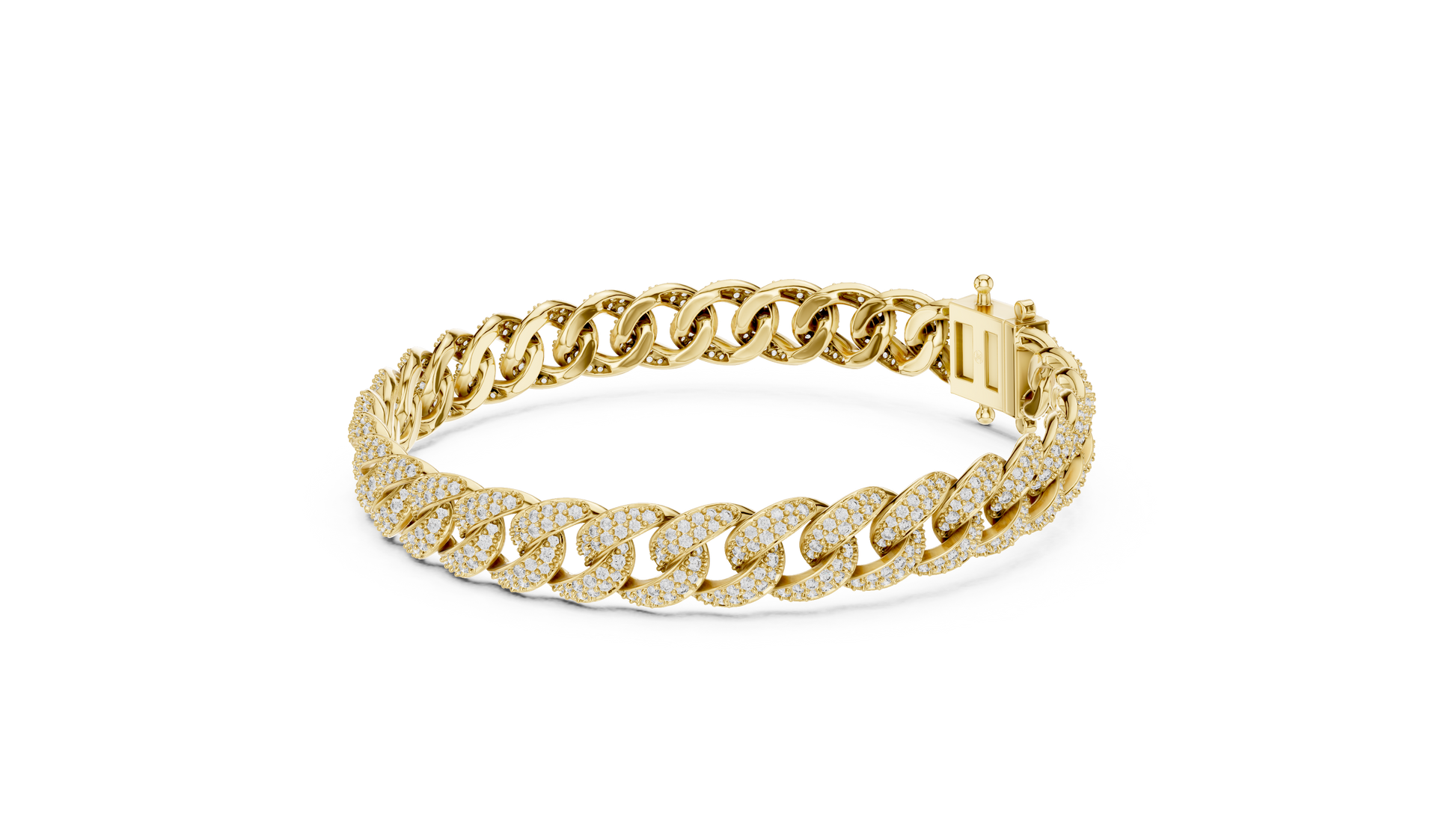 This striking bracelet features a classic Cuban link silhouette crafted in luminous gold and fully adorned with pave-set diamonds for exceptional brilliance. Each interlocking link is expertly polished to enhance depth and dimension, while the diamond detailing adds a refined layer of luxury to the bold design. Finished with a secure box clasp, this statement bracelet blends timeless craftsmanship with contemporary elegance, making it a powerful expression of confidence, style, and enduring sophistication.