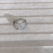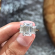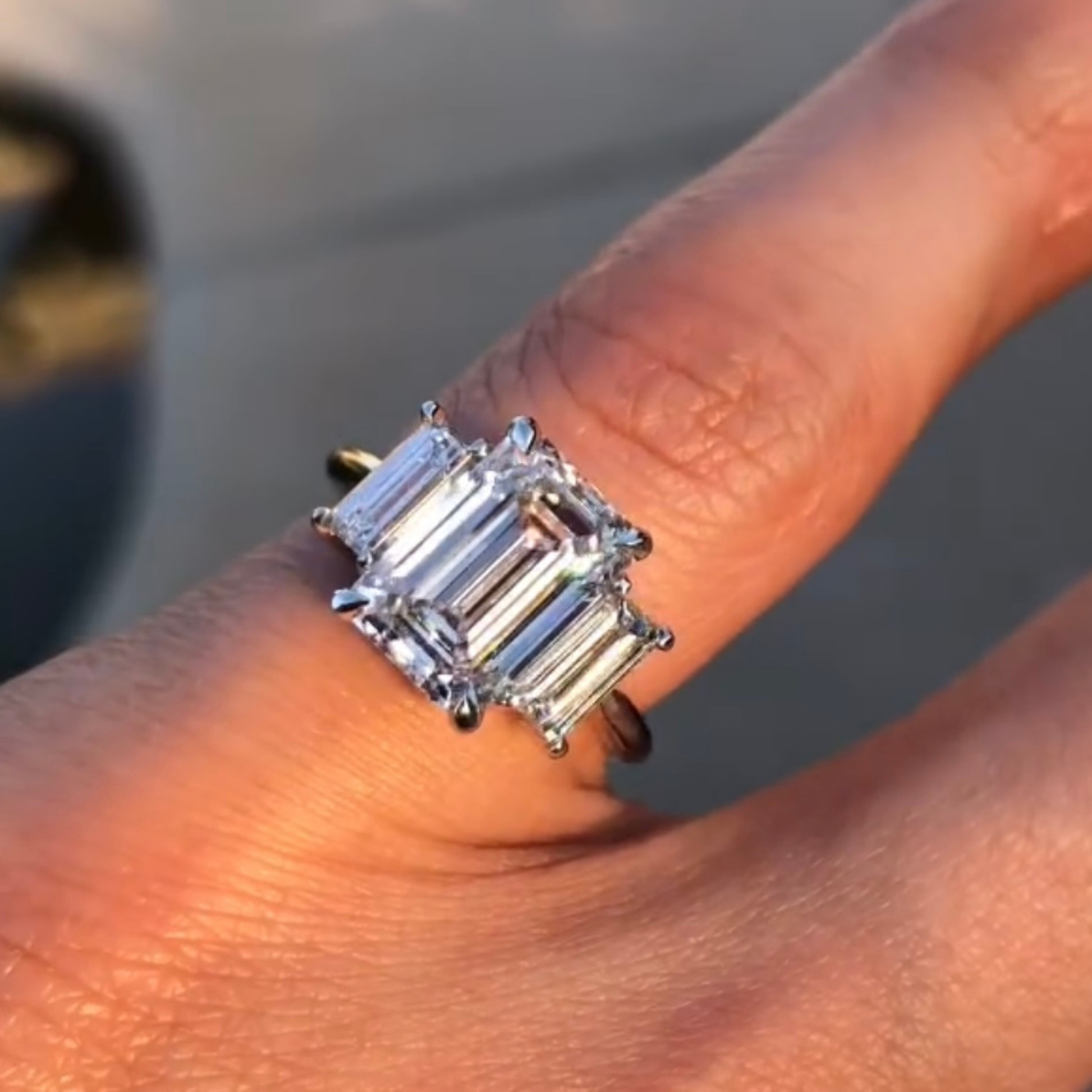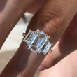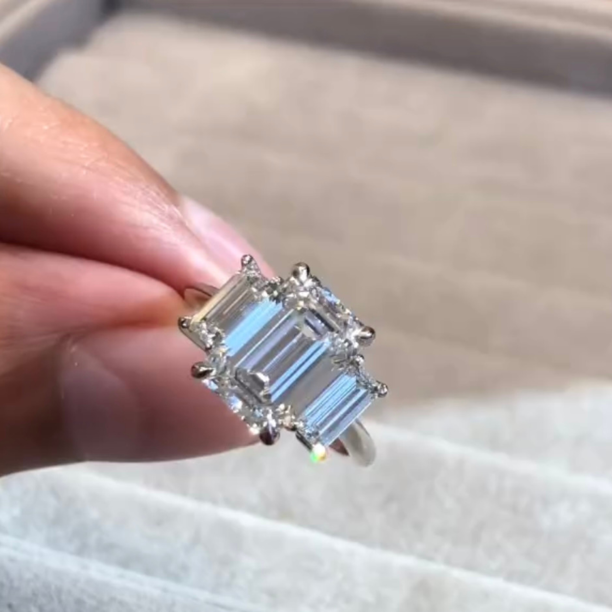 This sophisticated three-stone engagement ring highlights a bold emerald-cut center stone flanked by matching step-cut side diamonds, creating a clean and architectural silhouette. The elongated facets emphasize clarity and elegance, while the slim polished gold band keeps the focus on the striking linear design. Perfect for lovers of modern luxury and refined minimalism, this ring delivers timeless brilliance with a contemporary edge.