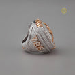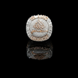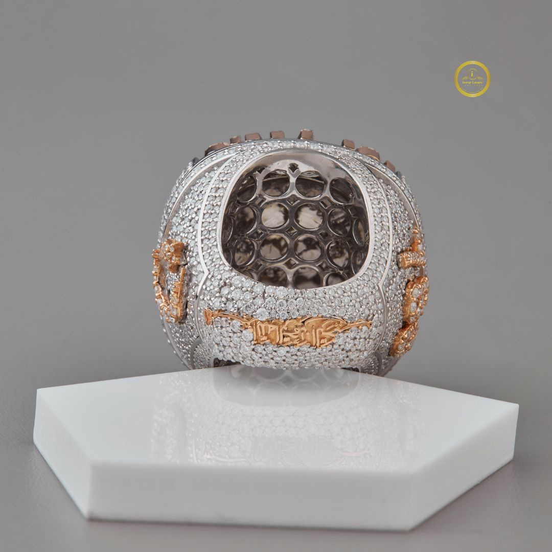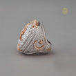 This statement ring features an intricate circular design adorned with rows of sparkling diamonds, beautifully accented by rose-gold lettering and calligraphic detailing at its center. The outer edge is framed with emerald-cut stones that add depth, dimension, and a luxurious radiance, while the inner pavé setting enhances the brilliance of the entire piece. Bold, ornate, and deeply symbolic, this ring combines exquisite craftsmanship with cultural elegance, making it a striking accessory that commands attention and admiration by Ivevar.