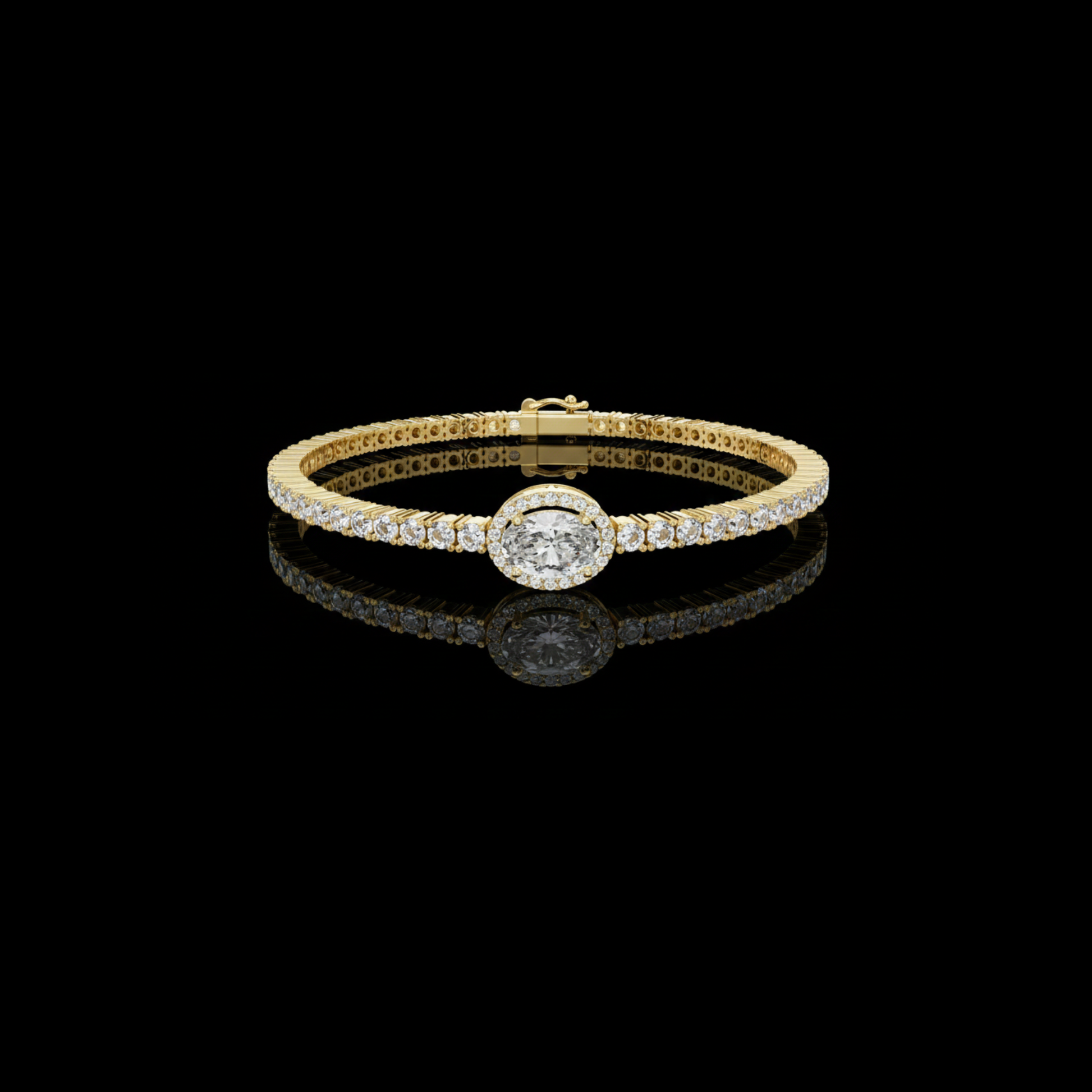 This exquisite gold tennis bracelet features a timeless design highlighted by a dazzling oval-cut center stone framed in a delicate halo of smaller diamonds. A continuous line of brilliant round diamonds extends along the band, creating exceptional sparkle and balance, while the polished gold setting adds warmth and sophistication. Secured with a classic clasp for comfort and durability, this bracelet is perfect for special occasions or elevating everyday style with refined elegance by Ivevar.