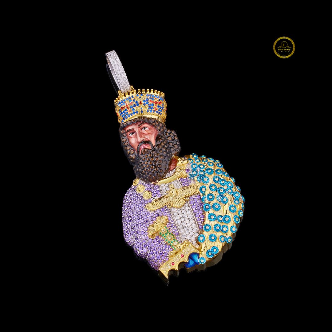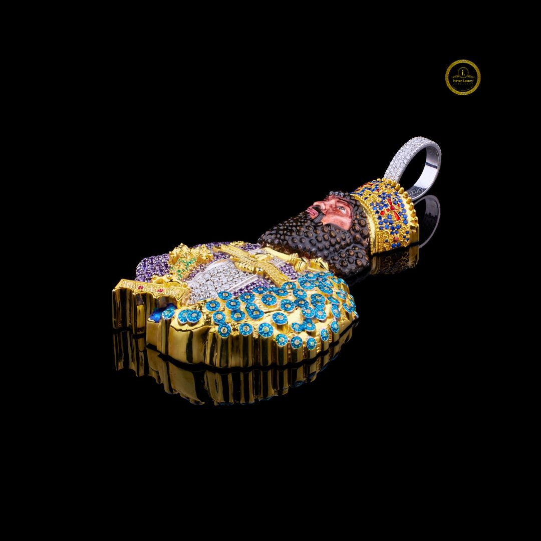 This is an extraordinarily detailed and colorful custom pendant created by Ivevar Luxury Jewelers, featuring a figural bust, likely representing a historical king, emperor, or religious figure.
