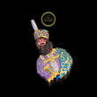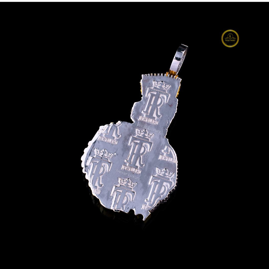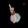 The piece is a testament to high-level custom jewelry work, utilizing various colors of Moissanite diamonds (simulating gemstones) and potentially enamel or other colored materials to bring the figure to life. Notice the intricate crown set with blue, red, and yellow stones, and the robe rendered in vibrant purple pave and a striking blue/gold peacock pattern on the shoulder. The face is meticulously detailed. This large, three-dimensional pendant is an opulent, statement piece designed to be instantly recognizable and highly personalized.