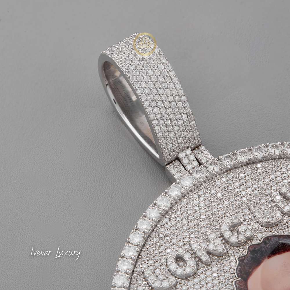 This is a high-end, custom-made pendant from Ivevar Luxury Jewelers, as indicated by the logo. The piece is a large, circular medallion meticulously paved with what is described as Moissanite diamonds, simulating a full, brilliant diamond look.