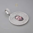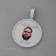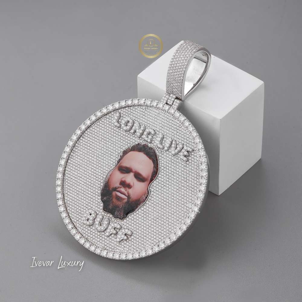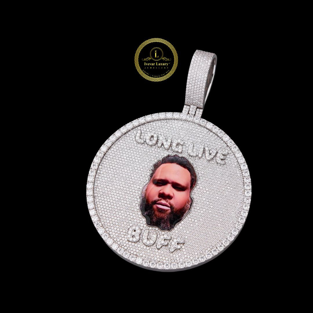 The central design features a photo image of a man set within the brilliant pave. The phrase "LONG LIVE BUFF" is custom-set in raised, diamond-encrusted lettering above and below the image, suggesting the pendant serves as a tribute or memorial piece. The bail (attachment loop) is also fully covered in stones, highlighting the luxury craftsmanship and significant use of stones throughout the entire piece. It's a bold, personalized statement in fine custom jewelry.
