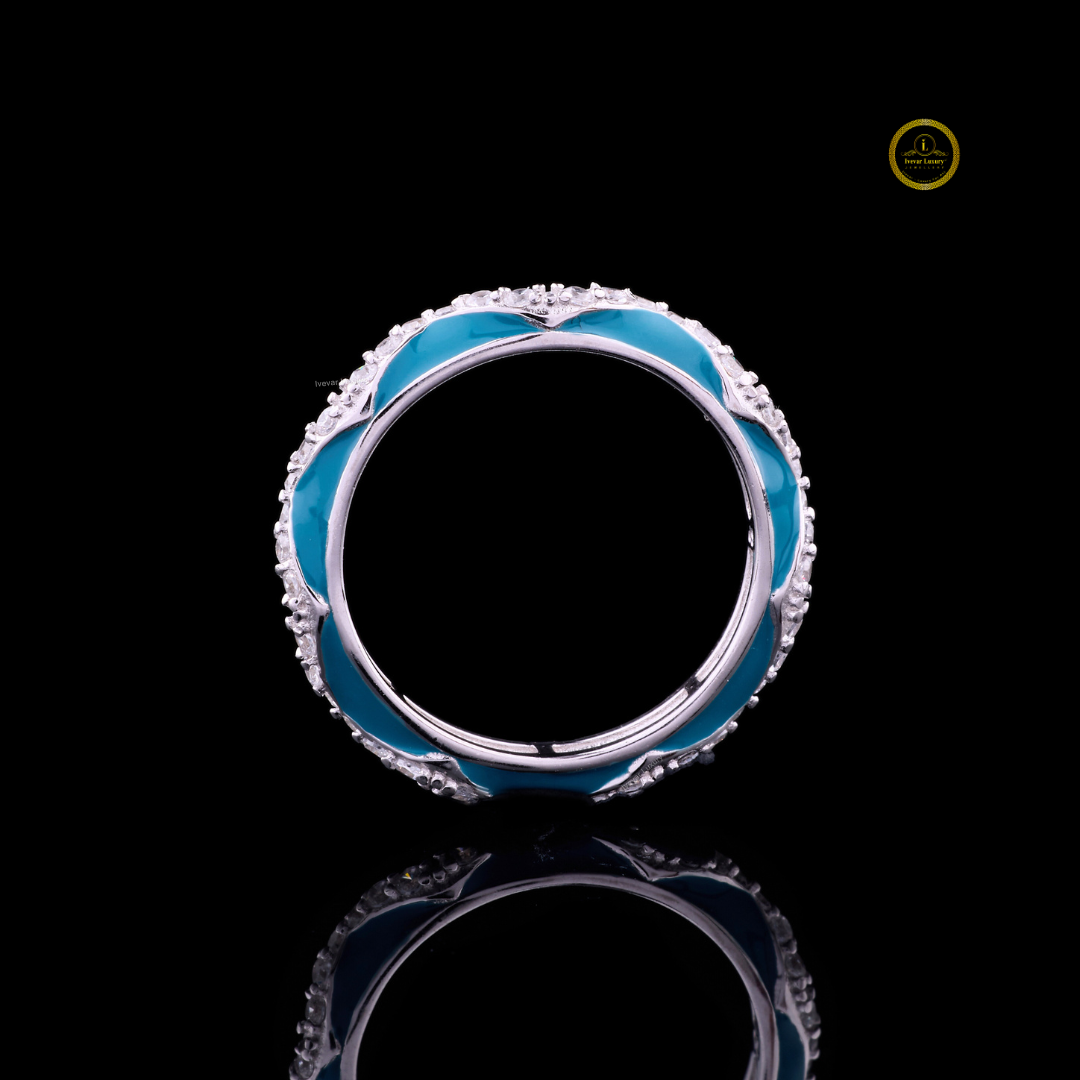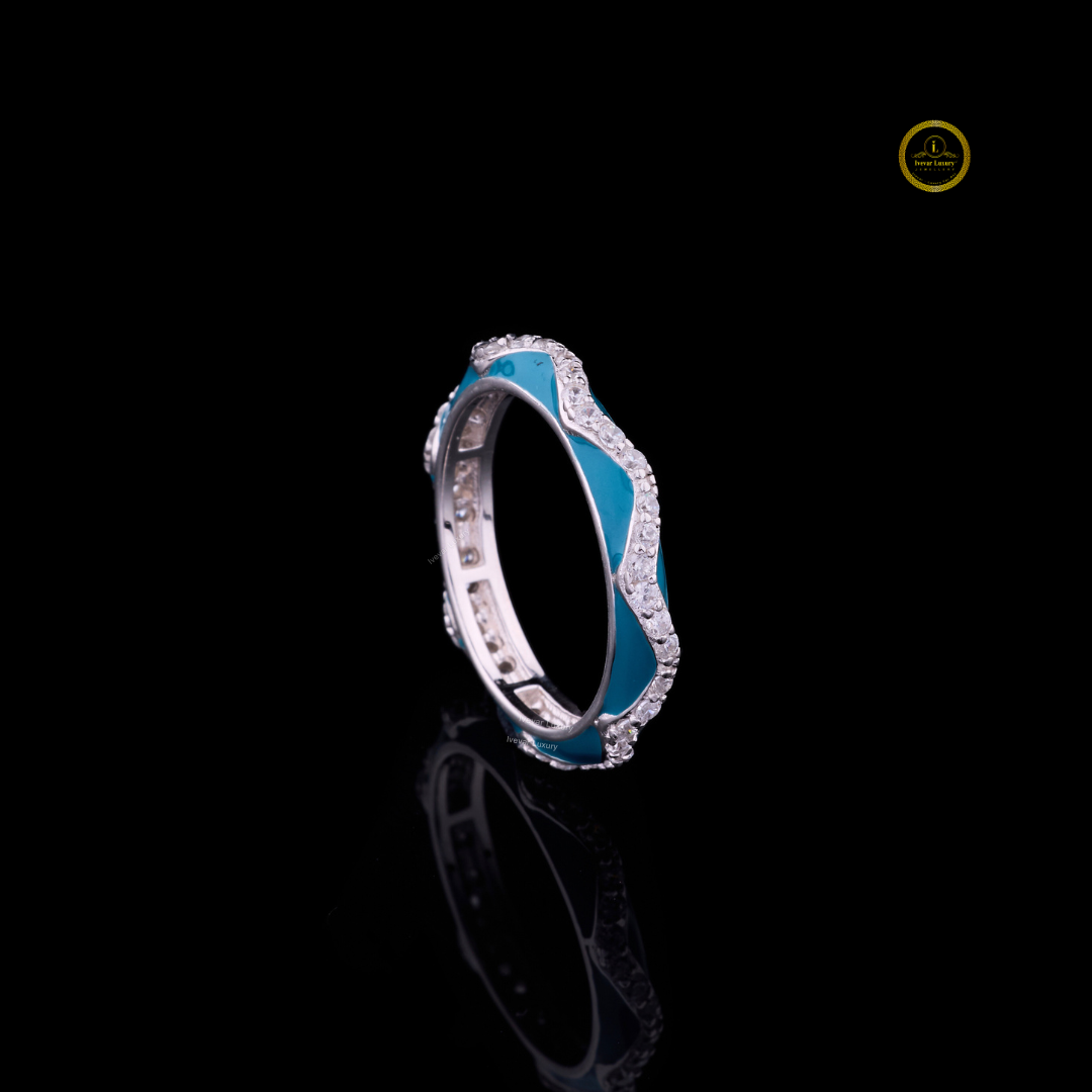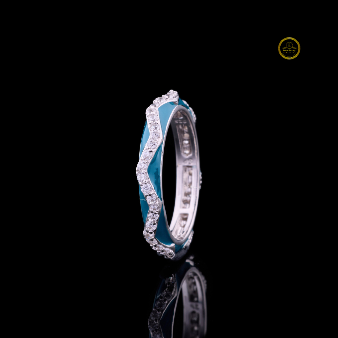 This stunning ring features a wave-inspired design crafted in polished silver-tone metal, beautifully accented with sparkling white diamonds and vibrant turquoise enamel. The wavy pattern symbolizes the grace and fluidity of the ocean, while the round brilliant stones add a touch of luxury and sophistication. Perfect for both everyday wear and special occasions, this piece embodies elegance, artistry, and timeless charm.