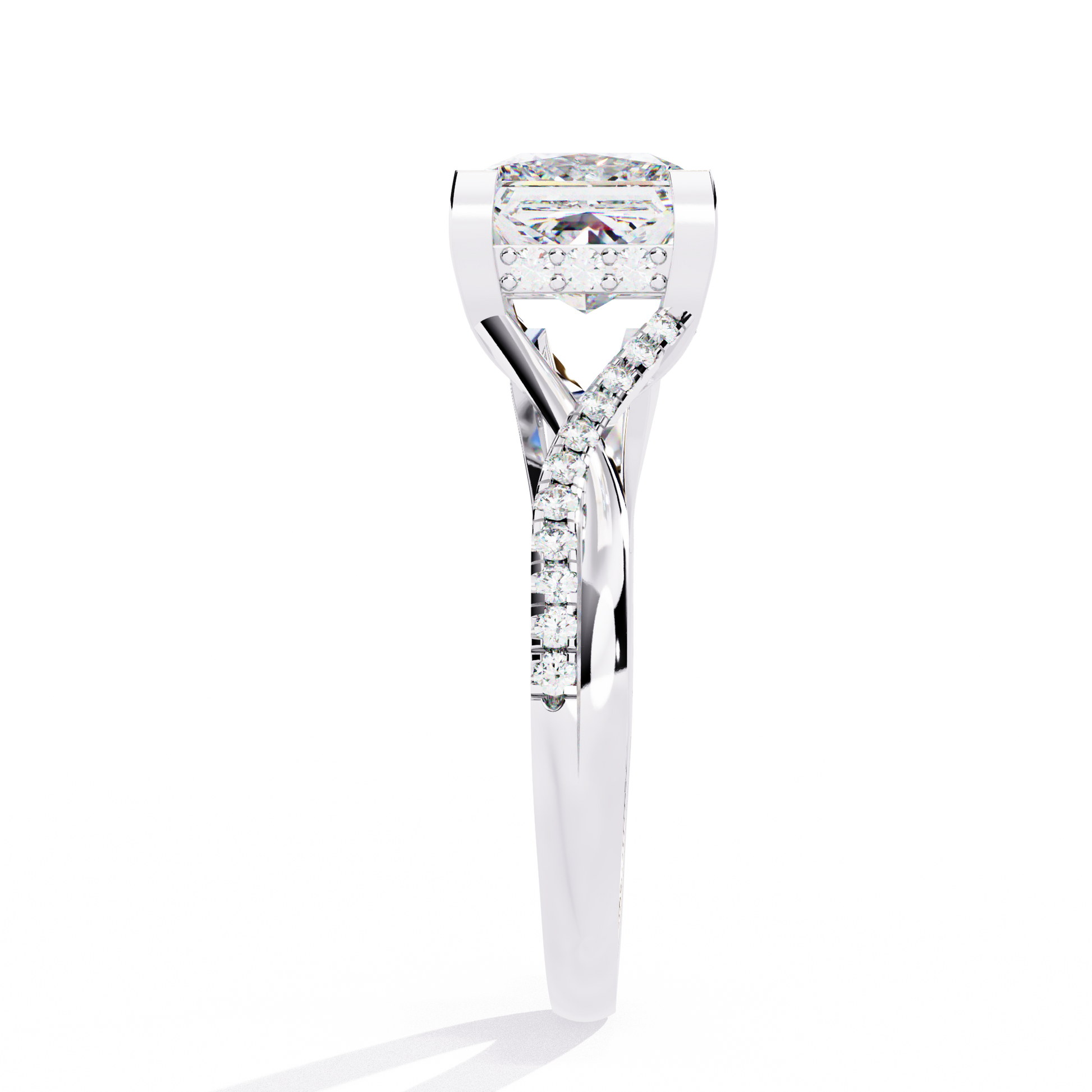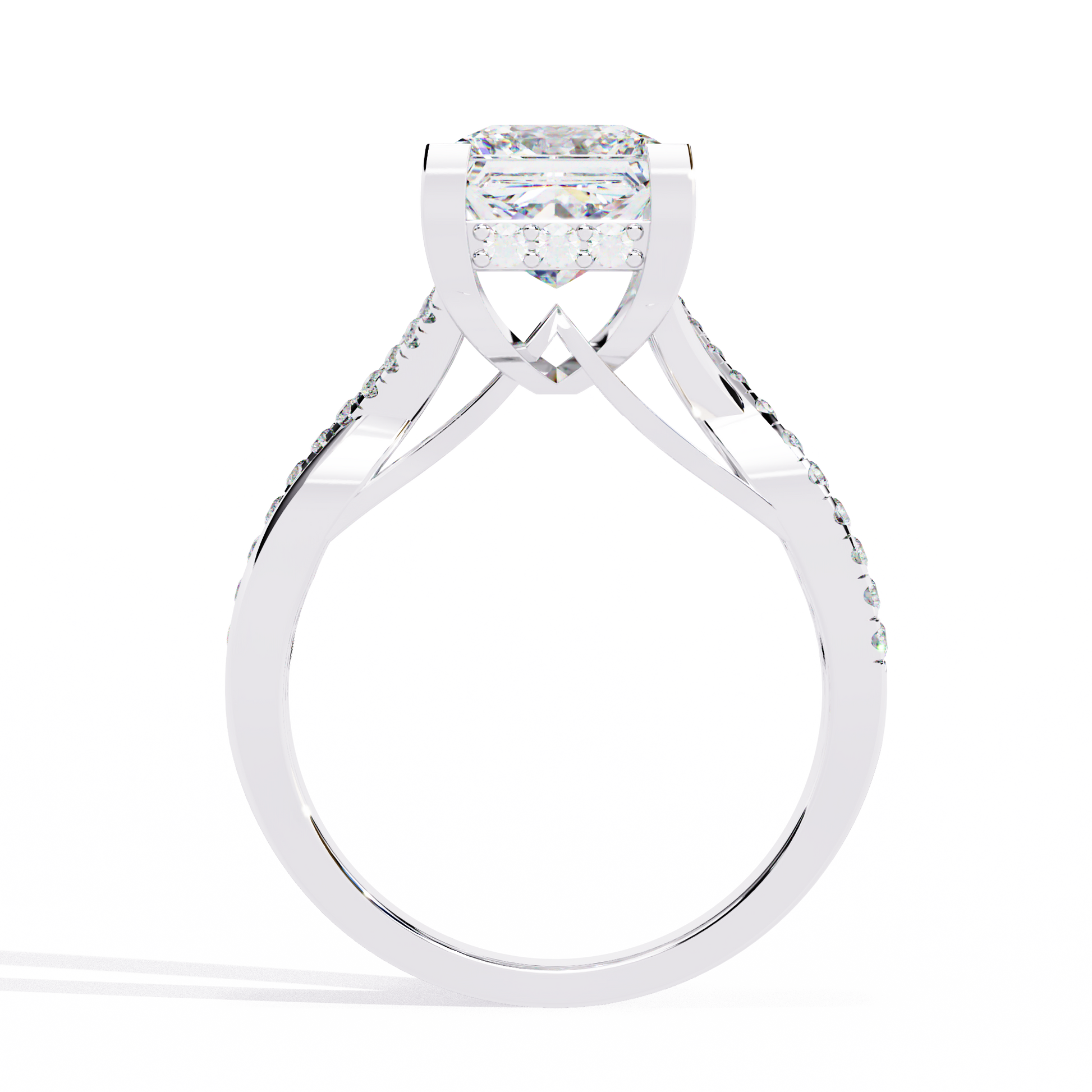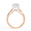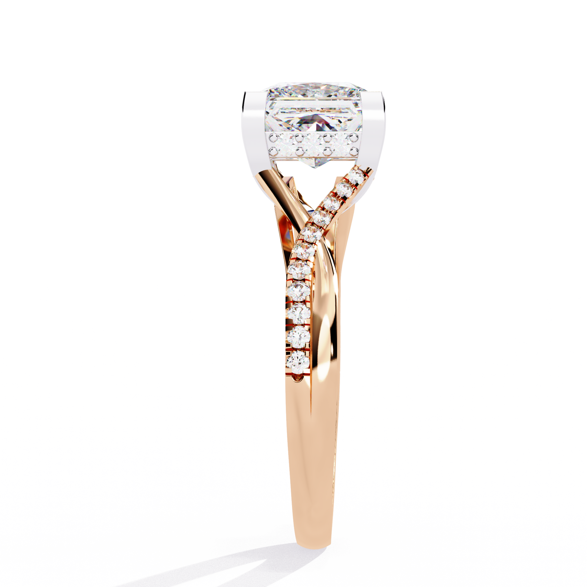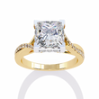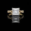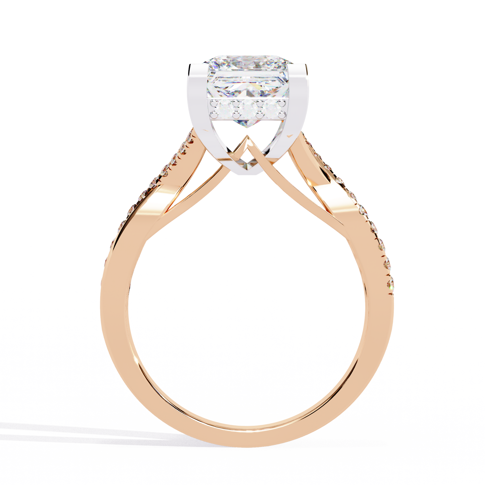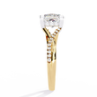 This ring features a luminous Princess-cut diamond held in a modern, four-prong setting that beautifully contrasts with its warm gold band. The band itself splits gracefully and is adorned with a delicate trail of pavé diamonds, adding refined sparkle and depth to the design. Blending contemporary elegance with classic luxury, this piece radiates brilliance from every angle.