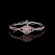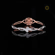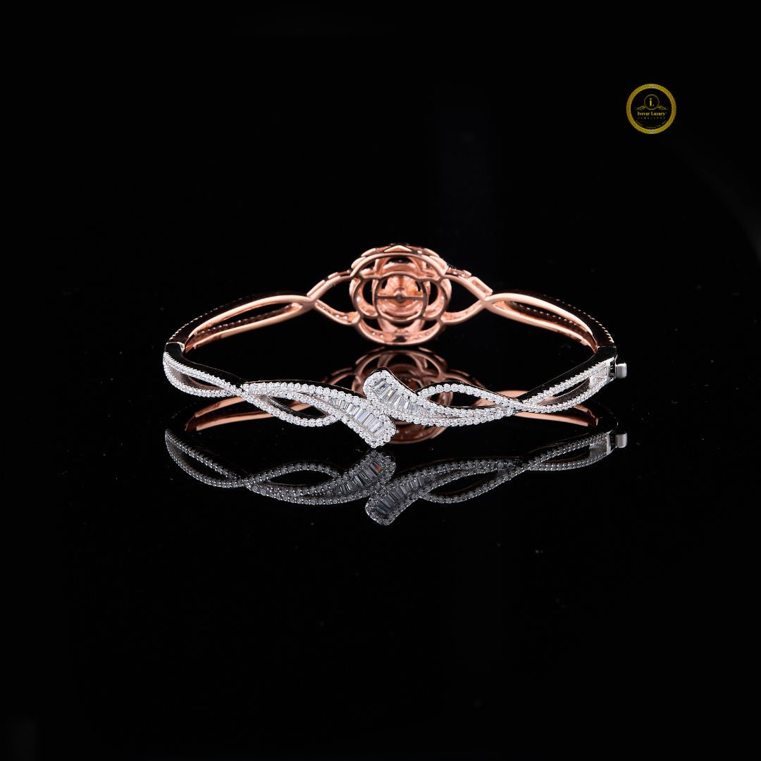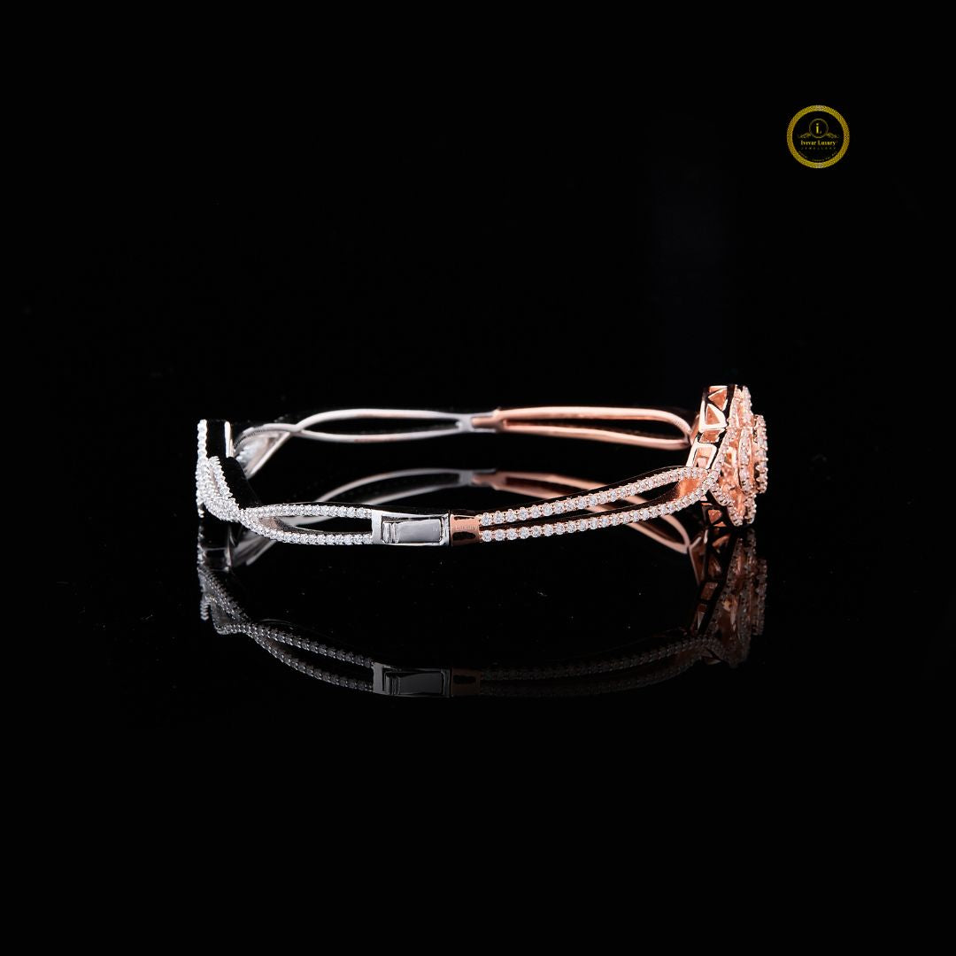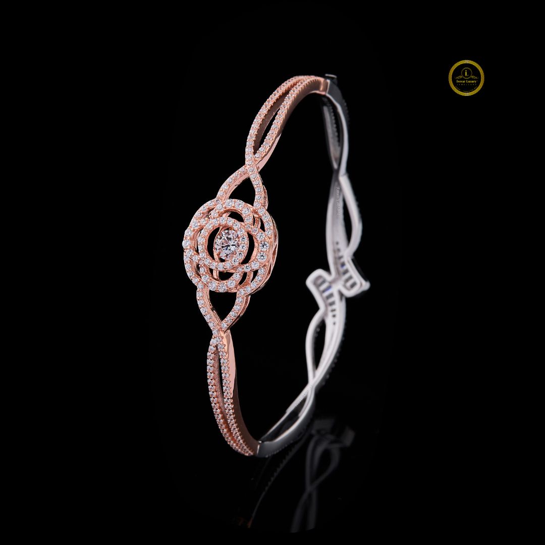 This exquisite bracelet features a radiant floral centerpiece crafted in a two-tone blend of rose and white metal. The intricate petal layers, adorned with shimmering diamonds, create a blooming effect that exudes grace and luxury. With its delicate curves and pavé-set detailing, this bracelet brings refined elegance to any look, perfect for special occasions or everyday sophistication.
