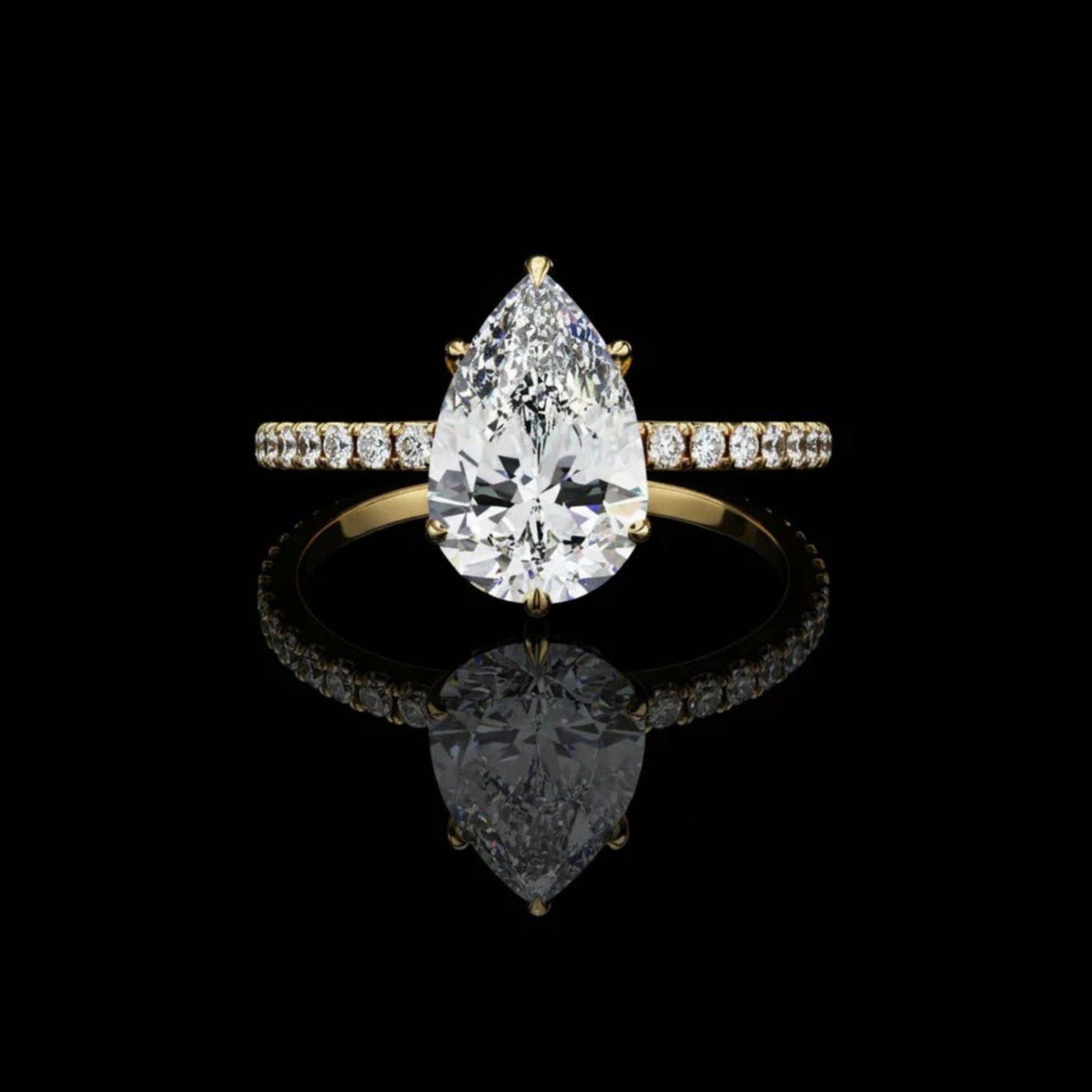 Introducing the exquisite Ivevar Luxury Pear Cut Diamond Ring, designed for lovers of unique elegance and refined craftsmanship. This masterpiece showcases a dazzling pear-cut center diamond, admired for its tear-drop shape, exceptional brilliance, and visually elongated appearance. The sleek solid gold band is beautifully accented with micro-pavé diamonds, adding extra sparkle, radiance, and depth to the design.