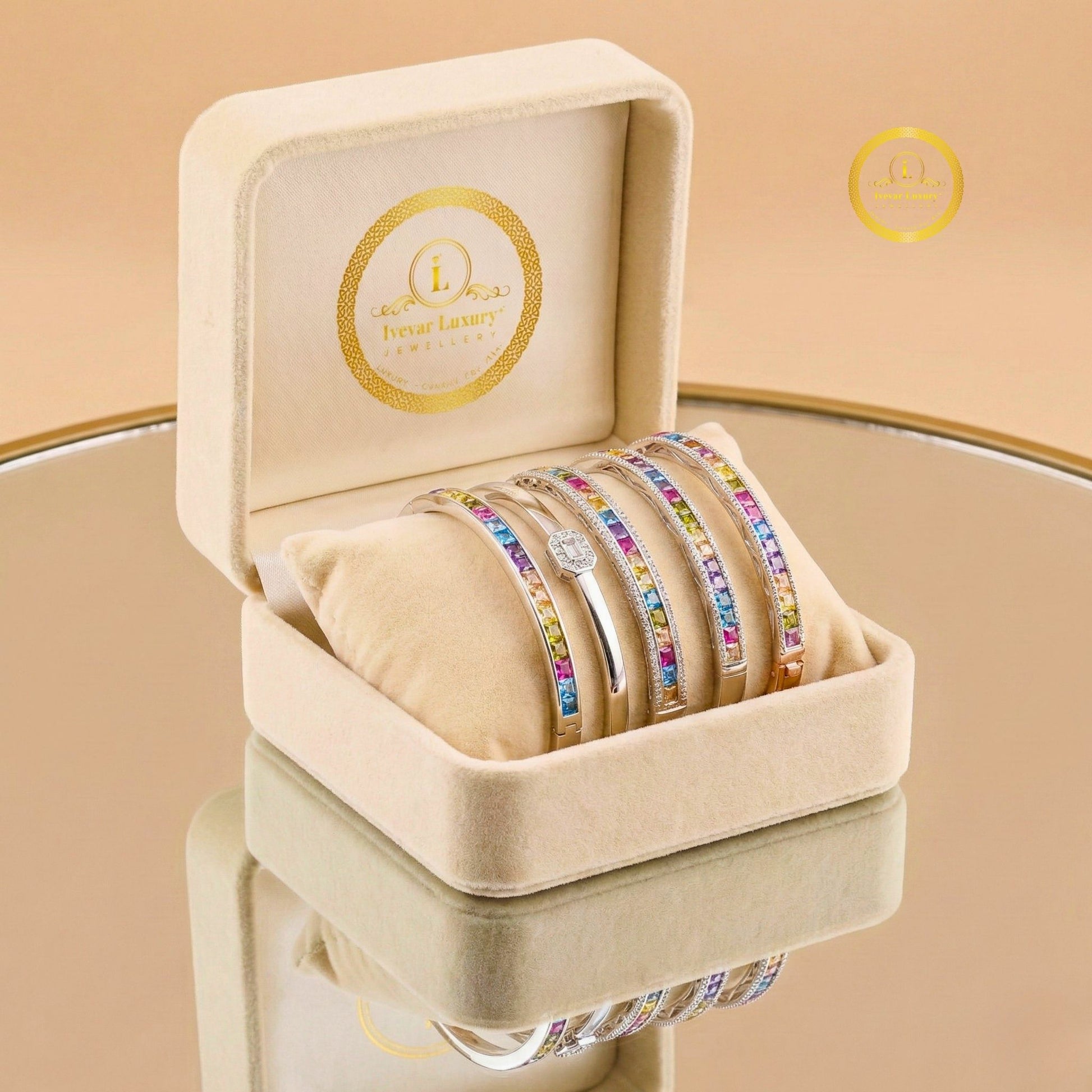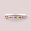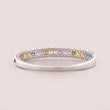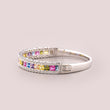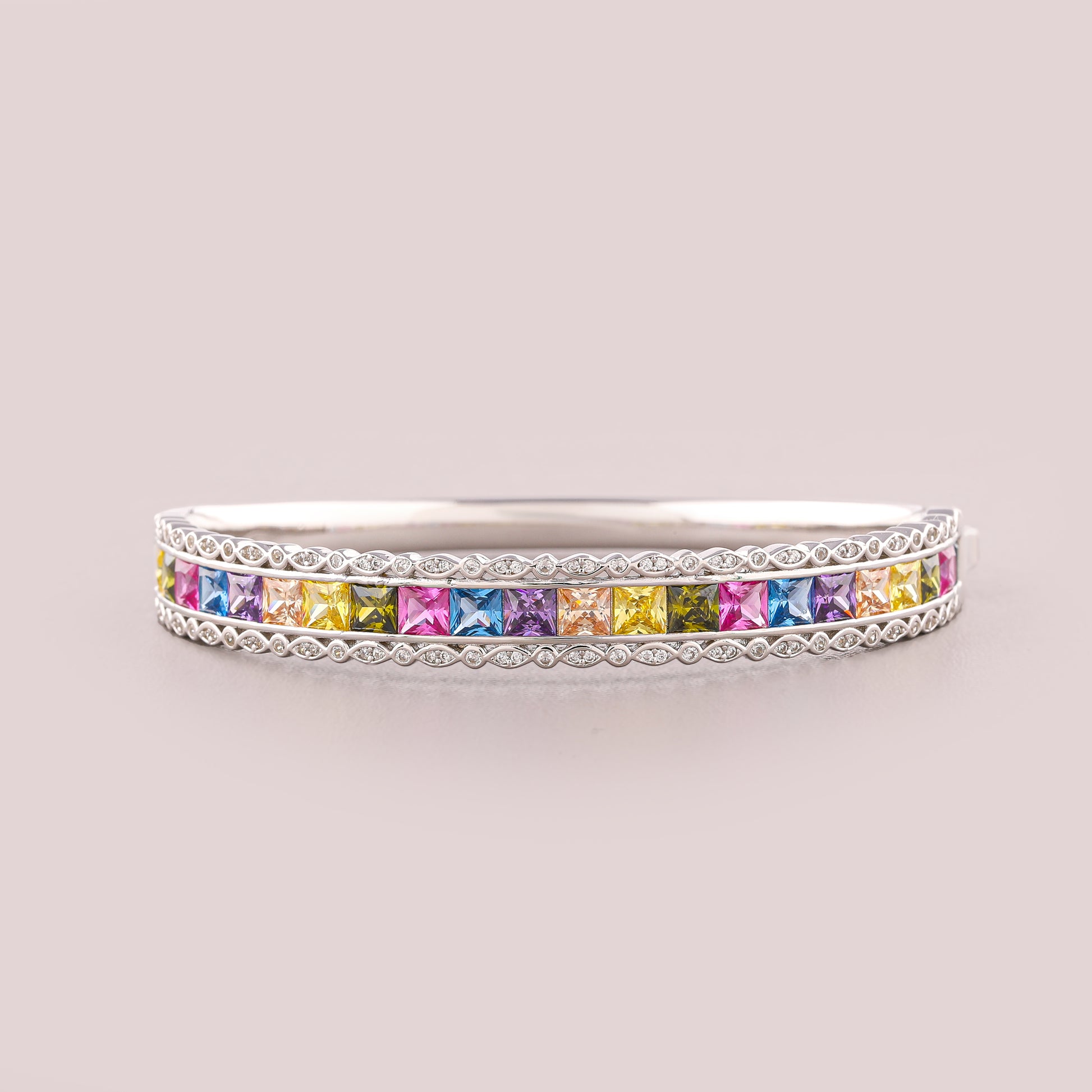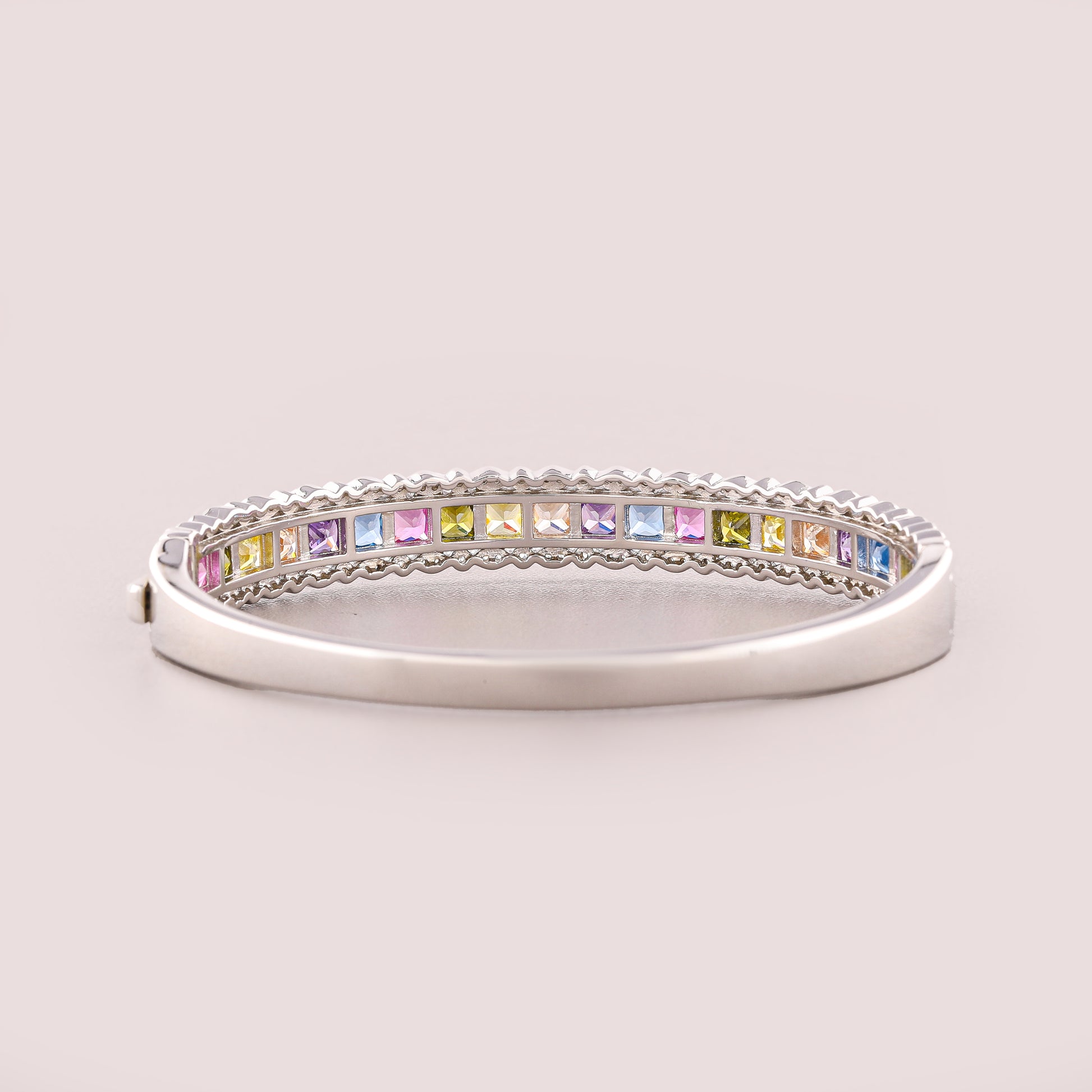 This elegant hinged bangle bracelet showcases a prominent single line of vividly colored, natural gemstones, likely sapphires, cut into a uniform princess-cut (square) shape. The stones are set in an alternating or graduating spectrum, creating a dynamic rainbow effect including yellow, pink, blue, and purple hues.