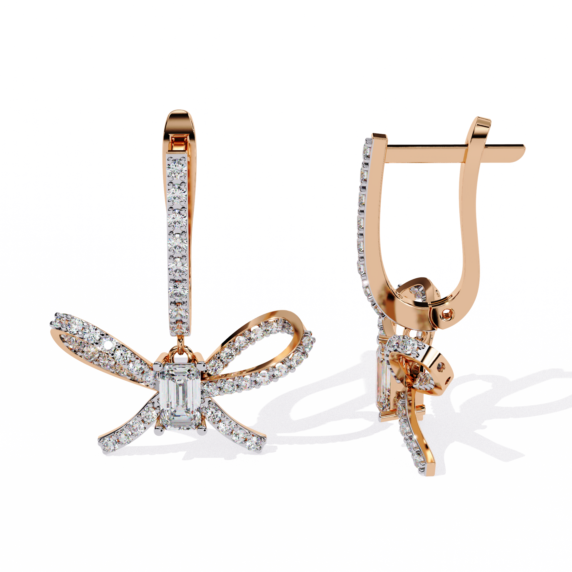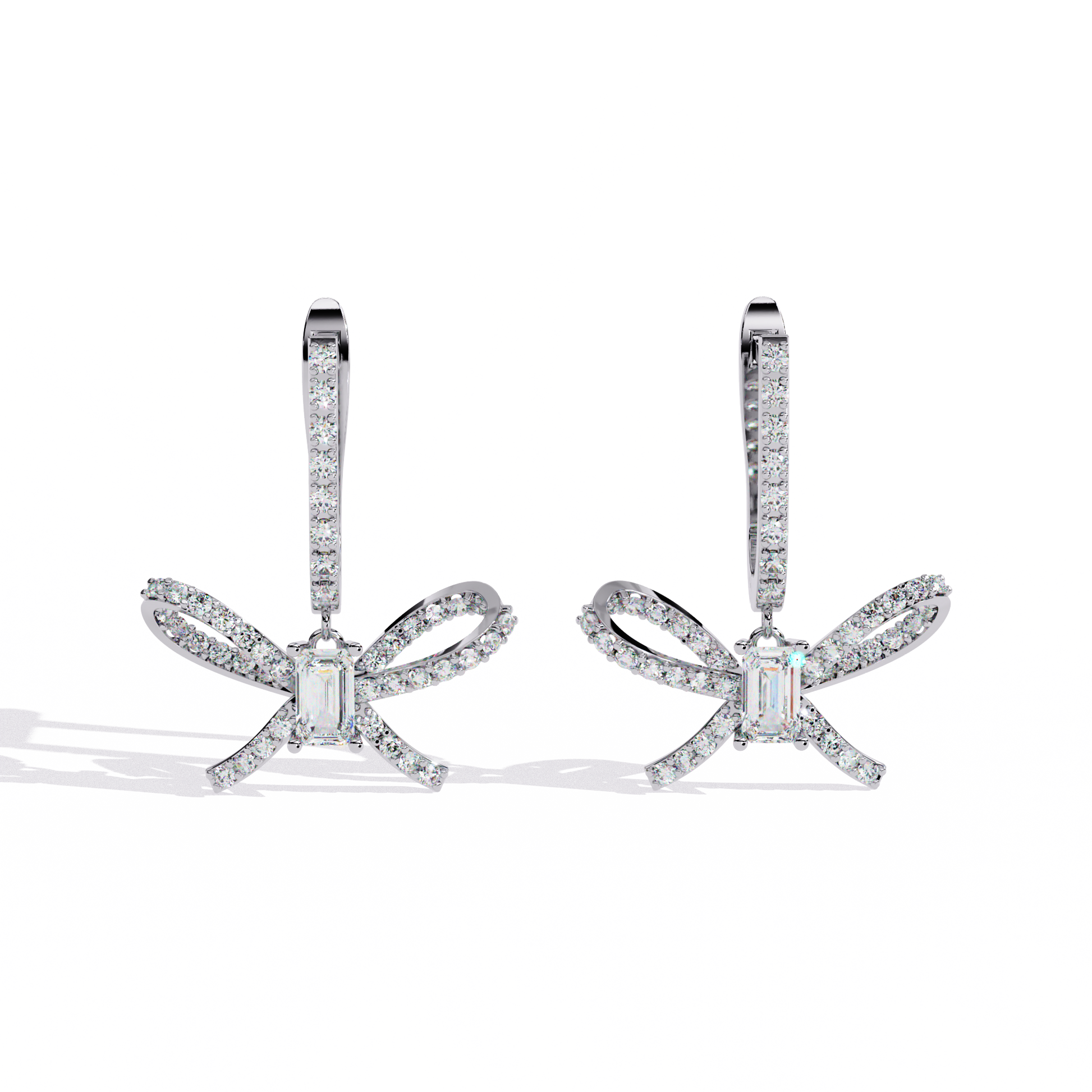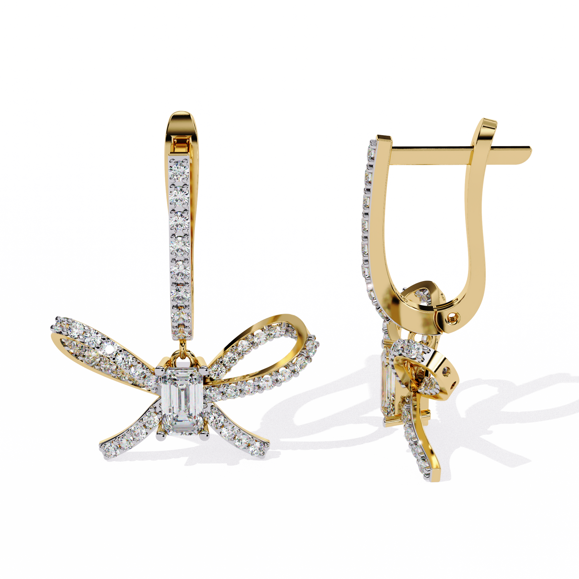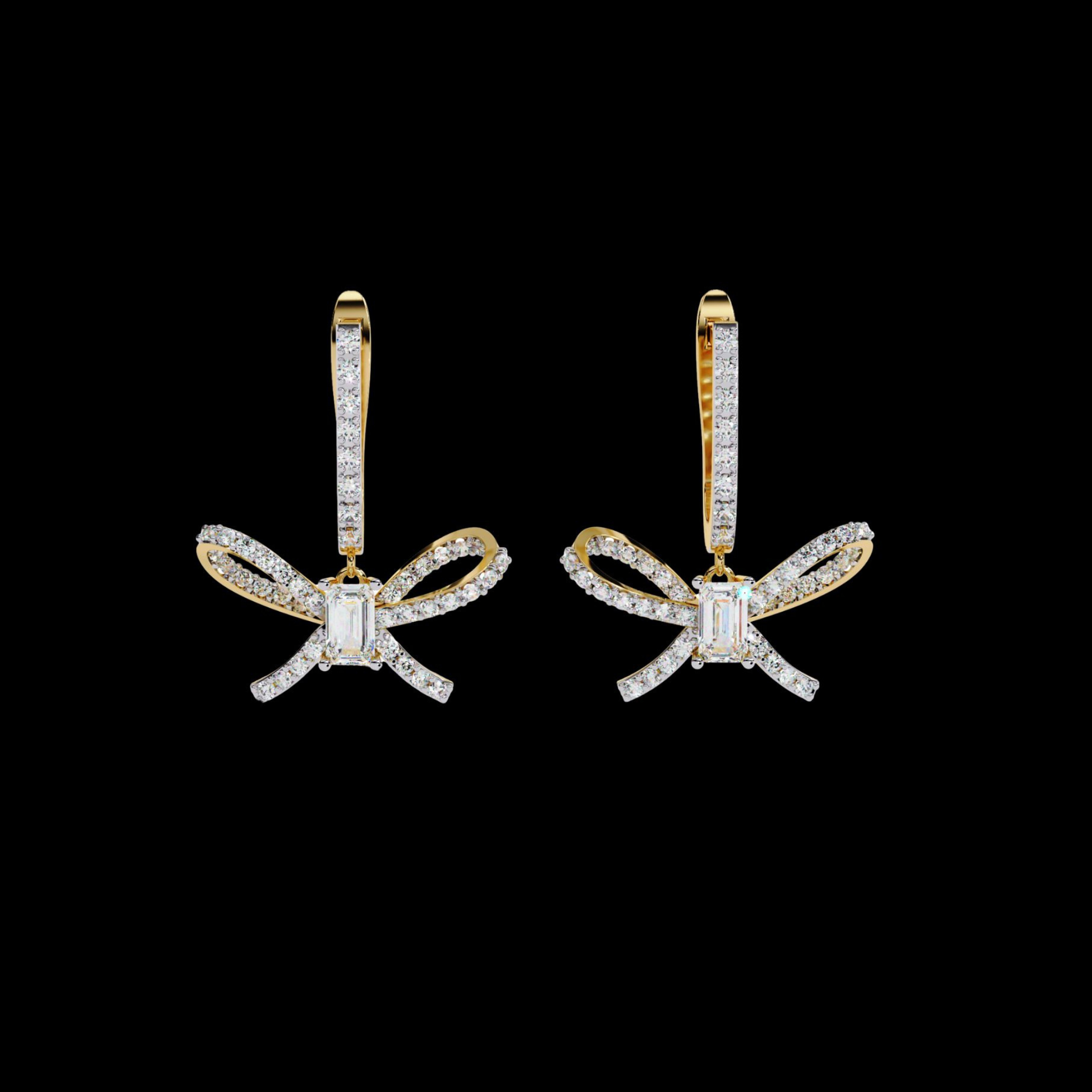 The Diamond Bow Elegance Drop Earrings by Ivevar Luxury Jewels embody grace, charm, and refined luxury. Crafted in brilliant yellow gold, each earring showcases a delicate bow silhouette adorned with pavé-set diamonds, symbolizing femininity and timeless allure. At the center rests a striking emerald-cut diamond, adding a touch of modern sophistication and radiant brilliance. Suspended from a sleek diamond-encrusted drop, these earrings move gracefully with every turn.