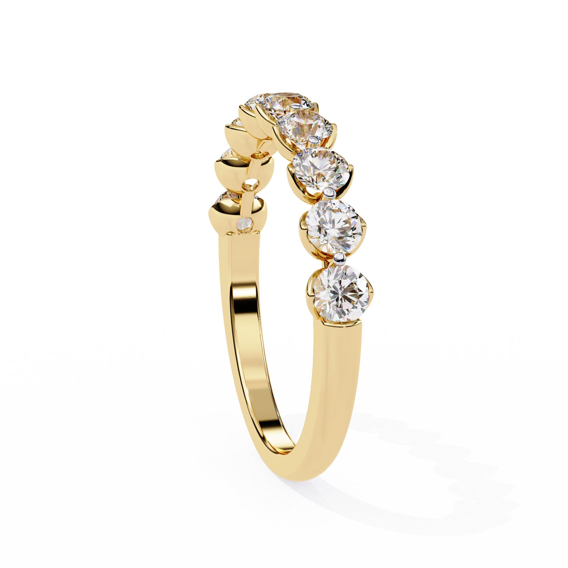 This exquisite seven-stone ring features brilliant round diamonds set in a band, offering a sleek and timeless design. The diamonds are perfectly aligned to create a continuous flow of sparkle, making it a captivating piece for any occasion. Each stone is carefully chosen for its clarity and brilliance, while the setting adds warmth and sophistication. Whether as an anniversary gift, engagement ring, or a classic addition to your jewelry collection, this piece exudes both luxury and elegance.