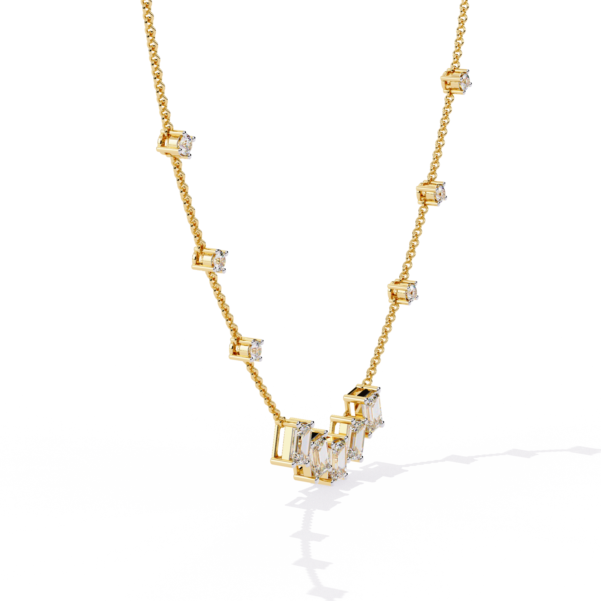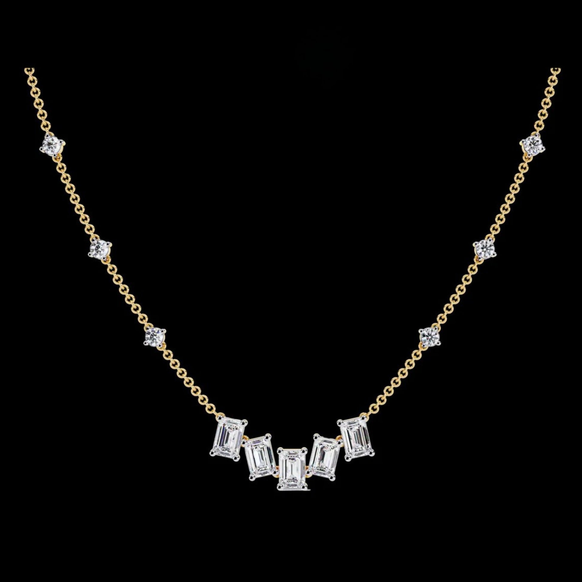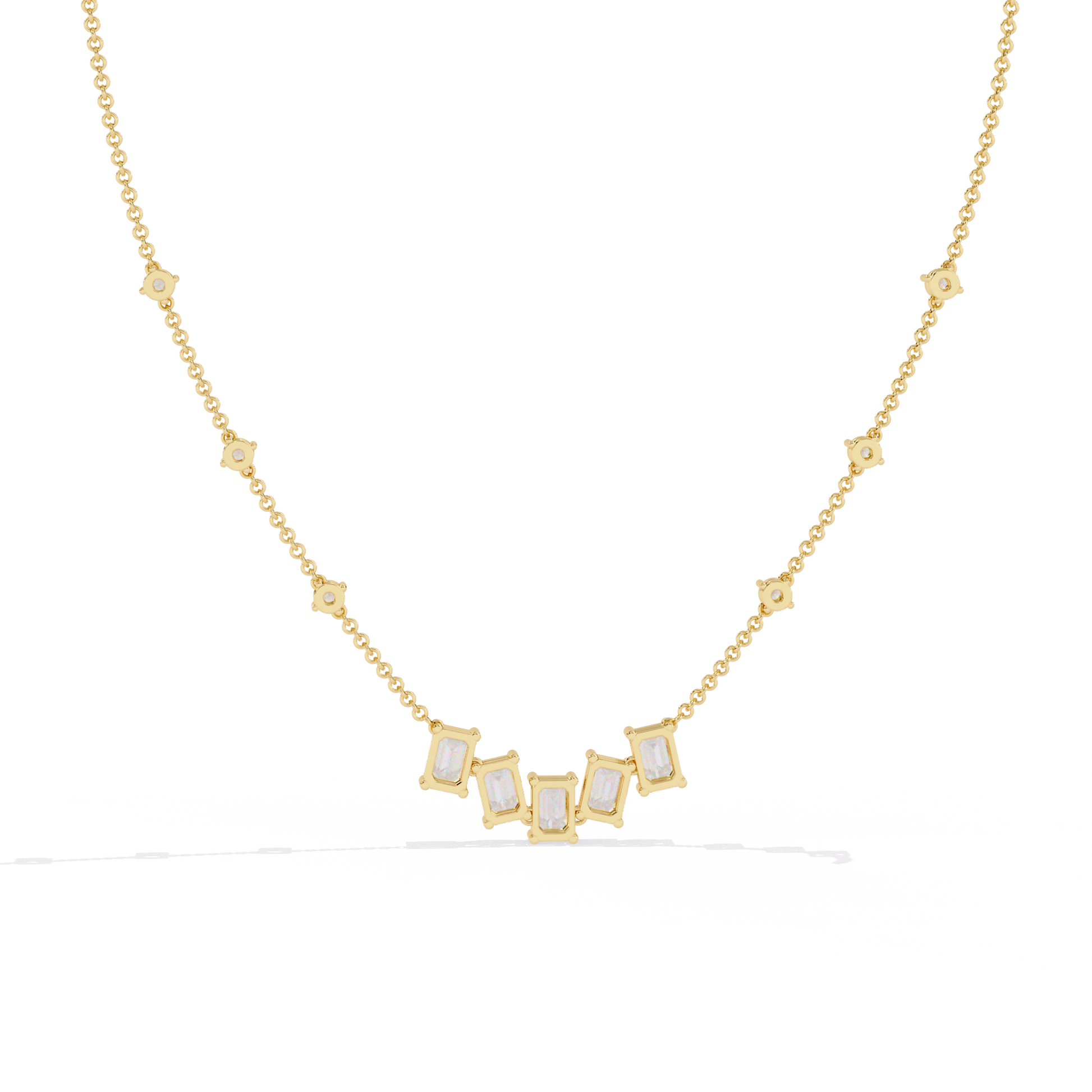 This necklace features a refined gold chain adorned with evenly spaced round diamonds that lead to a striking arrangement of emerald-cut diamonds at the center, creating a graceful balance of sparkle and sophistication. The geometric brilliance of the emerald stones contrasts beautifully with the softer shimmer of the round accents, giving the piece a modern yet timeless elegance. Its delicate structure and radiant detailing make it an ideal accessory for both everyday luxury and special occasions by Ivevar.
