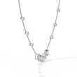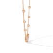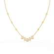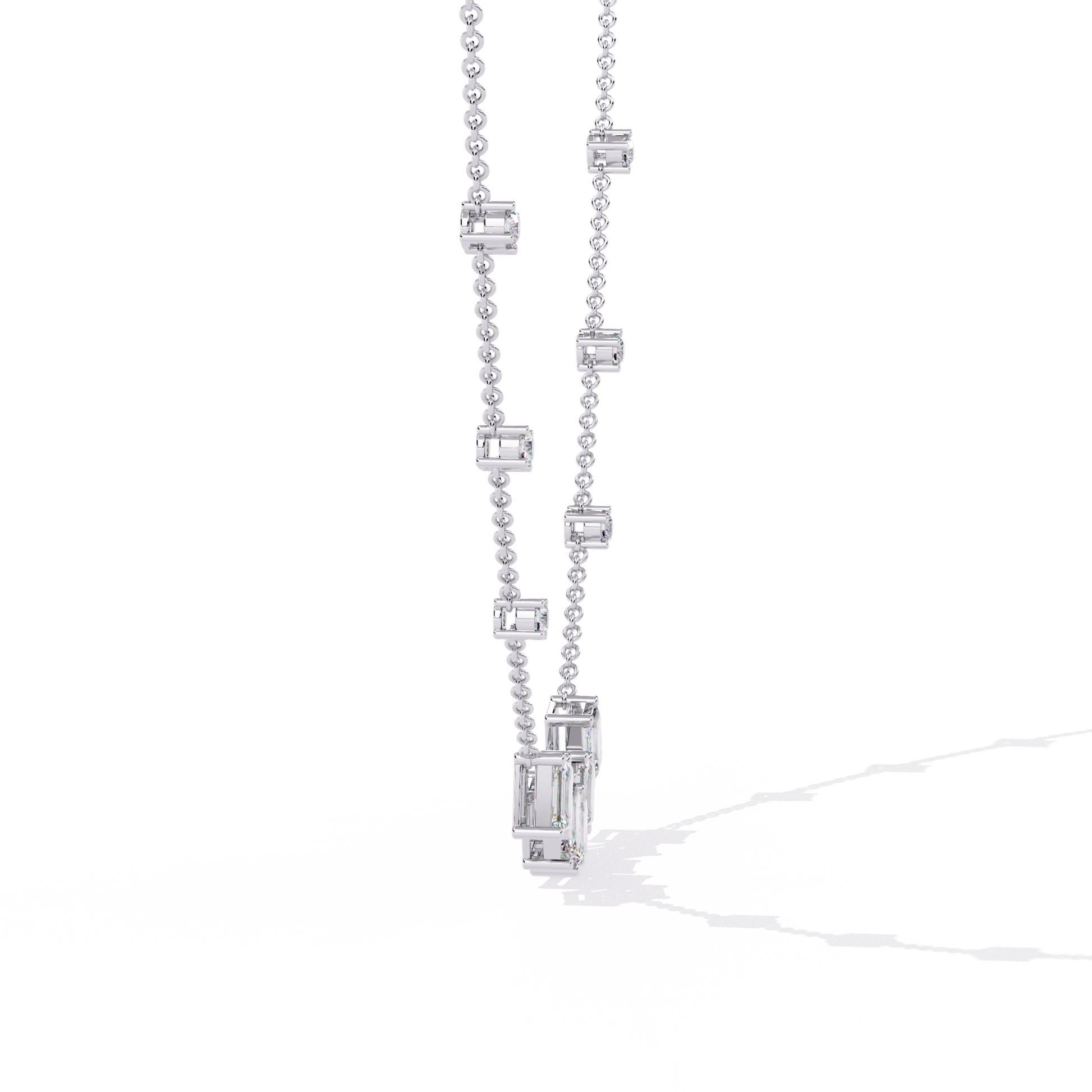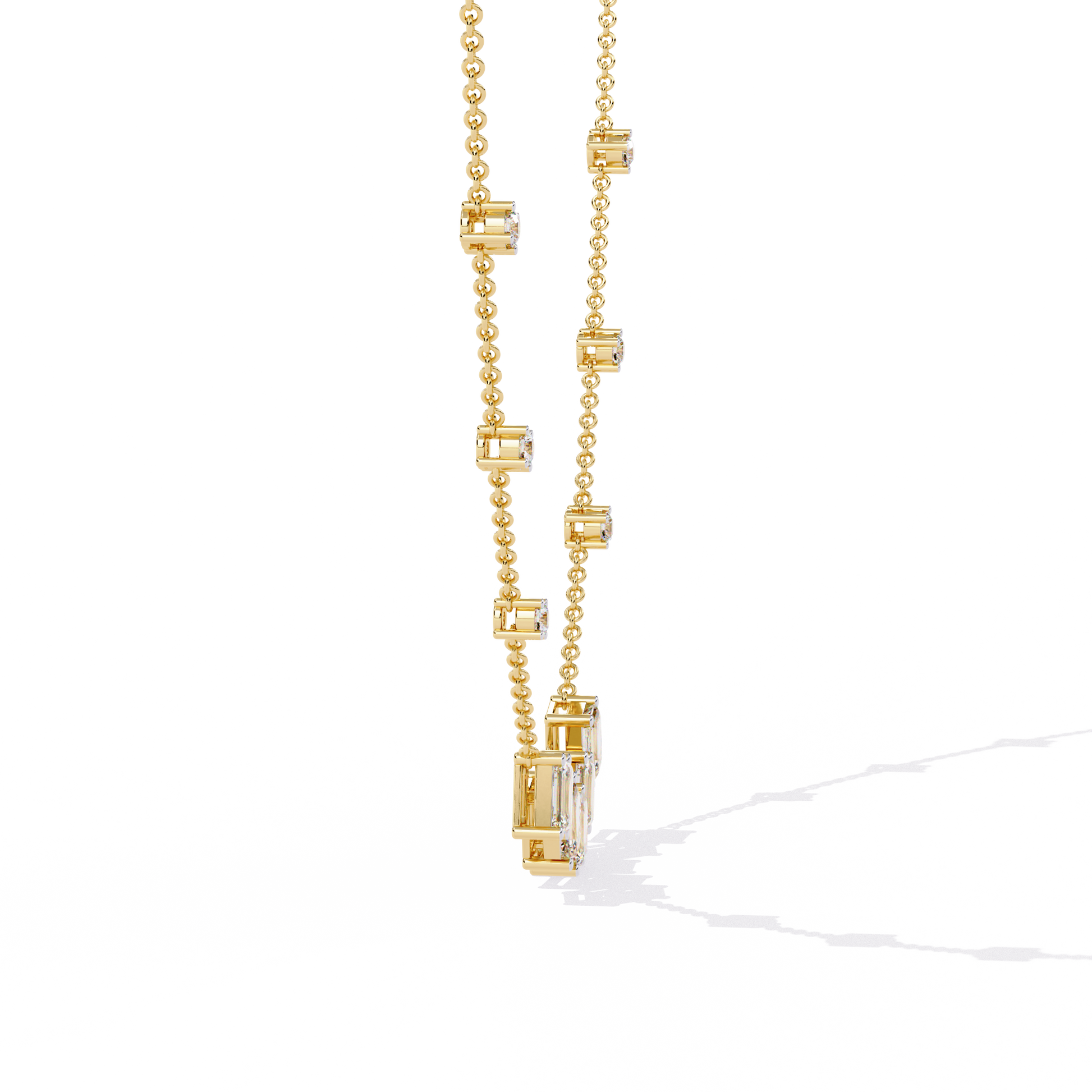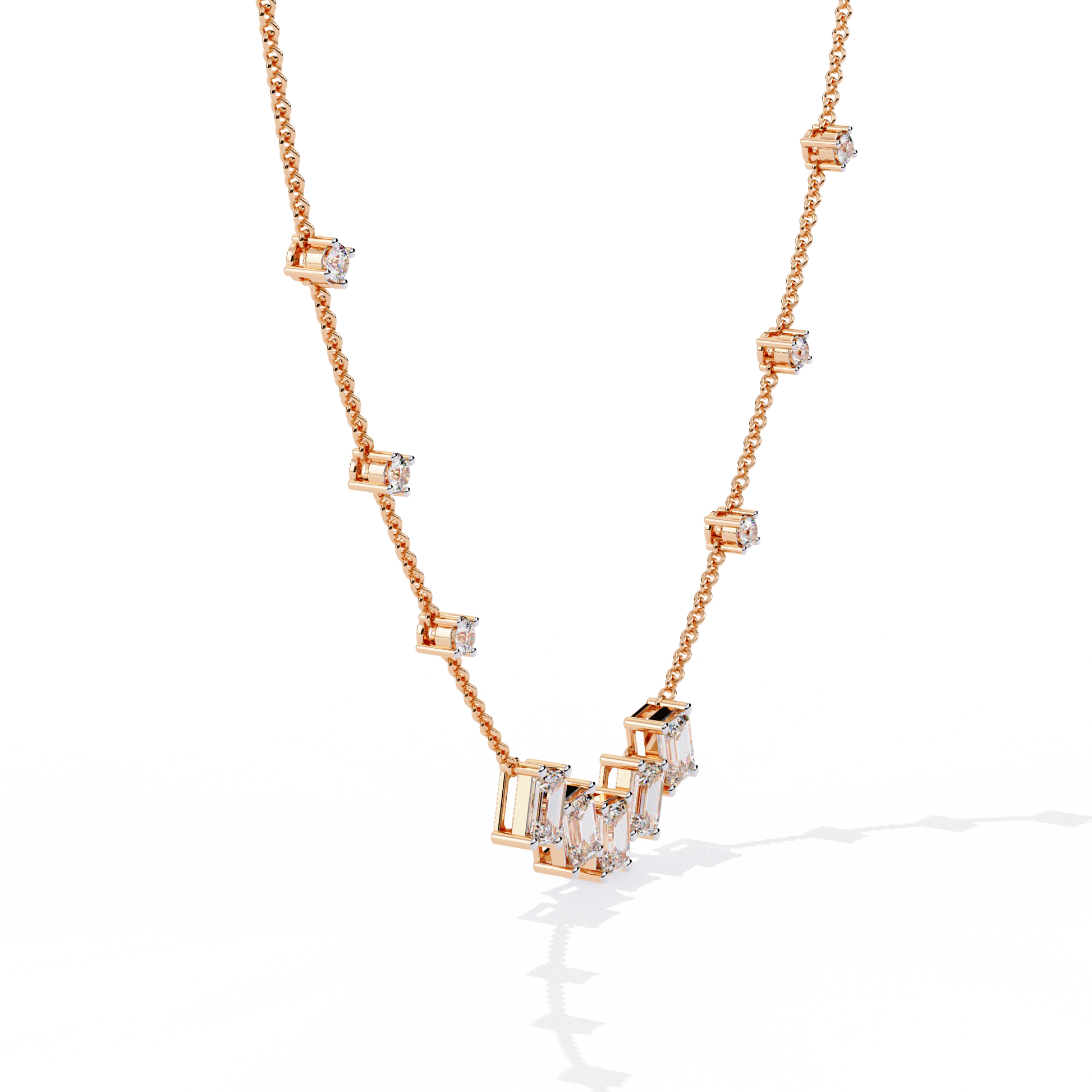 This necklace features a refined gold chain adorned with evenly spaced round diamonds that lead to a striking arrangement of emerald-cut diamonds at the center, creating a graceful balance of sparkle and sophistication. The geometric brilliance of the emerald stones contrasts beautifully with the softer shimmer of the round accents, giving the piece a modern yet timeless elegance. Its delicate structure and radiant detailing make it an ideal accessory for both everyday luxury and special occasions by Ivevar.