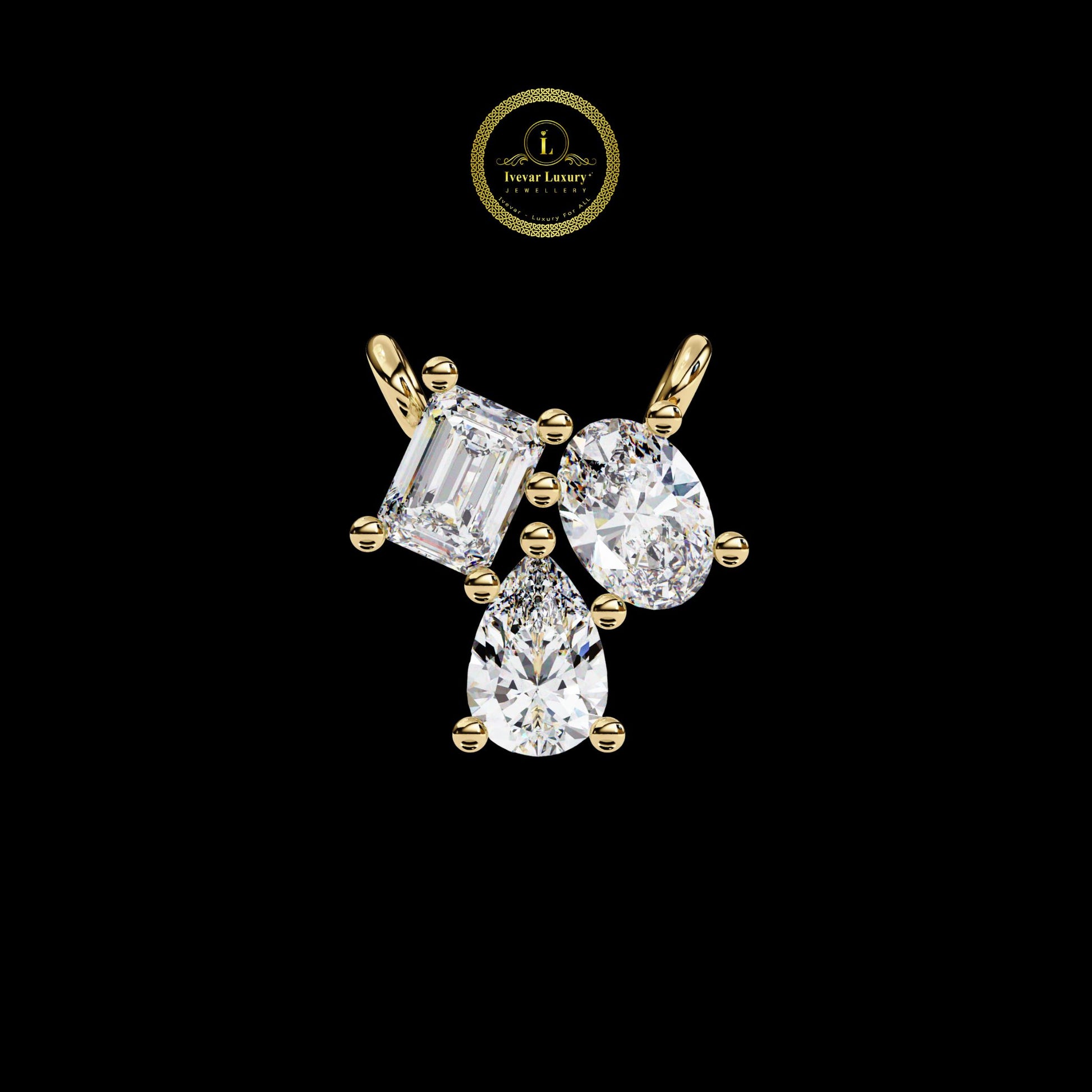 This exquisite pendant trio showcases a stunning combination of diamond cuts - Emerald, Oval, and Pear—each set in polished gold prongs that enhance their brilliance and individuality. The interplay of geometric precision and organic curves creates a captivating balance of elegance and modern artistry. Radiating with exceptional sparkle and craftsmanship, this pendant design embodies luxury and sophistication, making it a perfect statement piece for those who appreciate distinctive beauty by Ivevar Luxury.