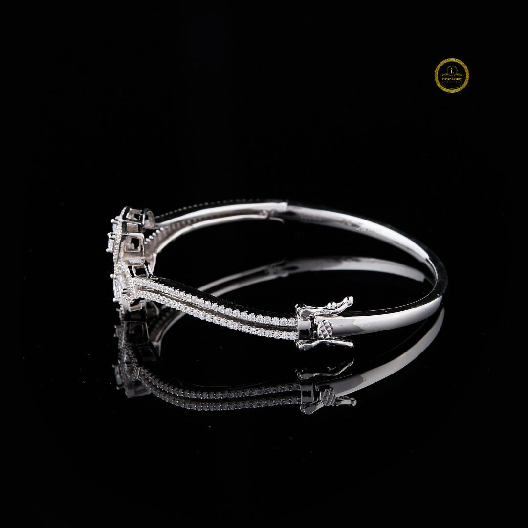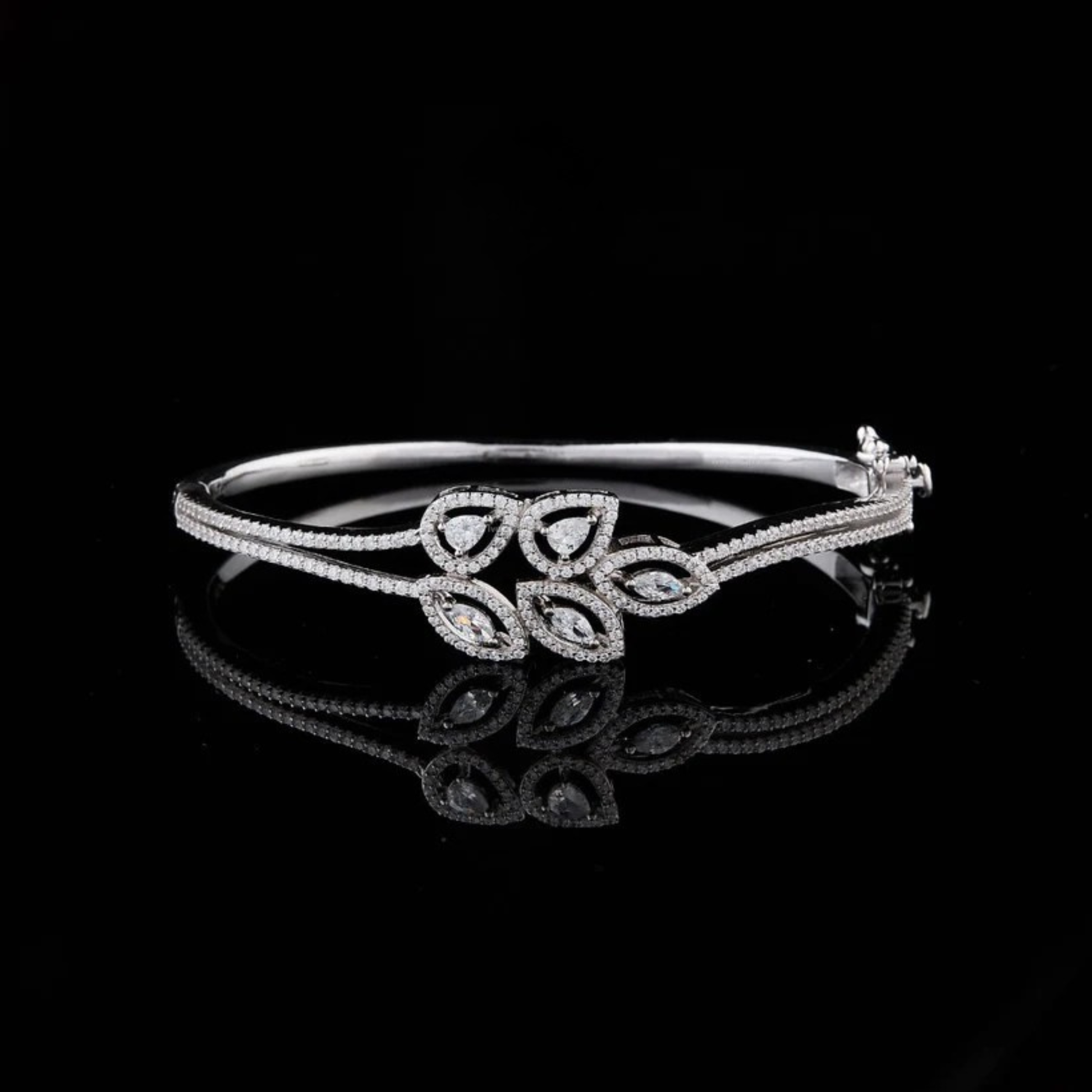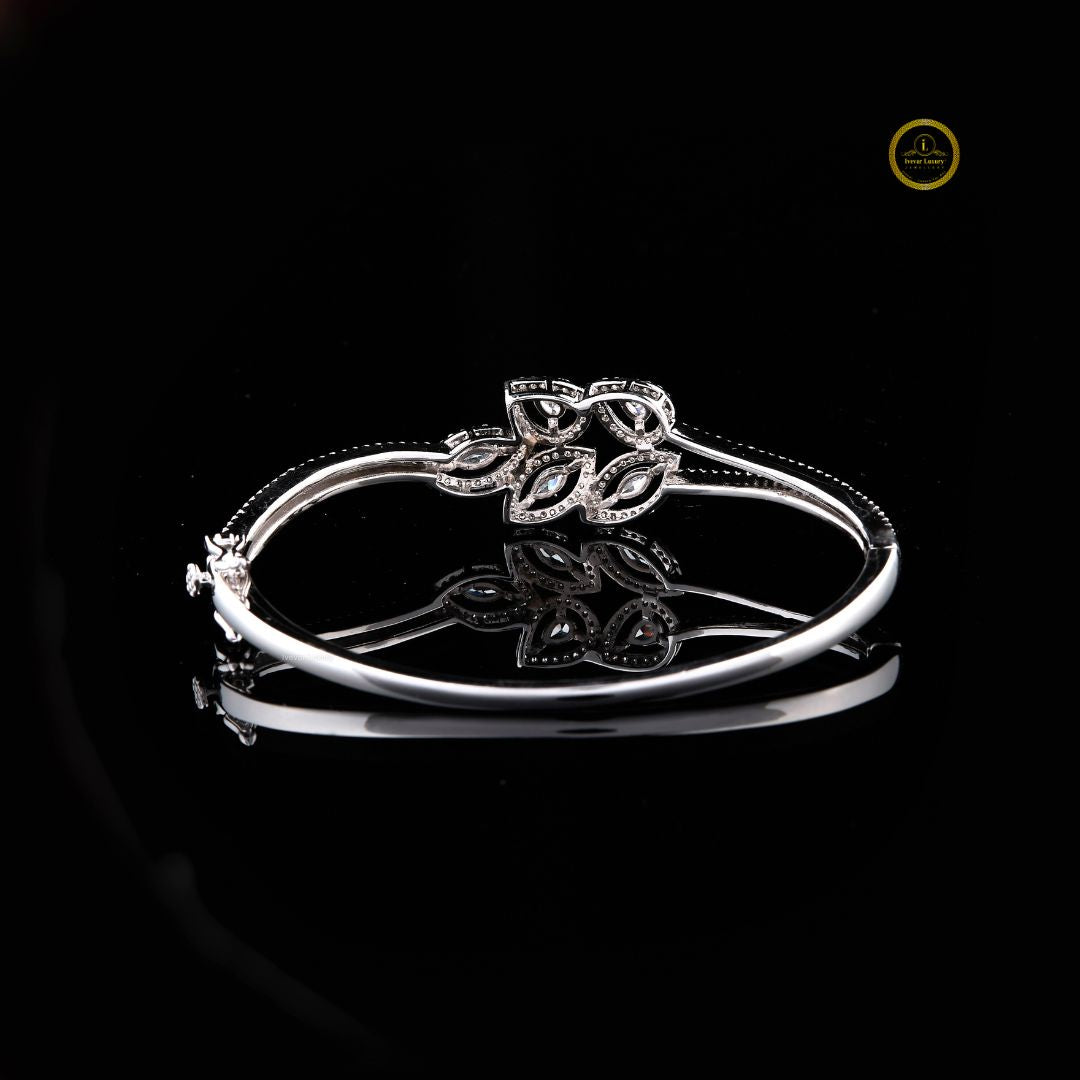 This elegant bracelet features a sophisticated, nature-inspired design crafted from polished metal and adorned with shimmering stones. At its center, a graceful arrangement of pear- and marquise-shaped motifs creates a delicate floral pattern, each outlined with fine pavé detailing that enhances its brilliance. The slender, twin-band structure adds a refined touch, balancing subtlety with luxury, while the high-quality craftsmanship gives it a timeless, versatile appeal. Perfect for formal occasions or elevating everyday style, this bracelet exudes both grace and understated glamour by Ivevar.
