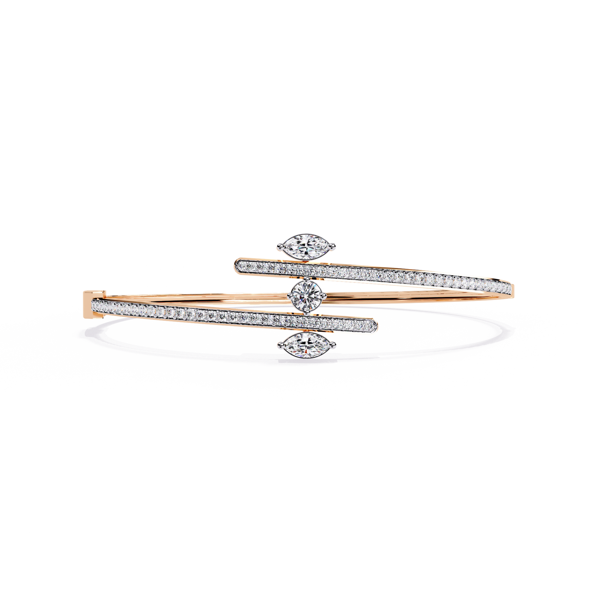 This luxurious bangle showcases a modern dual-line design, crafted from. Each band is pavé-set with dazzling round diamonds, highlighting the bracelet’s graceful curve. The centerpiece features a trio of round brilliant-cut diamonds—a round diamond framed by two marquise-cut diamonds—creating a perfect balance of elegance and sophistication. Ideal for both special occasions and everyday glamour, this piece embodies timeless beauty with a contemporary twist.