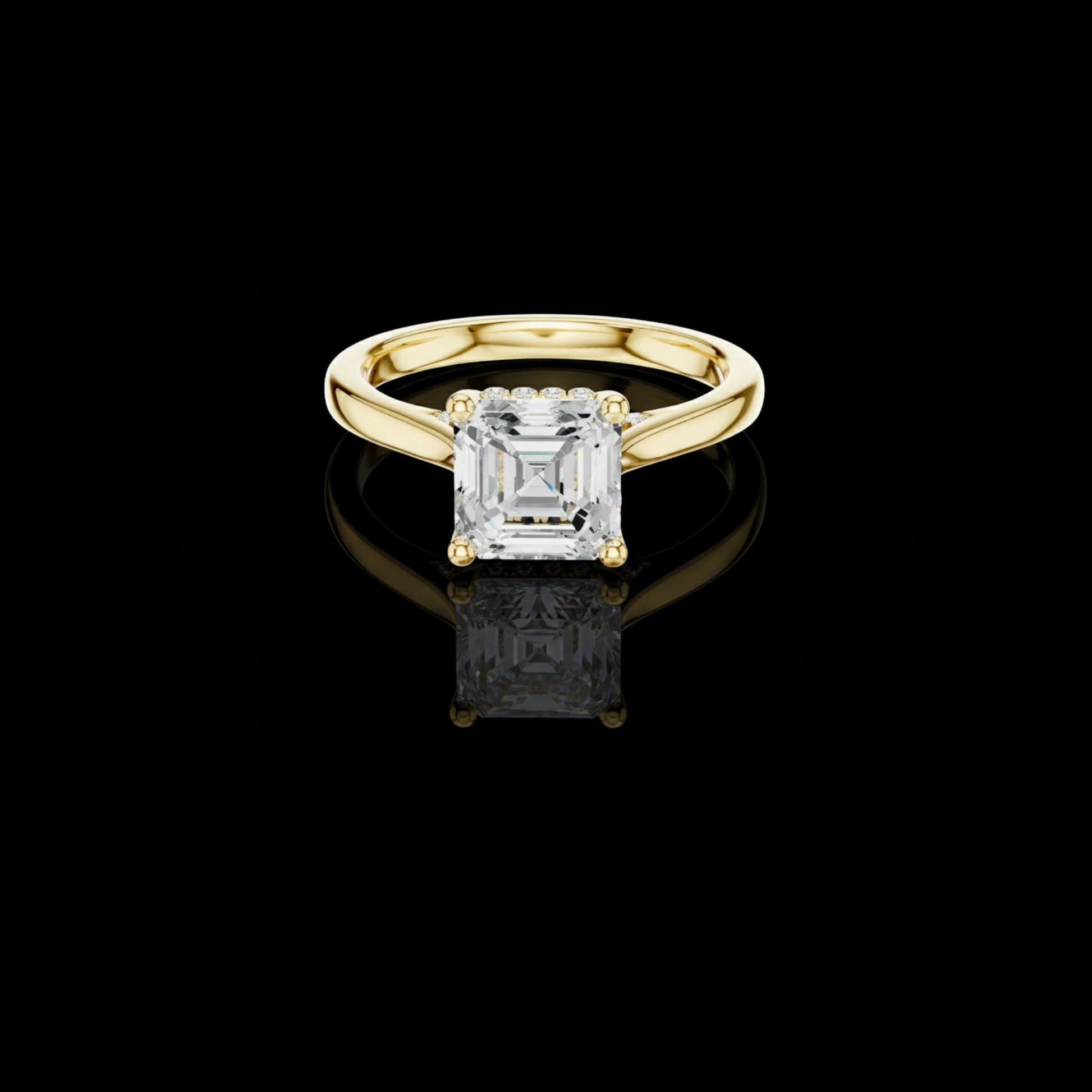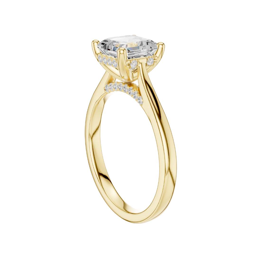 This elegant engagement ring features a striking emerald square-cut diamond set in a classic four-prong mount of polished gold. The clean, geometric facets of the emerald cut create a hall-of-mirrors brilliance, drawing the eye into the stone’s mesmerizing depth. Its smooth, rounded band offers a timeless balance of sophistication and warmth, making this ring a refined expression of enduring love and modern luxury.