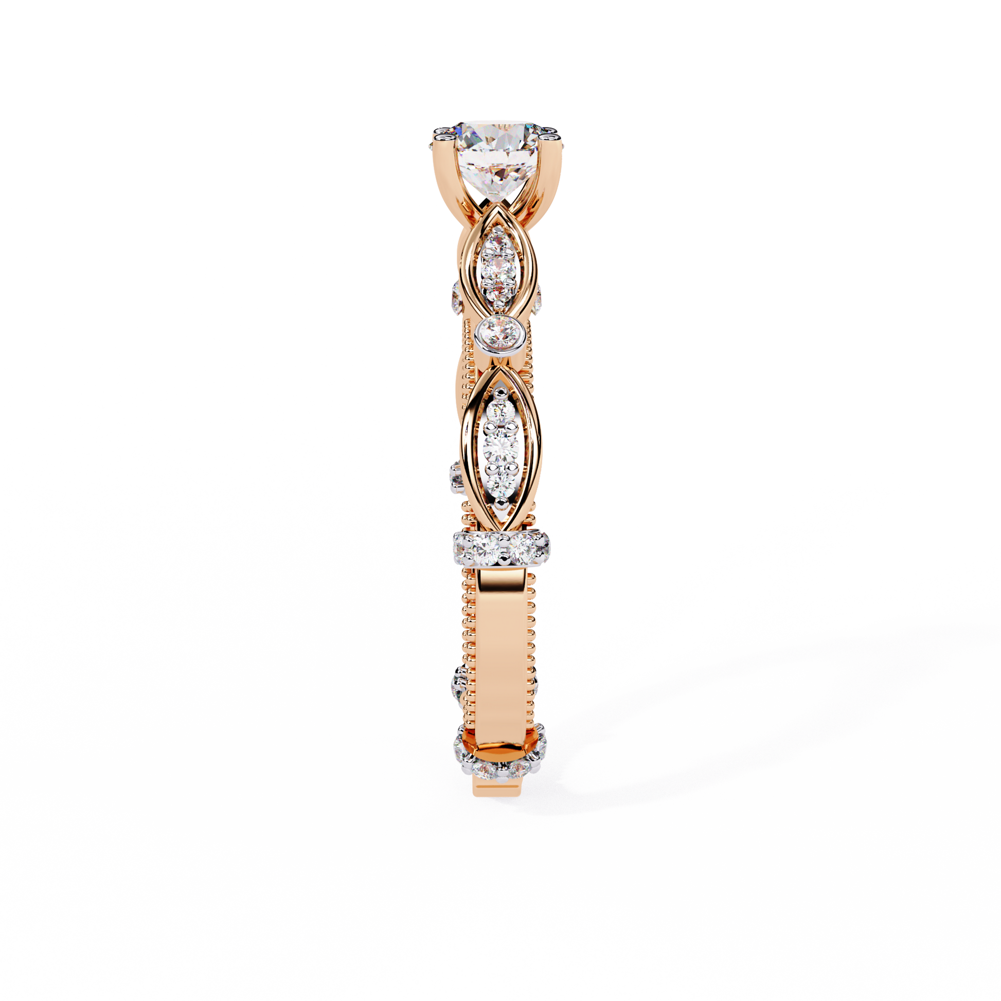 This elegant ring features a captivating round brilliant-cut center diamond set in a classic four-prong mount. The gold band is adorned with alternating round bezel-set diamond accents, creating a vintage aesthetic rich with detail and charm. Intricate milgrain edging enhances the antique-inspired design, adding depth and refined craftsmanship. With its timeless sparkle and ornate artistry, this ring offers a perfect blend of sophistication and romantic vintage allure—ideal for engagements or meaningful celebrations.