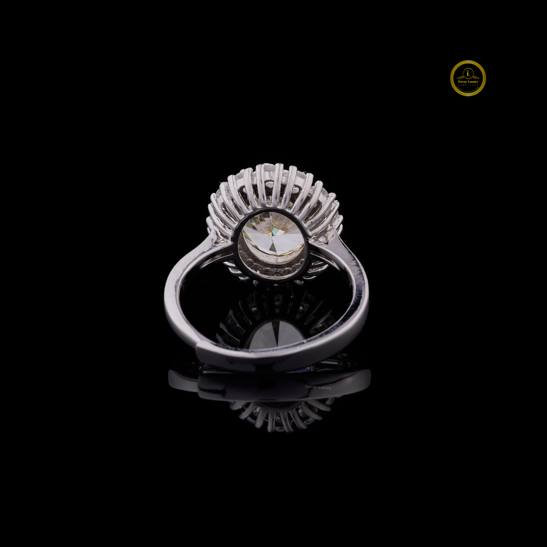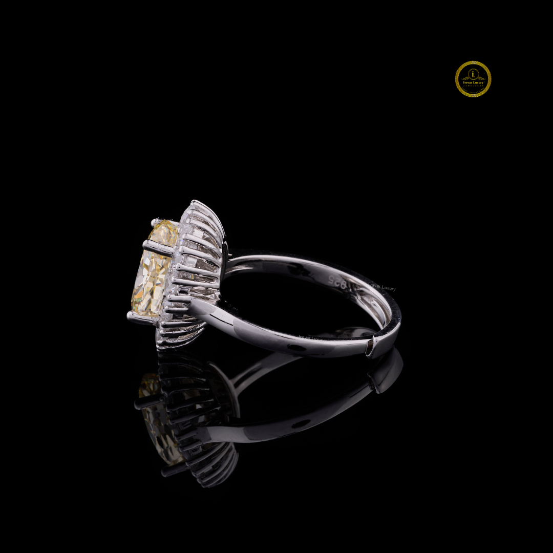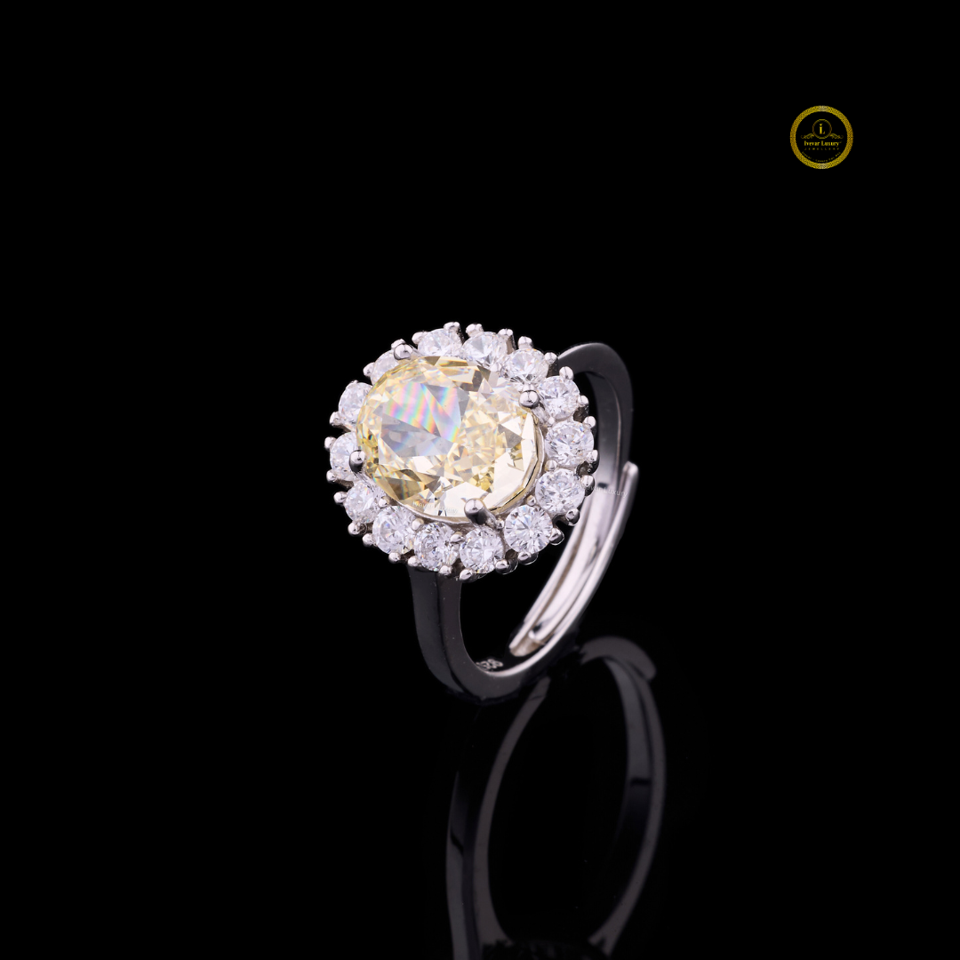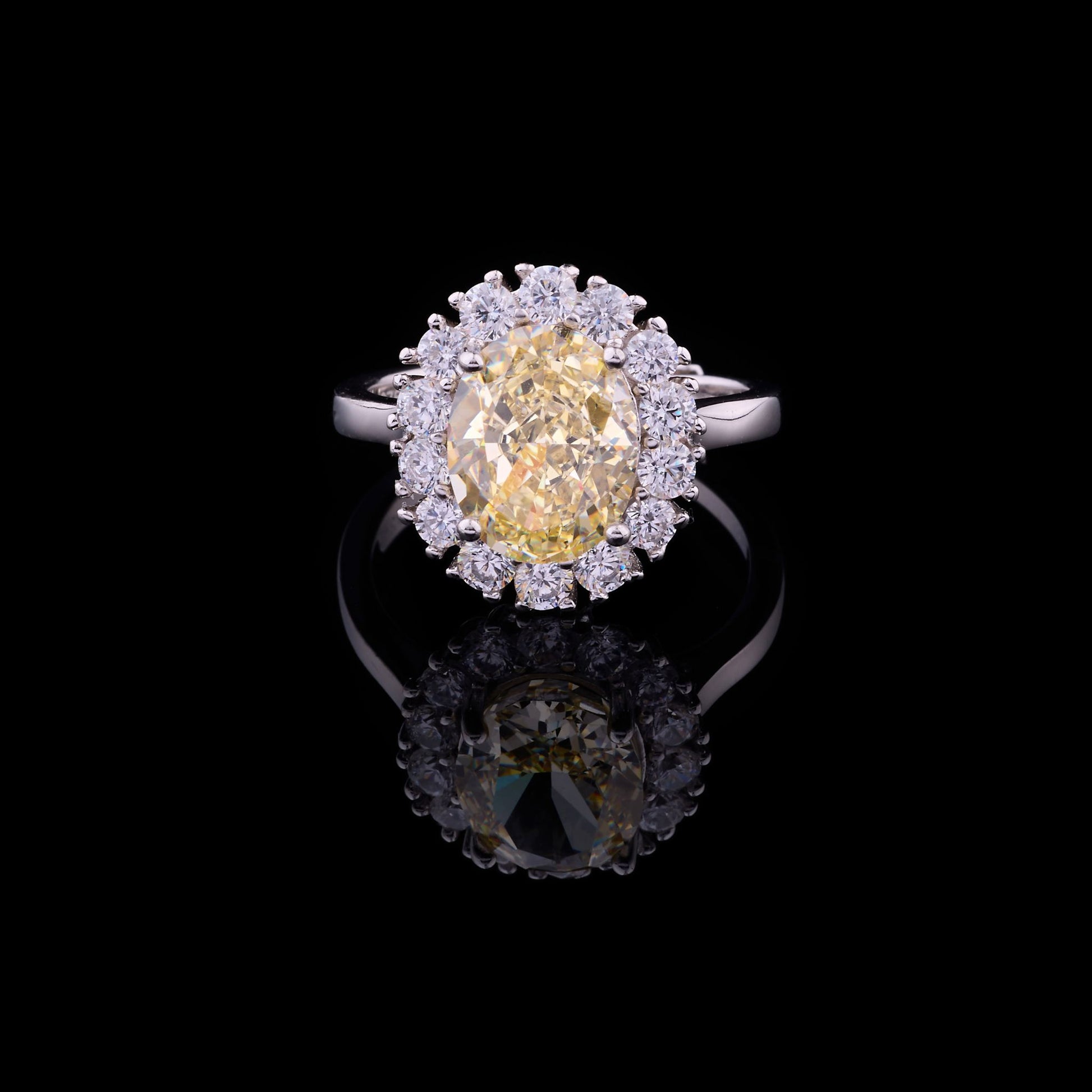A true expression of refined luxury, this oval-cut fancy yellow diamond ring embodies both brilliance and sophistication. The vivid yellow center stone radiates warmth and depth, while a halo of round white diamonds amplifies its luminous beauty. Expertly crafted in high-polish white gold, this masterpiece balances modern glamour with classic elegance. Perfect for those who appreciate rare gemstones, exceptional craftsmanship, and unforgettable sparkle, this ring is a timeless symbol of grace and individuality.