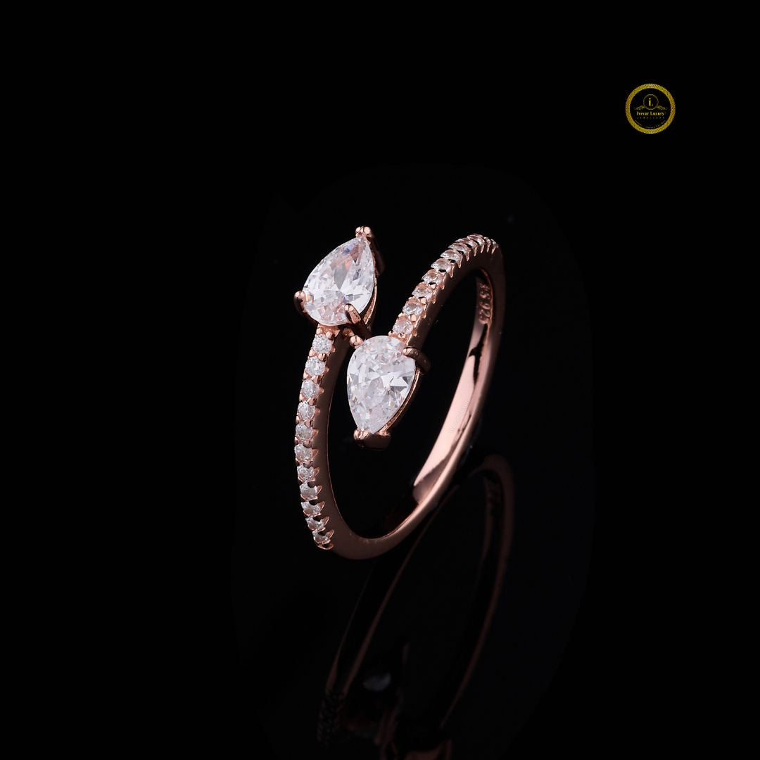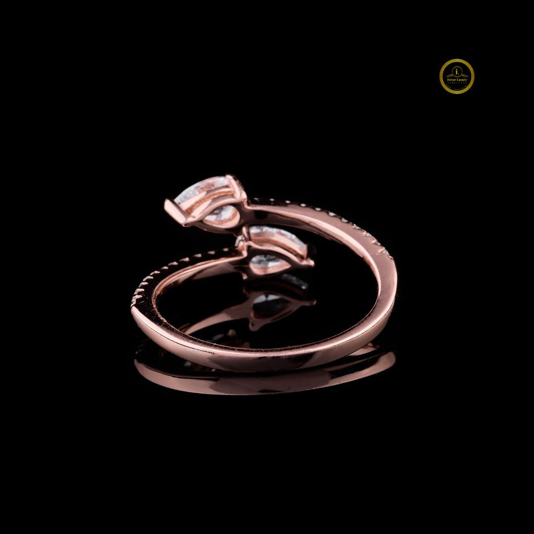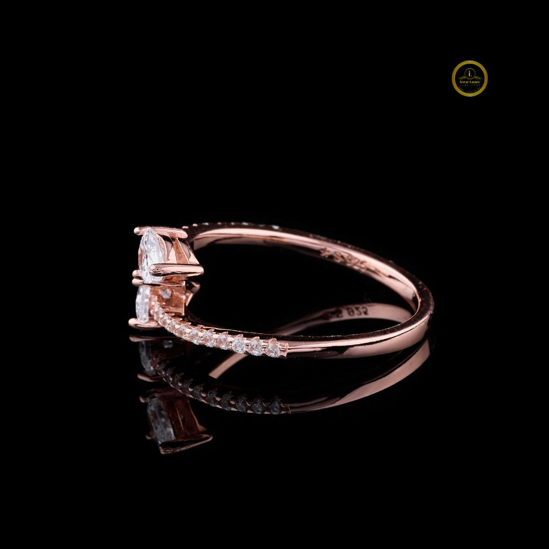0.50 CT Sparkling Rose Gold Lab Grown Diamond Ring with Twin Pear-Shaped Sparkling Stones and Pave Diamond Band