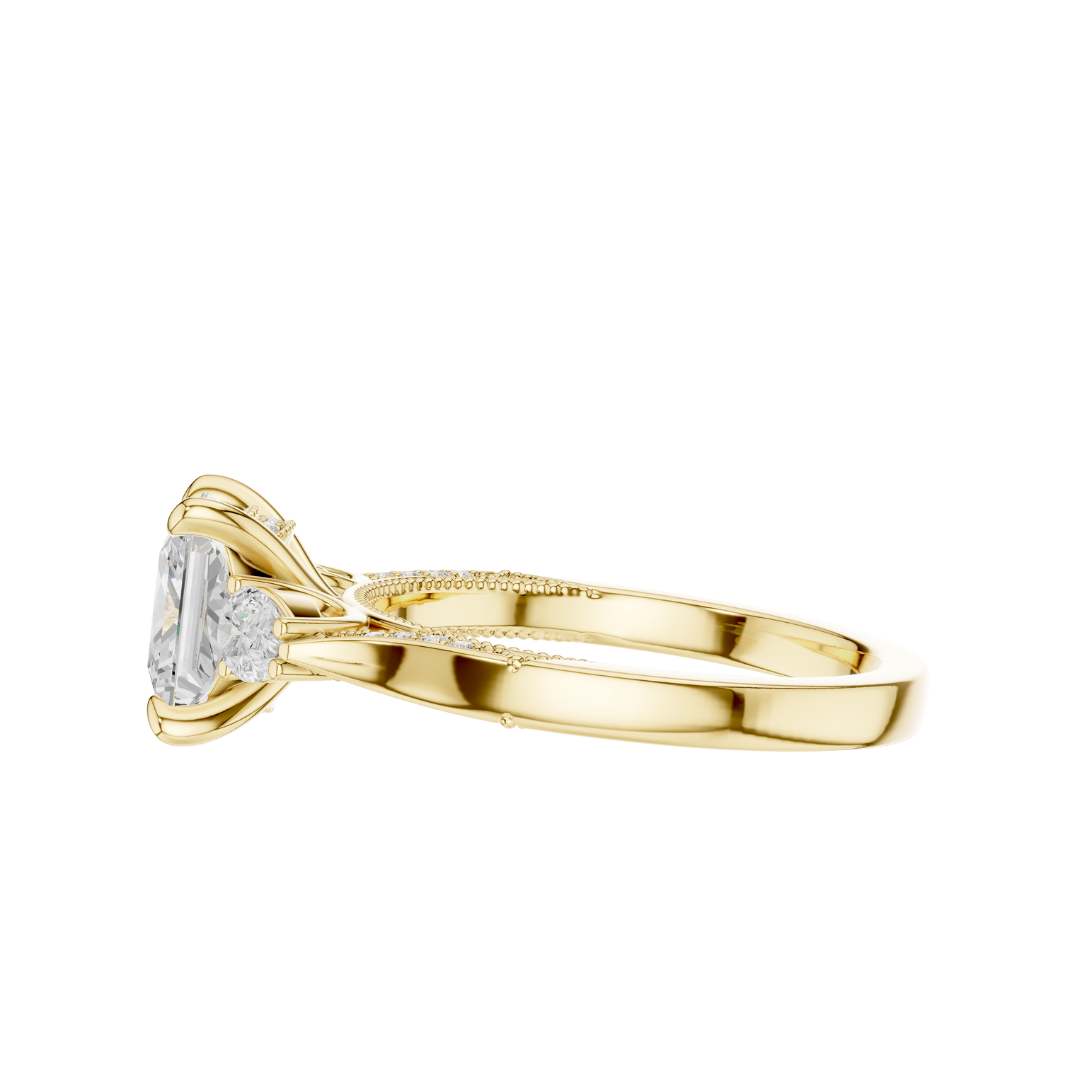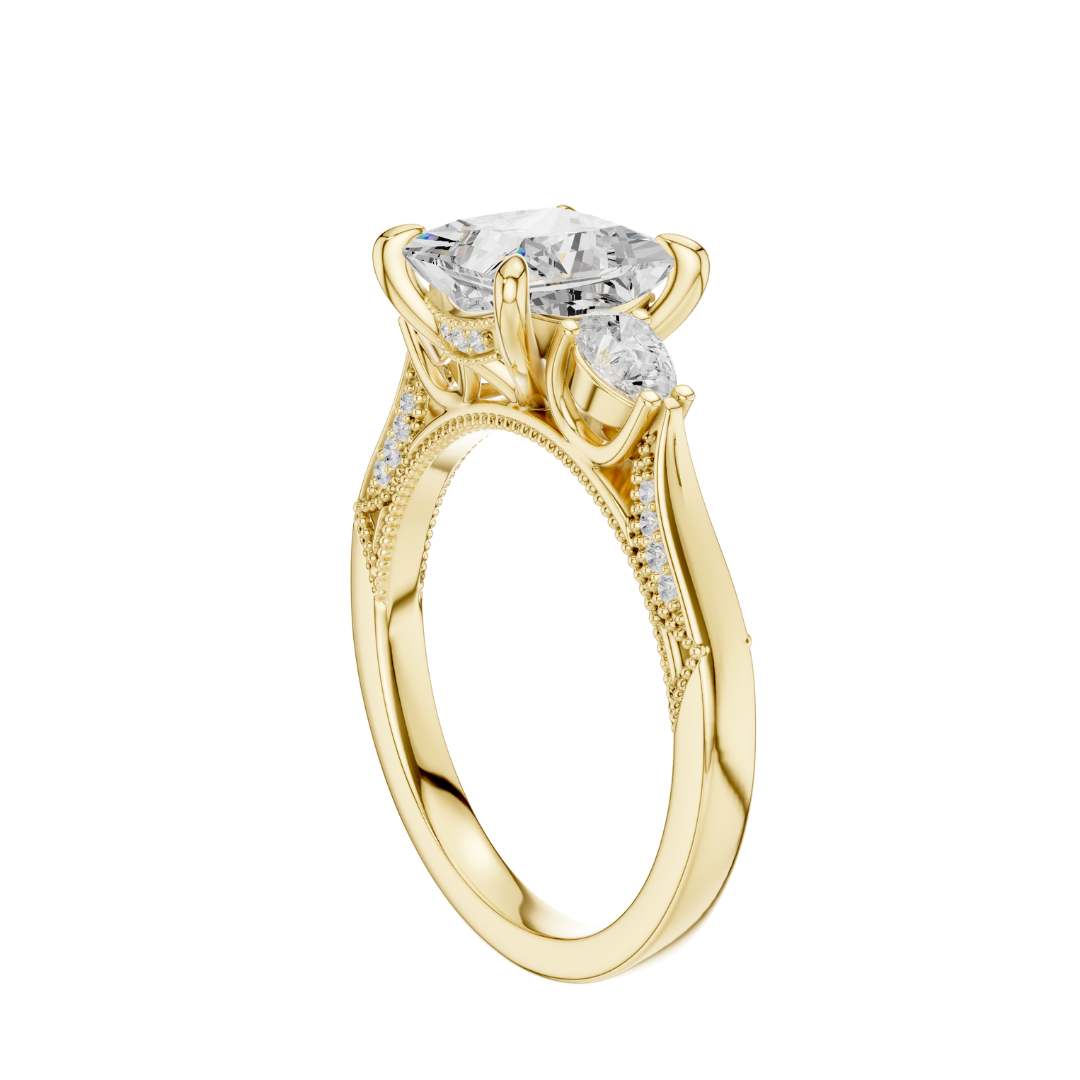 This exquisite ring showcases a radiant princess-cut center diamond flanked by two sparkling pear-shaped side stones, creating a beautifully balanced three-stone silhouette. Set in rich gold, the band features delicate pave diamond accents that add extra brilliance and refined detail. Blending modern geometry with timeless elegance, this ring is a striking symbol of love, commitment, and sophisticated style.