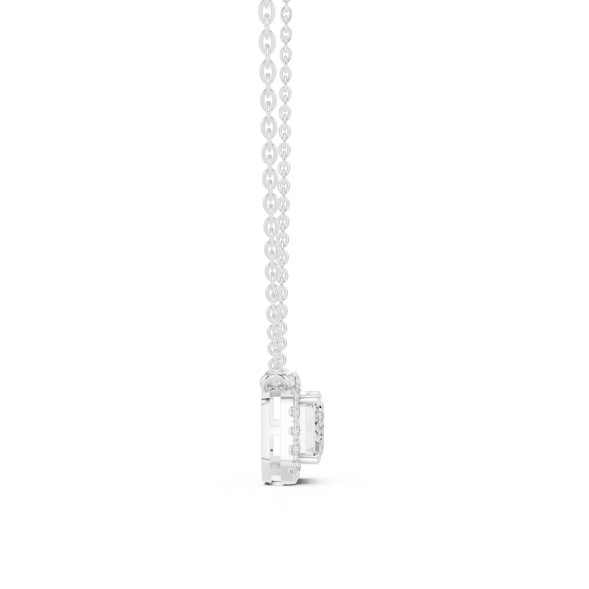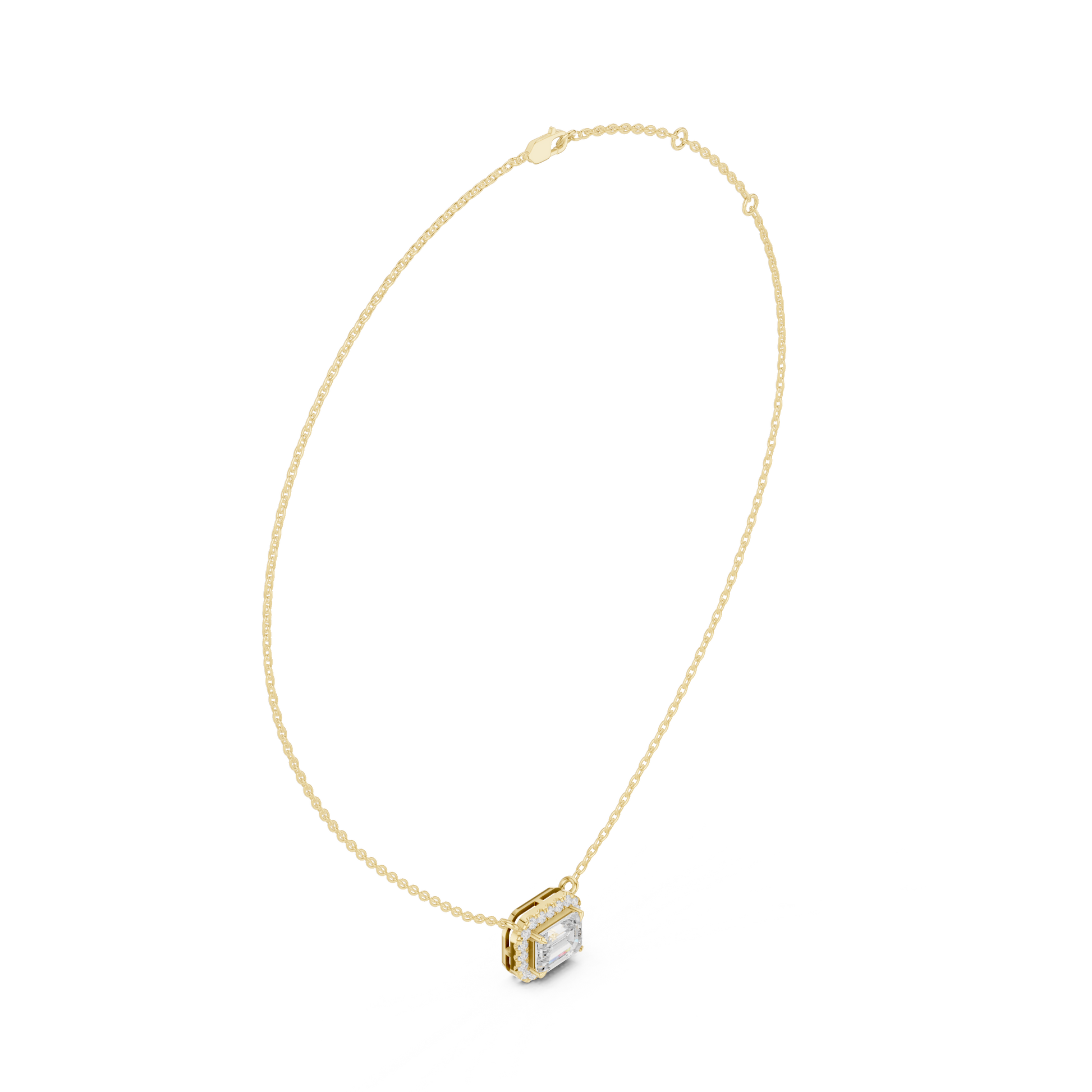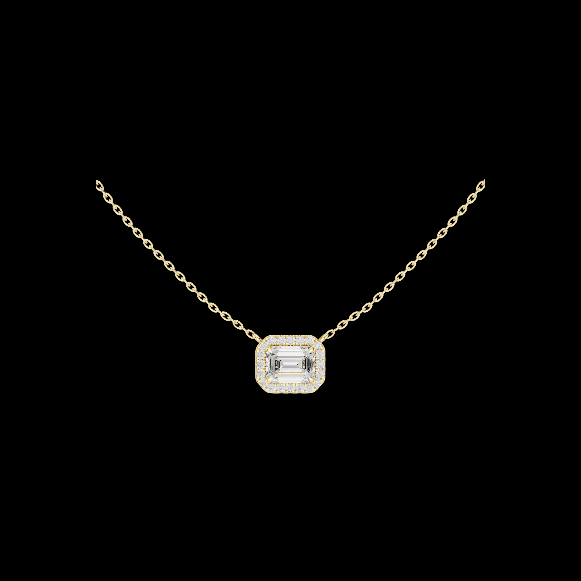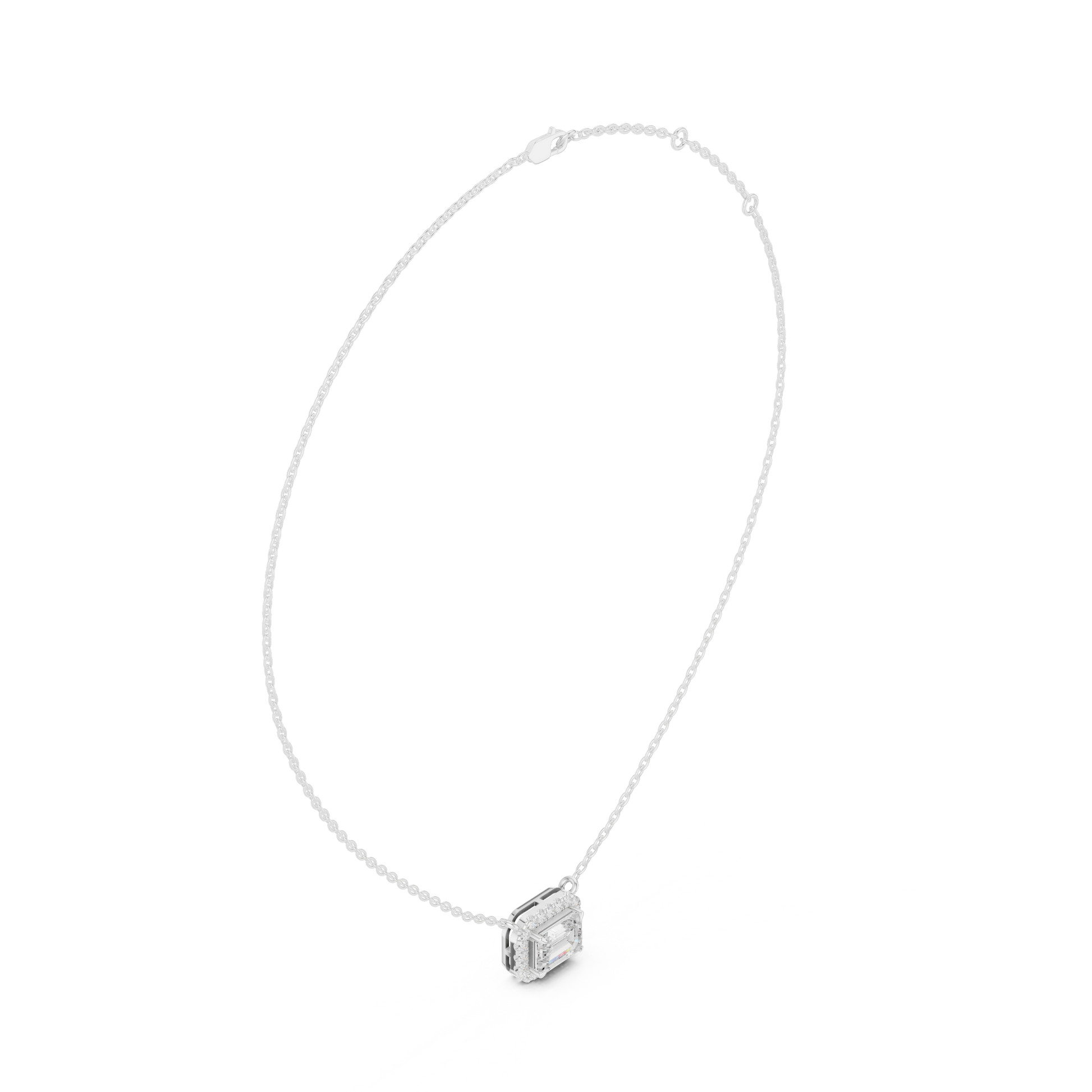 This refined emerald-cut diamond halo pendant showcases timeless elegance with a modern edge. the center emerald-cut diamond is framed by a shimmering halo of brilliant diamonds, enhancing depth, fire, and brilliance. The clean geometry and balanced proportions make it effortlessly elegant for everyday wear or special occasions.