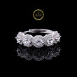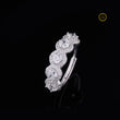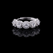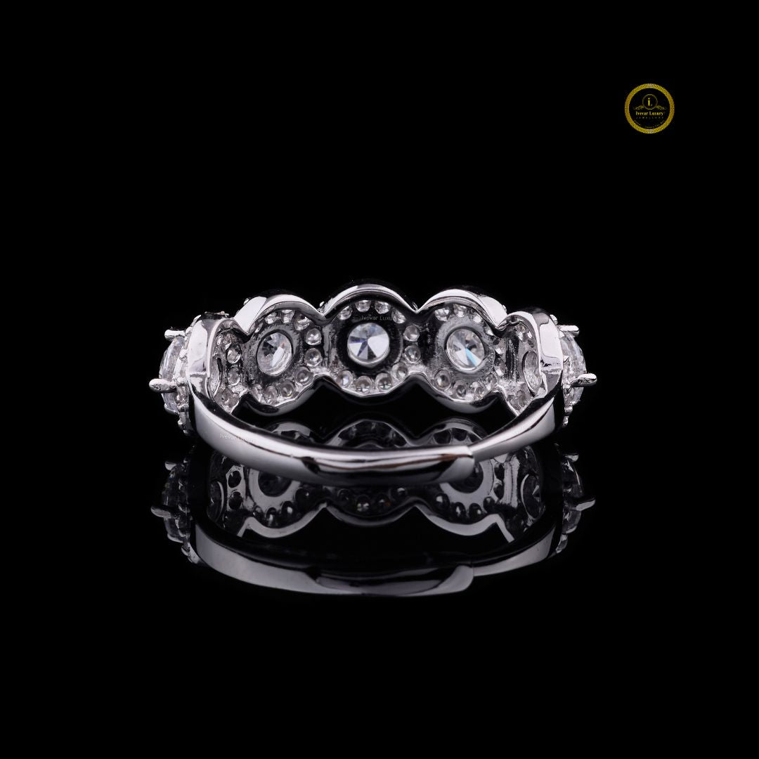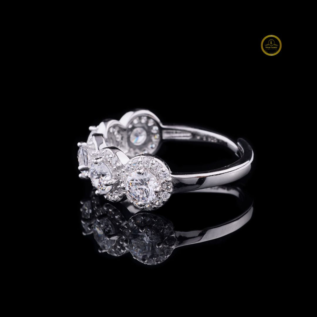 This dazzling ring features five radiant round-cut diamonds, each encircled by a shimmering halo of micro-pavé stones that enhance their brilliance. Set on a sleek white-gold band, the design creates a luxurious, high-sparkle profile that captures light from every angle. Perfect for marking life’s special moments, this piece exudes timeless elegance, refined craftsmanship, and exceptional luster.