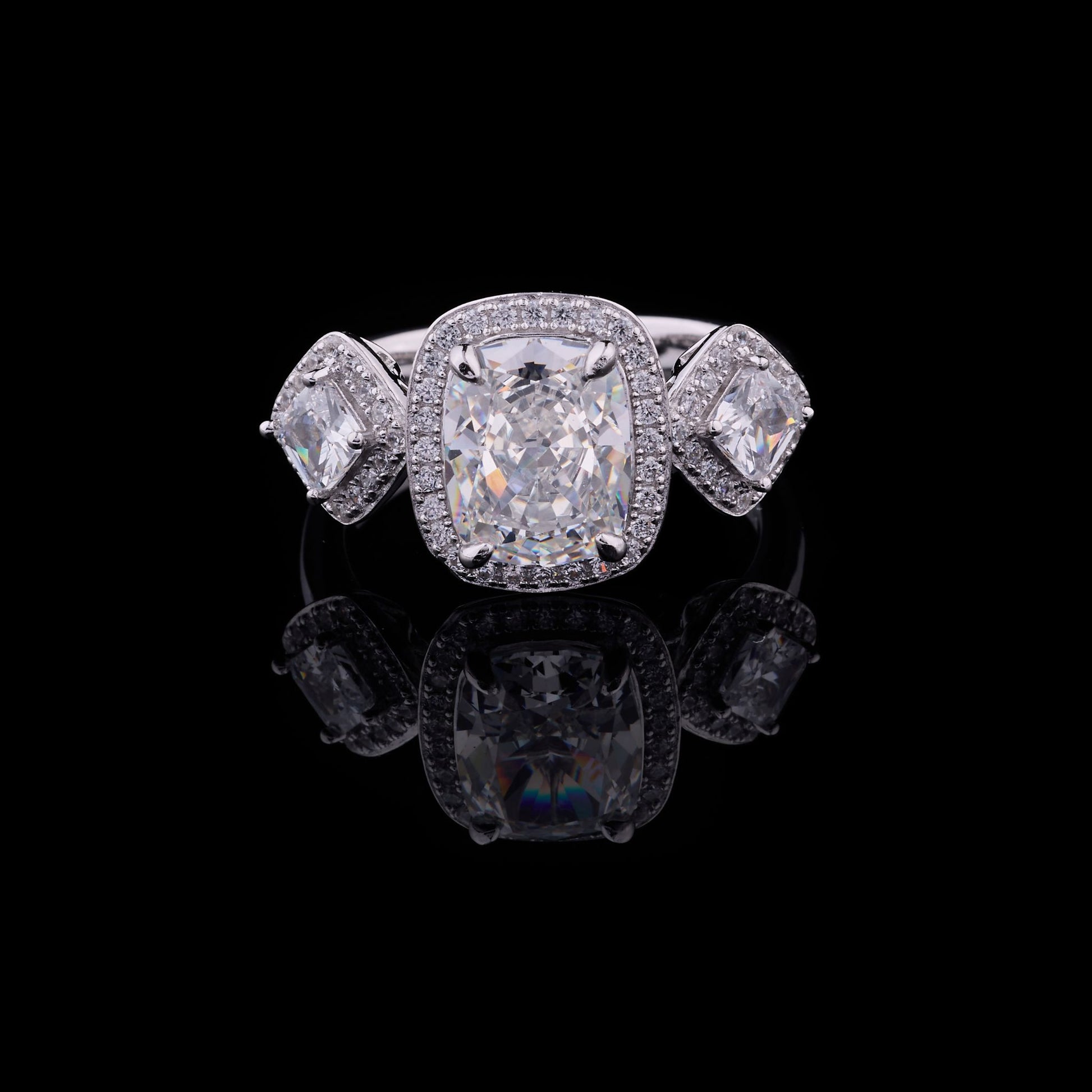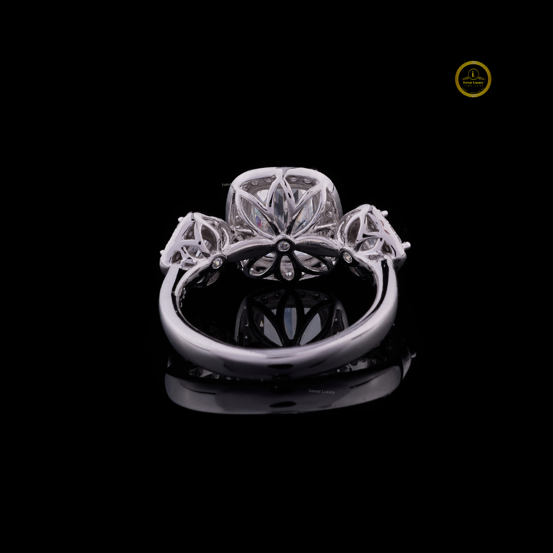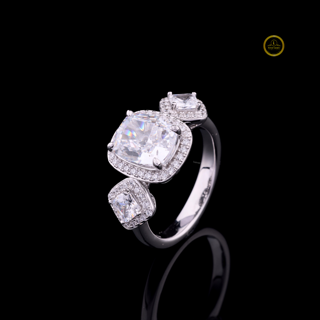 A masterpiece of luxury and refinement, this three-stone engagement ring showcases a brilliant cushion-cut diamond at its center, encircled by a halo of micro-pavé diamonds that enhance its fire and brilliance. On each side, two perfectly matched trapezoid-cut diamonds add dimension and balance to the design. The ring is meticulously crafted in high-polish white gold or platinum, offering both durability and an elegant sheen. Ideal for those who appreciate timeless elegance, modern craftsmanship, and radiant beauty, this ring is a symbol of everlasting love and sophistication.