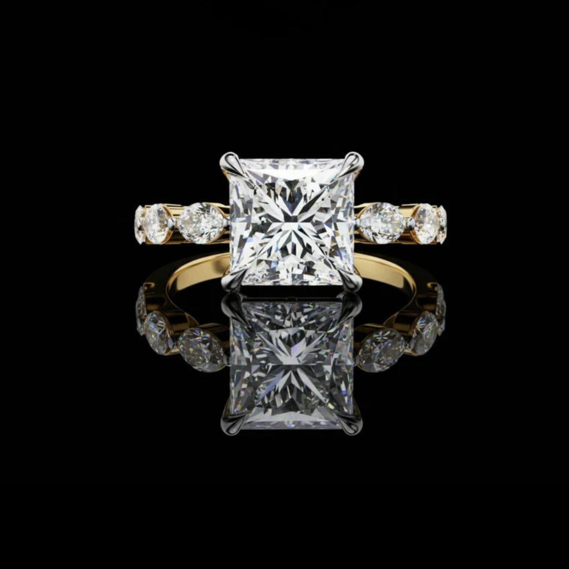 This elegant ring features a striking princess-cut center diamond set in a sleek four-prong mount, its crisp facets reflecting brilliantly against the black background. The band, crafted in warm gold, is adorned with a series of marquise cut diamonds that add extra sparkle and balance to the bold central stone. Its refined contrast of metals and gemstones creates a luxurious, modern look that highlights both sophistication and timeless glamour.