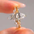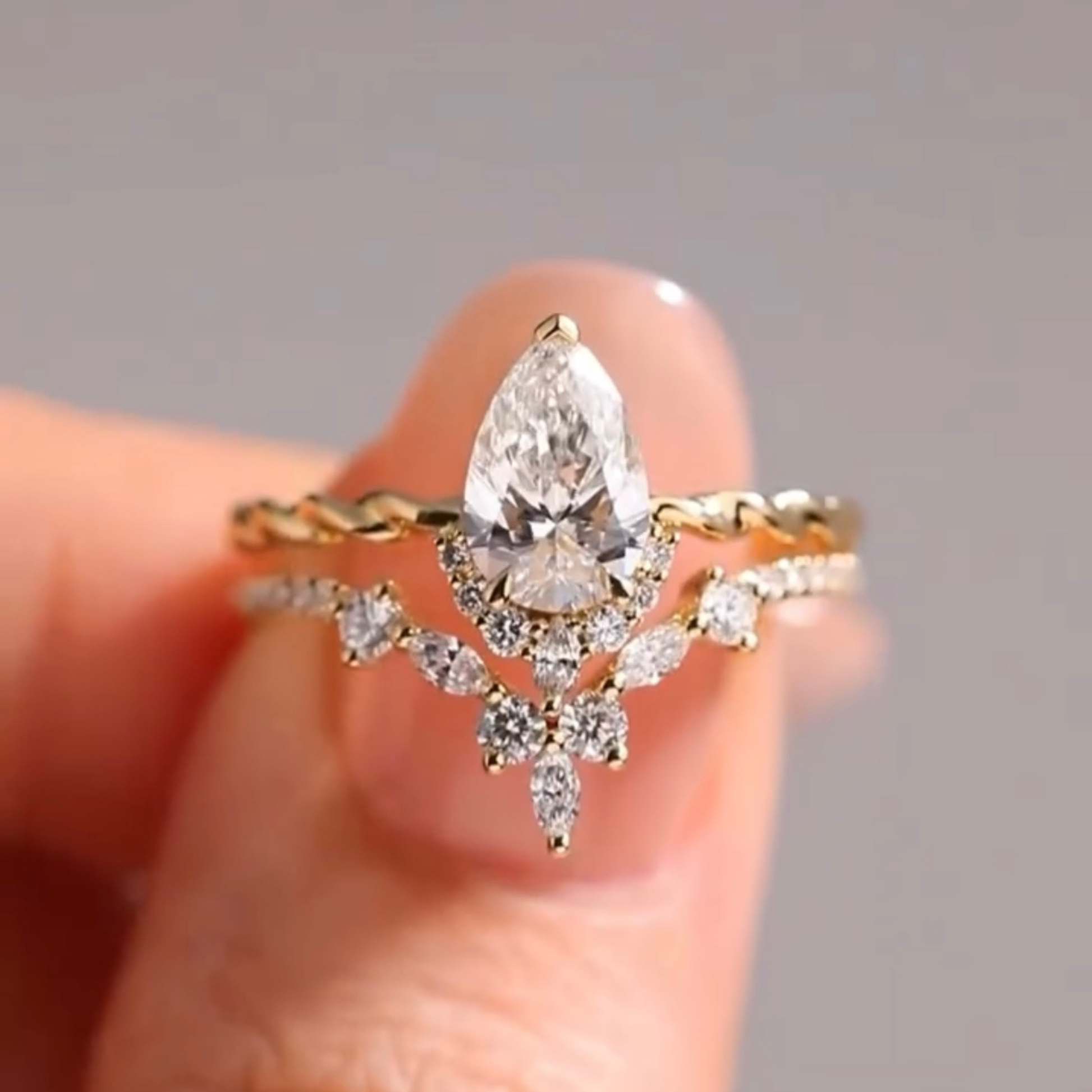 At Ivevar Luxury, every design is created to celebrate elegance, romance, and fine craftsmanship. This exquisite ring set features a pear-shaped center stone embraced by a delicate floral halo, paired with a perfectly contoured enhancer band that adds brilliance and harmony. The twisted gold shank enhances the design with graceful movement, while shimmering accent stones bring sparkle from every angle.