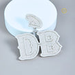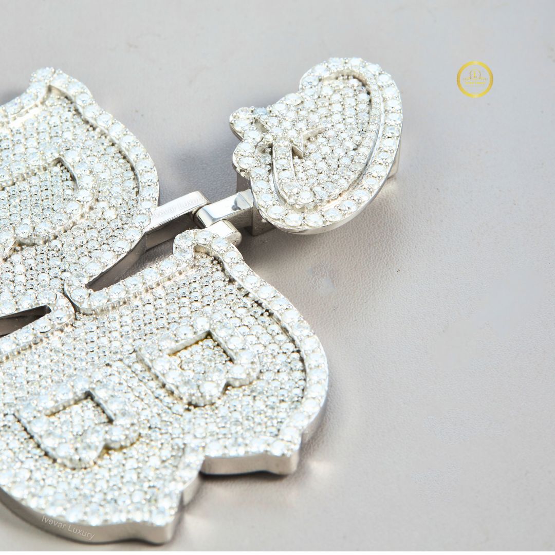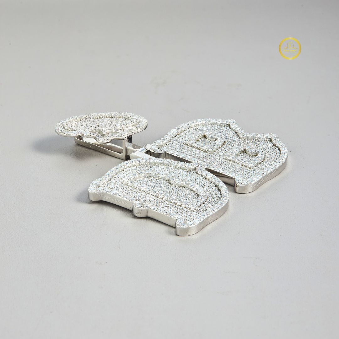 The design is bold, with the two prominent initials crafted in a classic, slightly ornate font. They are fully paved with brilliant Moissanite diamonds, giving the piece maximum flash and shine. The 'D' uses large, round-cut stones, while the 'B' appears to use slightly smaller or more densely packed round stones. A smaller, ornate piece, also paved with stones, is attached above the main initials, possibly representing a logo or a third initial. This pendant is a substantial, luxury statement piece designed for high visibility and personalized expression.