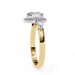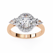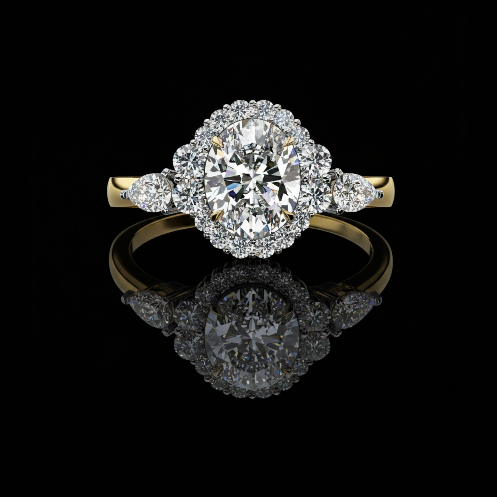 This stunning engagement ring features a brilliant oval-cut center diamond surrounded by a radiant halo of smaller round diamonds that amplify its sparkle. On each side, pear-shaped accent stones add elegance and symmetry, seamlessly flowing into a sleek gold band. The combination of shapes and metals creates a luxurious, timeless, and eye-catching design perfect for someone who loves classic beauty with a modern twist.