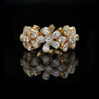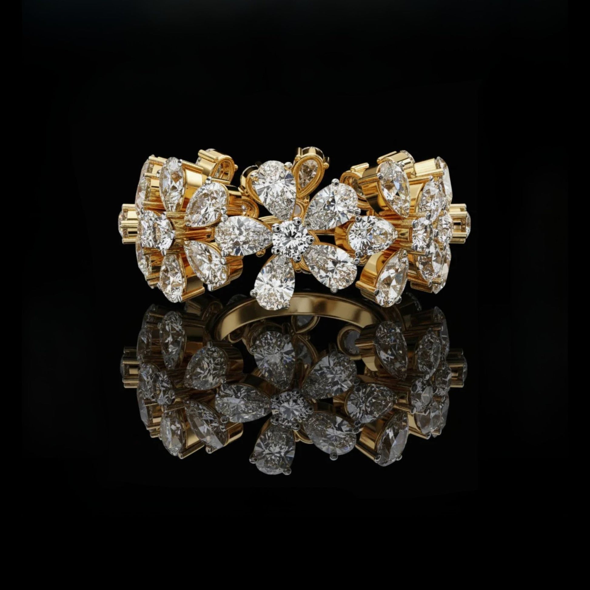 A stunning gold ring featuring an intricate floral design, crafted with clusters of Pear and round brilliant-cut diamonds arranged like blooming petals. Its reflective surface and meticulous detailing create an elegant, high-luxury aesthetic perfect for special occasions and fine jewelry collections.