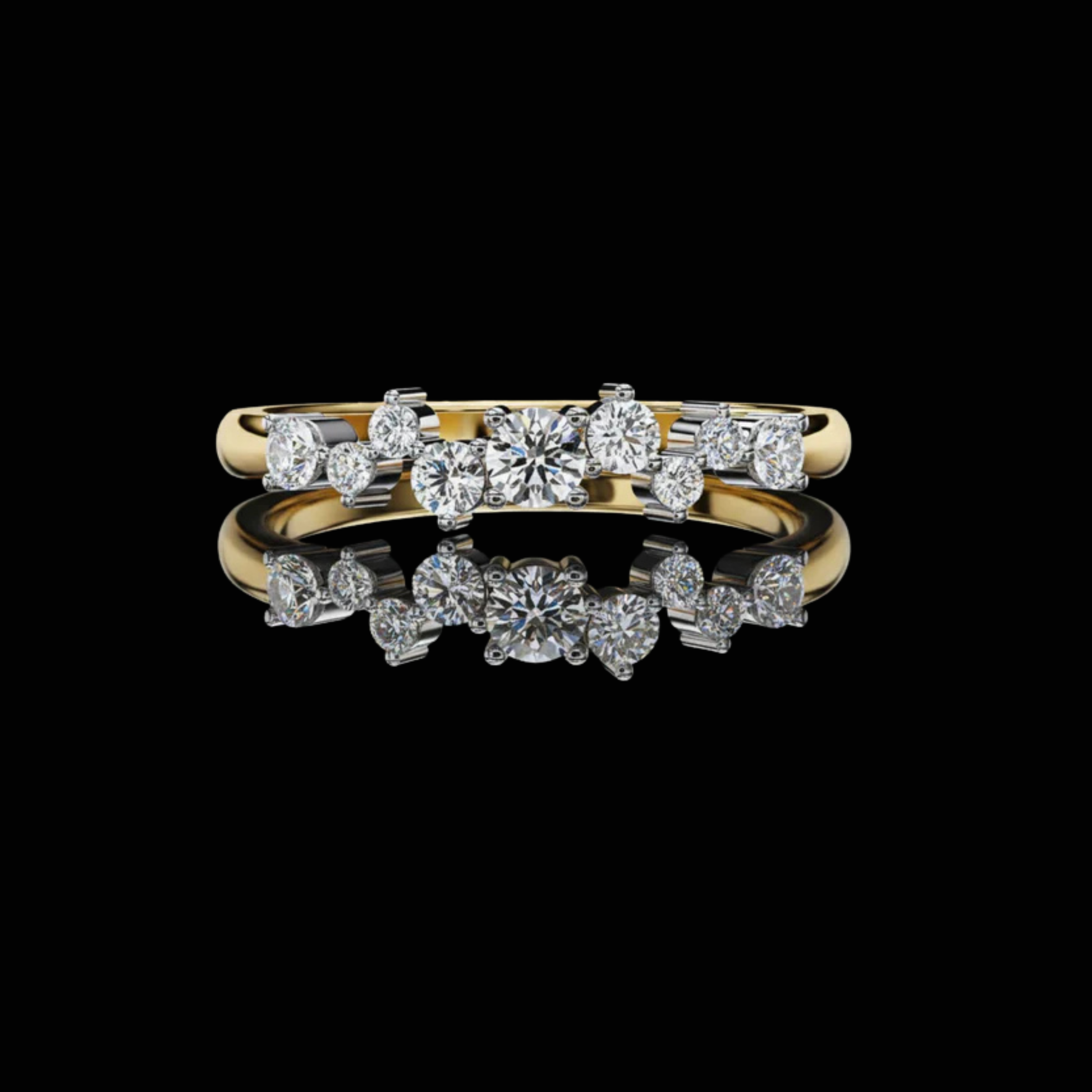 This elegant ring features a scattered cluster of round brilliant diamonds, artfully arranged to create a shimmering, organic sparkle across the gold band. Each diamond is delicately prong-set, enhancing its brilliance while giving the piece a modern, airy aesthetic. Perfect for those who appreciate unique design, subtle luxury, and a touch of contemporary elegance.